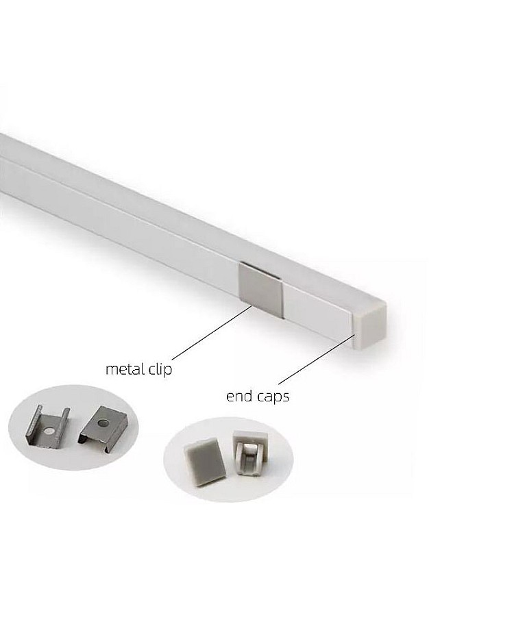 The super-slim light profiles are ideal for discreet, low-profile lighting solutions in kitchens, cabinets, shelves, wardrobes, and other tight spaces. They are designed for surface mounting and provide a clean, modern lighting finish without visible parts. The slim LED channels are crafted from high-quality anodized aluminum to ensure efficient heat dissipation and protect the LED strip lights while delivering a smooth, diffused glow. Their minimalist design blends seamlessly into modern interior designs, making it a perfect fit for both residential and commercial projects. The inner width is 5.5 mm, allowing a maximum width of 5 mm for strip lights. We recommend installing high-density COB LED strips as the light source, which results in uniform illumination with no visible light spots or dark areas. The standard lengths are 1 m and 2 m, and they can be cut to any size for your project. End caps and metal clips are included to allow the surface-mounted installation. Only PC frosted diffusers are available, made of brand-stable material, anti-yellowing, with perfect light distribution, and for soft, dot-free light output.