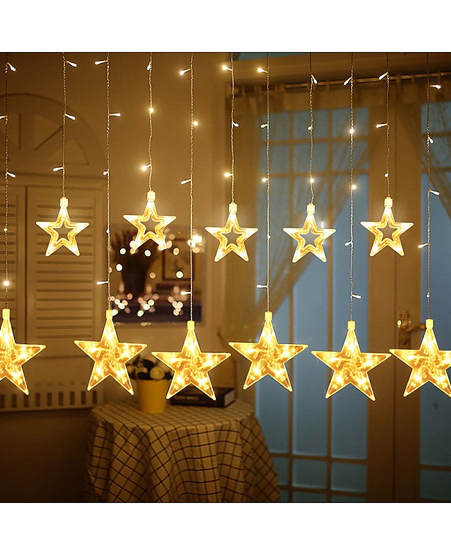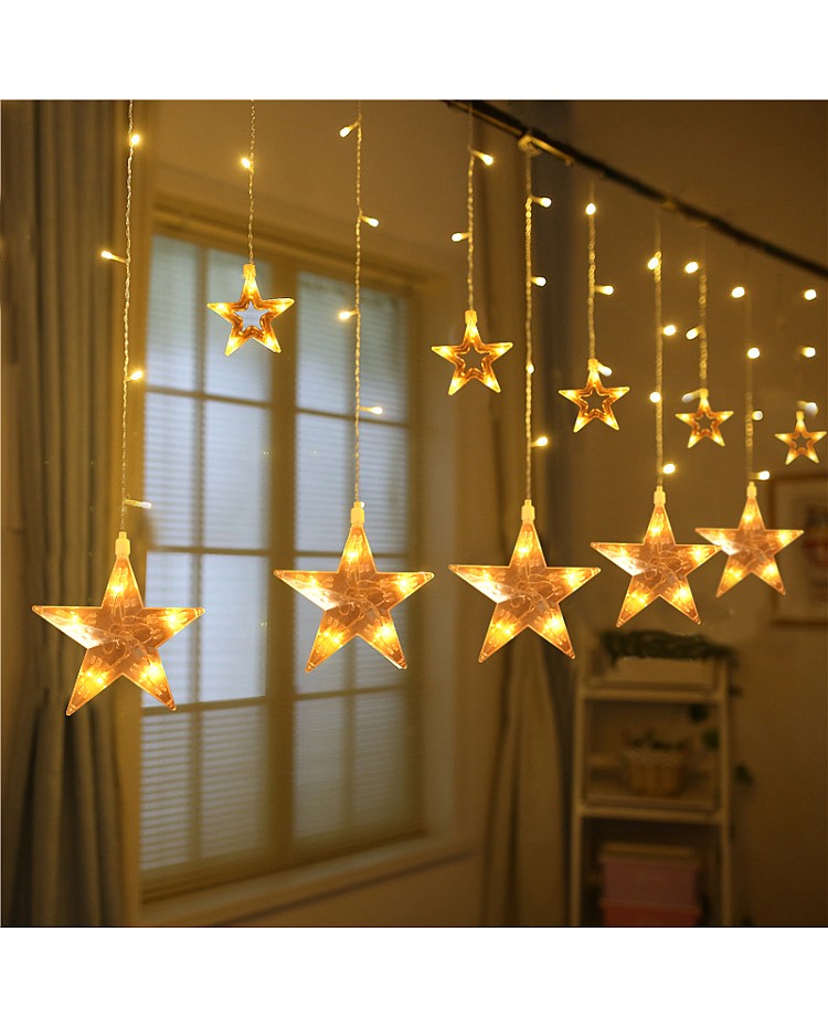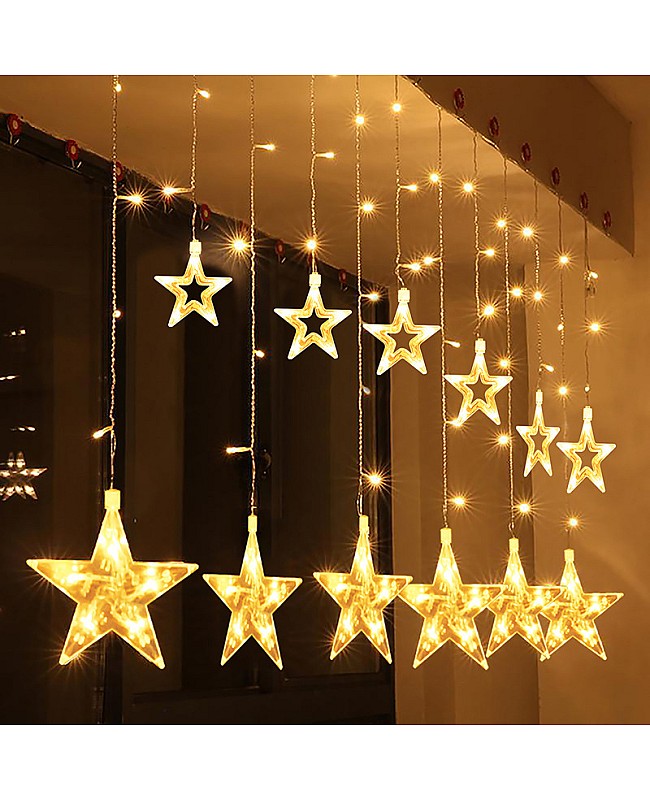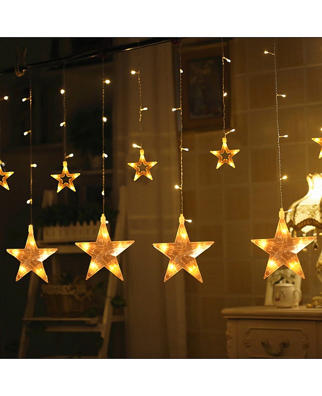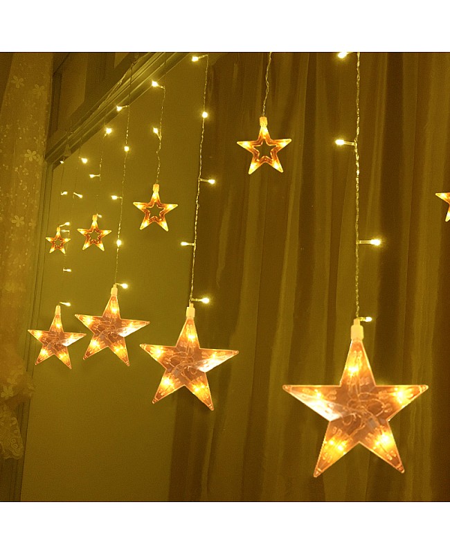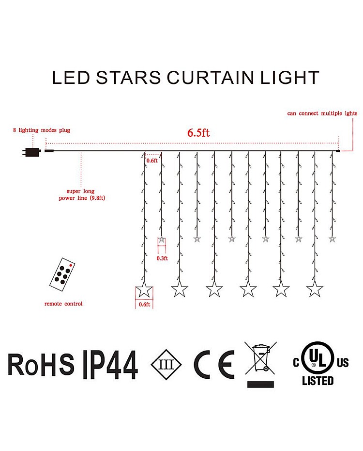 The big star 220V LED curtain light uses 108PCS high-quality F5 LEDs as the light source, the whole LED curtain light with 6PCS big stars and 6PCS small stars shape shell, totally has 12 drops, the length of 1, 3, 5, 7, 9, 11 drops is 1M, the size of the star is 15cm. The length of 2, 4, 6, 8, 10, 12 drops is 0.6m, and the size of the small star is 10cm. Each star has 5PCS LEDs; the whole kit can be directly connected to your home power system. It supports working voltages from AC110V to AC220V, and the output voltage is only 3V, which is safe for kids and pets. The emitting color is warm white, you can use it in the bedroom, restaurant, hotel, or shop. The controller has 8 lighting modes, and you can easily change the style.