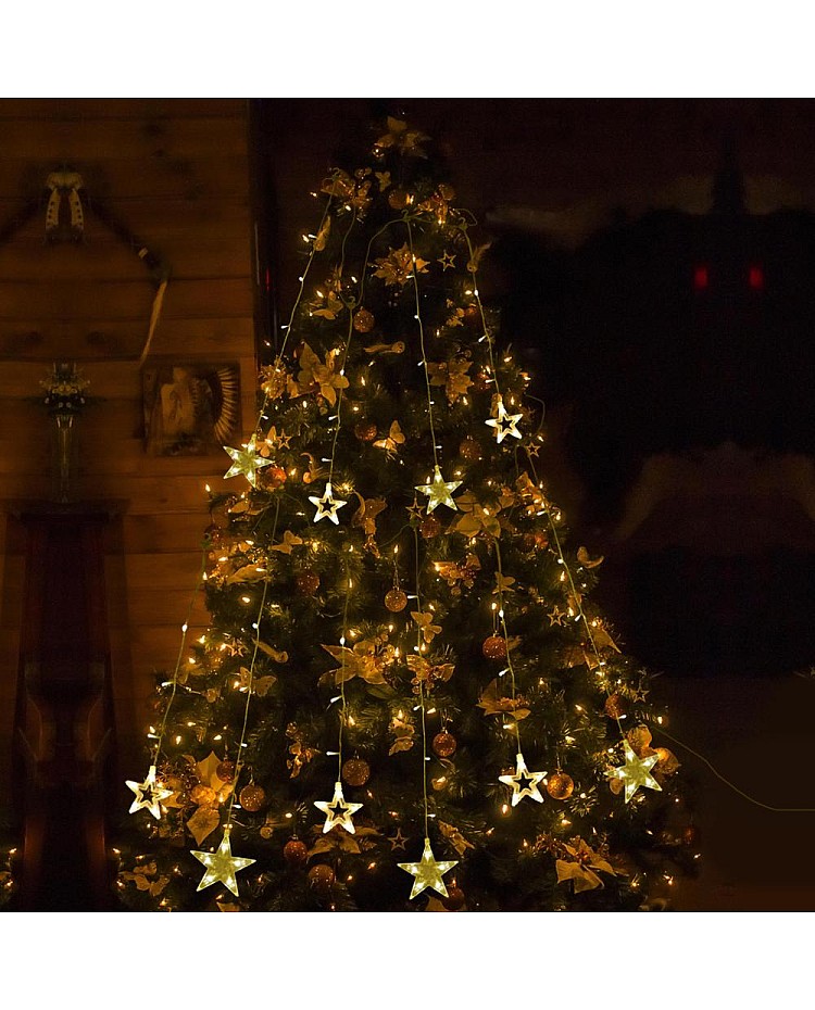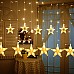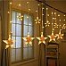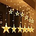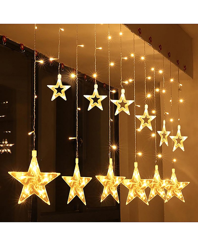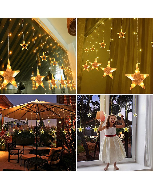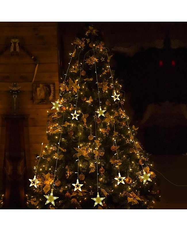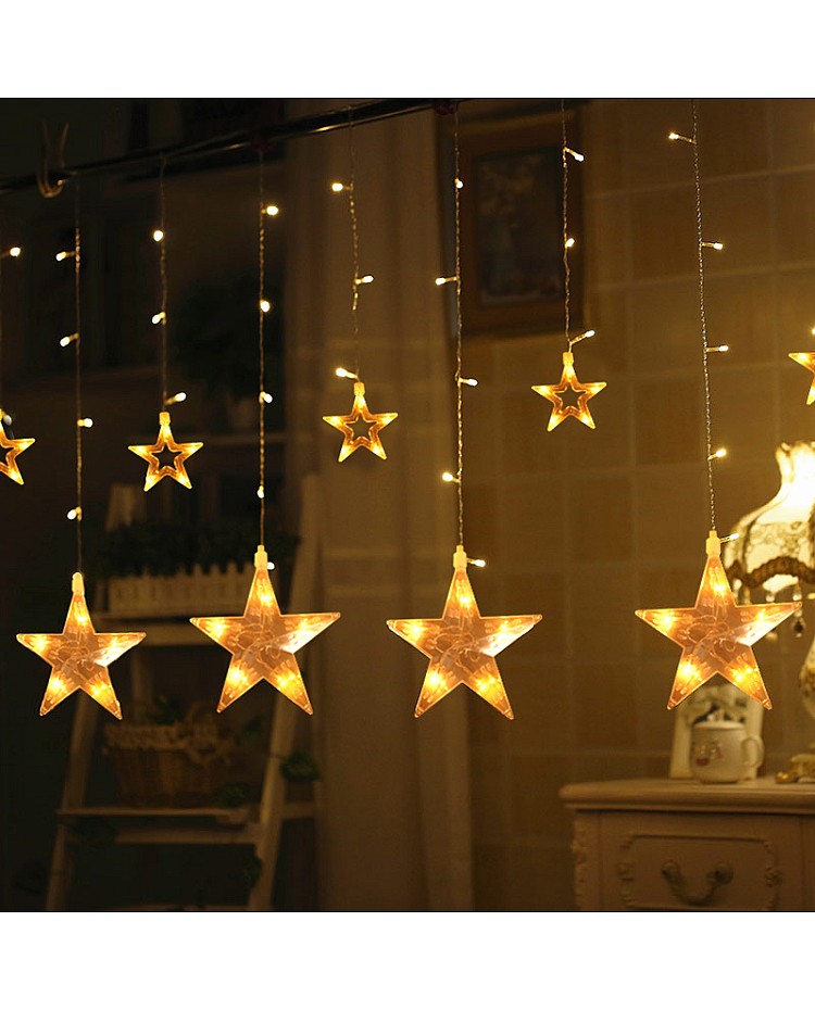 The big star 220V LED curtain light uses 108PCS high-quality F5 LEDs as the light source, the whole LED curtain light with 6PCS big stars and 6PCS small stars shape shell, totally has 12 drops, the length of 1, 3, 5, 7, 9, 11 drops is 1M, the size of the star is 15cm. The length of 2, 4, 6, 8, 10, 12 drops is 0.6m, and the size of the small star is 10cm. Each star has 5PCS LEDs; the whole kit can be directly connected to your home power system. It supports working voltages from AC110V to AC220V, and the output voltage is only 3V, which is safe for kids and pets. The emitting color is warm white, you can use it in the bedroom, restaurant, hotel, or shop. The controller has 8 lighting modes, and you can easily change the style.