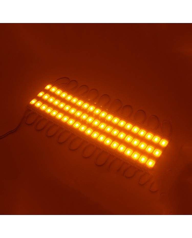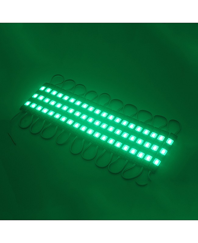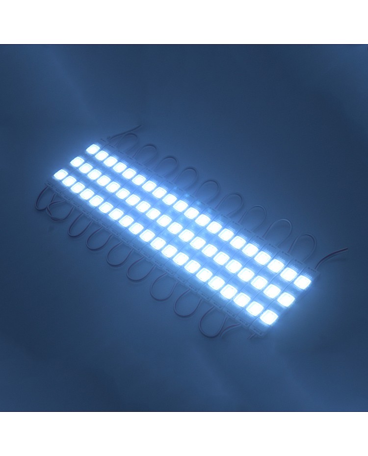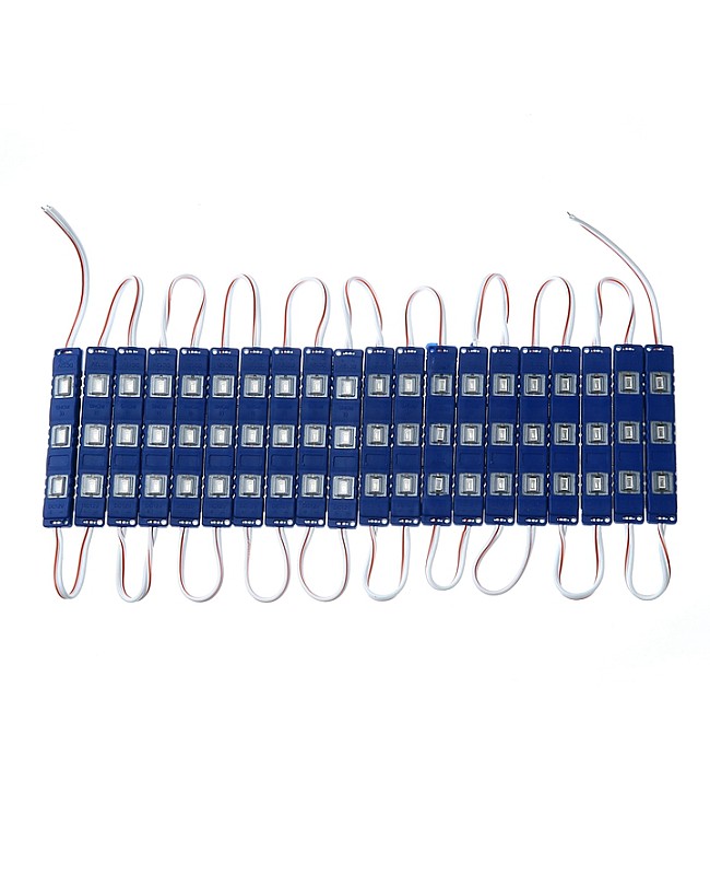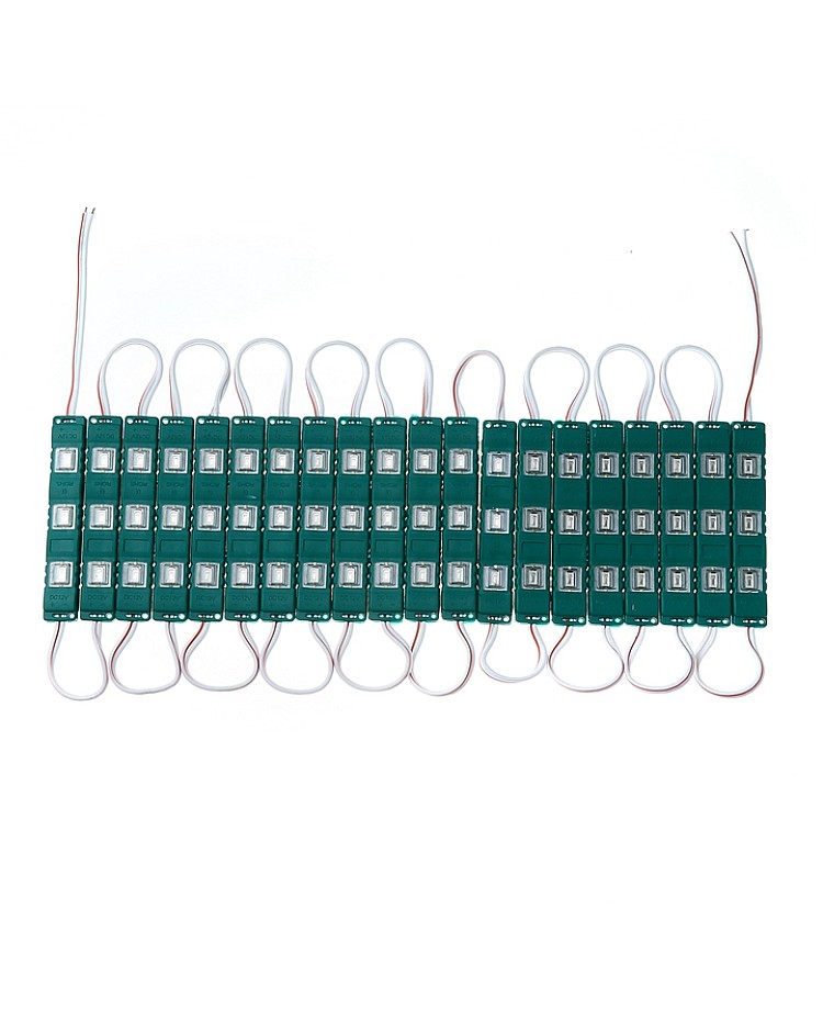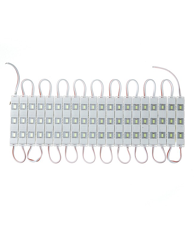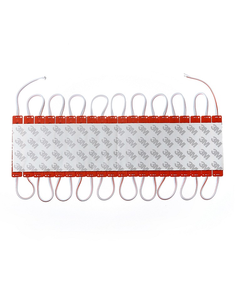 The 12V LED modules have 20 pieces per string, are cuttable, and reconnectable. You can cut any quantity and reconnect them for your lighting projects. The 12VDC LED modules use 3PCS high-quality and super bright 5730 SMD LEDs as the light source, and the LEDs are mounted on a high-quality aluminum board for better heat dissipation. The shell is made of ABS material, and with a molding injection process, the surface features an optical lens for wide-angle lighting. The IP rating is IP65 and can be used for indoor and outdoor lighting projects. The back has double-sided adhesive tape; remove the protector on the tape, and you can stick it to your desired place. The waterproof LED modules working on 12VDC can connect to the DC adapters to light up or connect to the LED module dimmer to adjust the brightness. You can use it as the backlight for advertisement signs, billboards, channel letters, holiday decorations, etc.