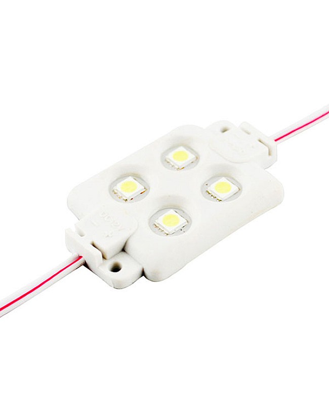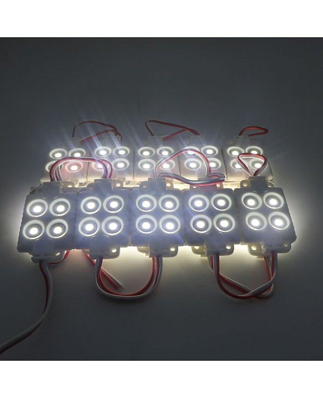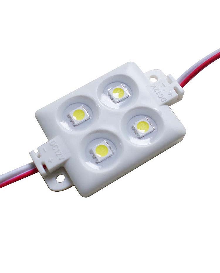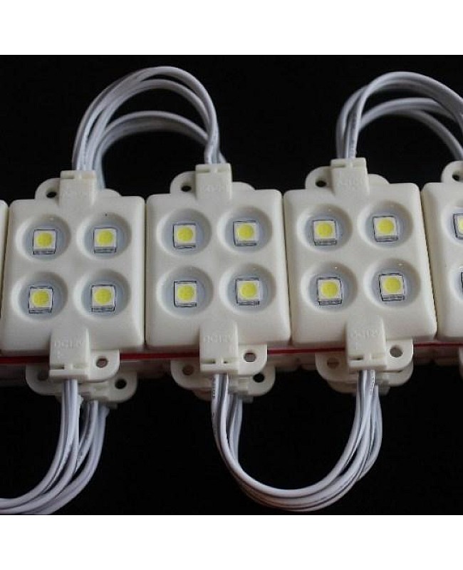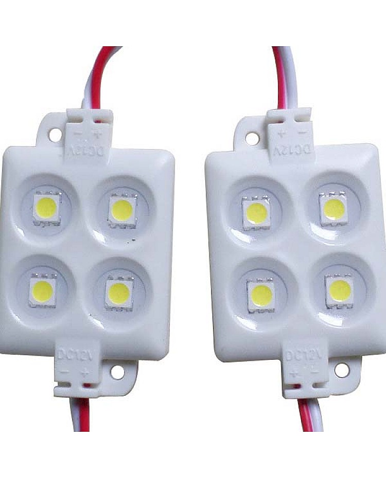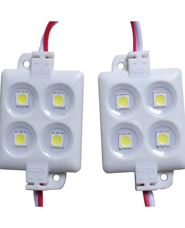 The 5050 LED Modules use 4PCS high-quality and super-bright SMD LEDs as the light source. The LEDs are mounted on the aluminum board for better heat dissipation, with a fireproof ABS shell and epoxy sealed. The IP rating reaches IP65 for indoor and outdoor applications. The back has double side adhesive tape and both sides with screw holes, take off the protector on the tape and stick on the place you want to install, or use the screws to fix them on the project. The 5050 LED modules, which have 20 pieces per string, are cuttable and reconnectable, and can be cut to any quantity and reconnected for your project. Working in DC12V, easy to connect to the LED adaptor to light up or connect the LED dimming controller to adjust the brightness for single color or color-changing style for the RGB. You can use them as the backlight for signs, channel letters, billboards, interior light for cars, trucks, vans, etc.