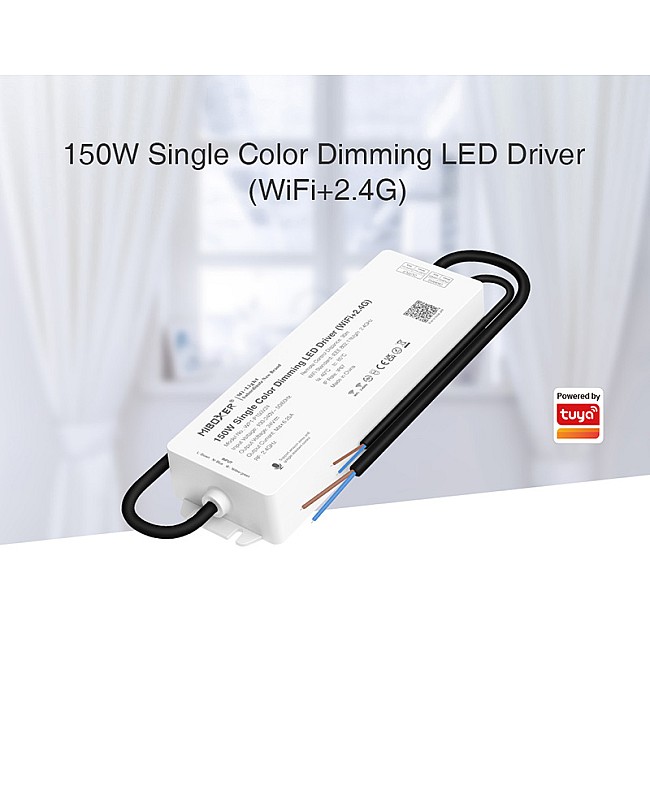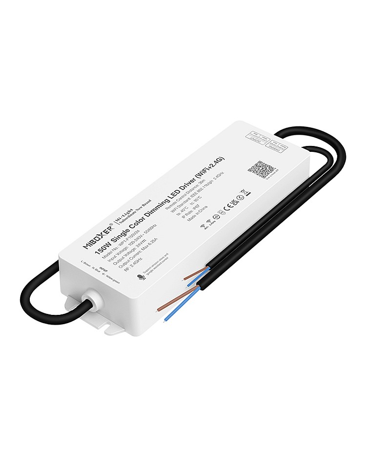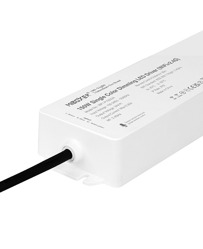 The 150W single-color dimming MiBoxer LED driver is an excellent choice for outdoor LED strip applications. With a single-channel output design, it is easy to connect to single-color LED strips and adjust the brightness for various scenes. The waterproof level is IP67, which allows for installing them in rainy or wet locations for outdoor lighting projects. It has a wide input voltage design, is easy to connect to the public power system directly, has one output channel design, and has a max output current of 6.25A and a max loading power of 150W. The dimming LED driver integrates WiFi and 2.4G communication modules and can be controlled by 2.4G RF remotes, a smartphone APP, and third-party voice commands. You can use it to control the brightness from 1% to 100% for various scenes. One dimming driver can transmit the signals from the remote control to another Driver within 30m. The remote control distance can be limitless if a dimming driver is within 30m. The MiBoxer dimming power supply can work with Amazon Alexa and Google Assistant, and you can use voice commands to turn ON/OFF and adjust brightness.