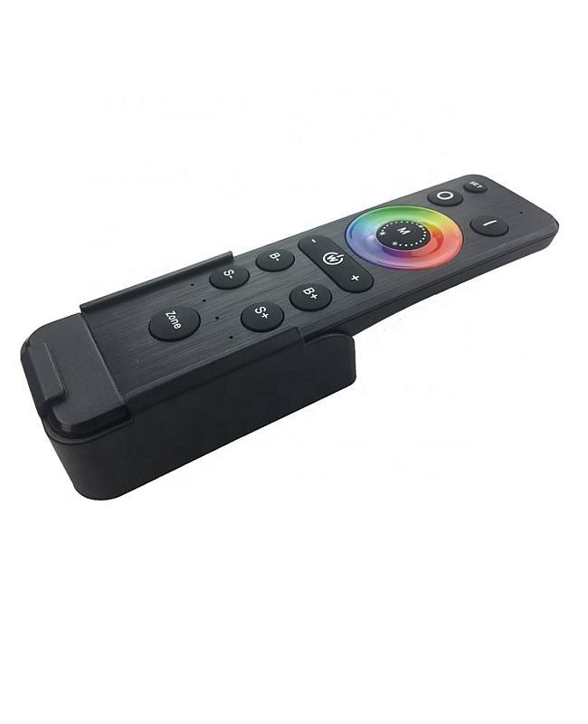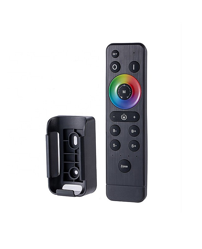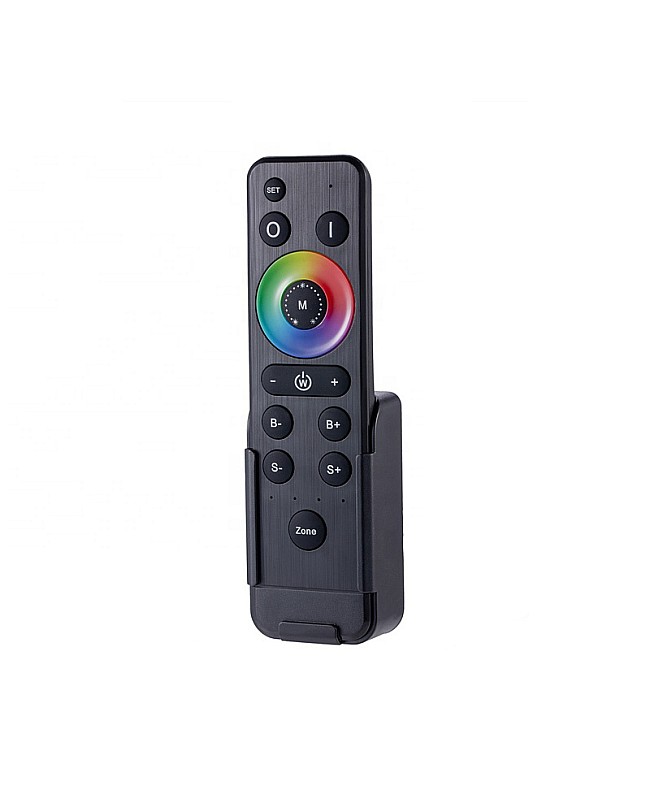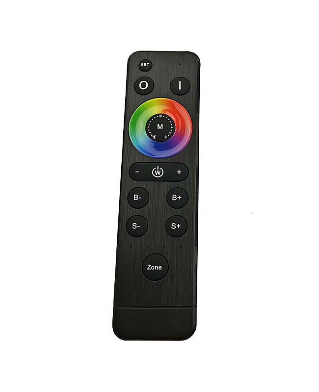 The RF LED Remote has 1 color ring and 12 buttons, works on DC3V, and is powered by 2 AAA batteries. It has a DIM/CCT/RGB/RGBW 4 In 1 function design and adopts the RF 2.4GHz multi-zone control module, you can use the remote to set 4 groups, each group includes many LED Controllers and control them synchronously. Can control the groups separately or together. You can touch the color ring to adjust the static color in step-less, 64 colors. You can use other buttons to change a color's brightness or the dynamic mode's speed. Long-press the zone button to control all LED Controllers together. Recommend works with our Sync RF RGBCW LED controllers.