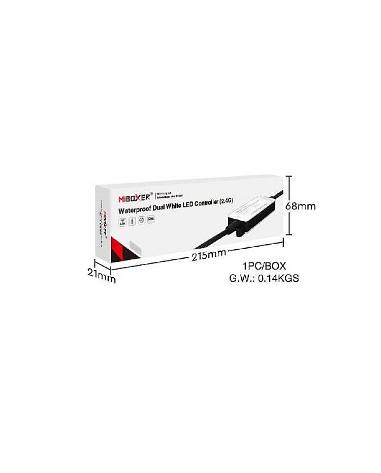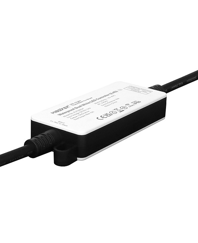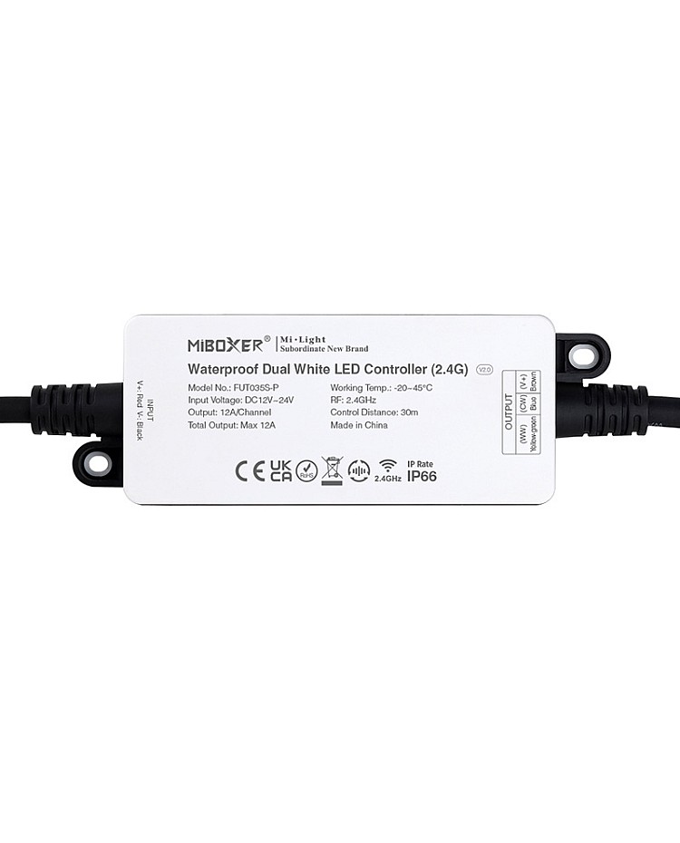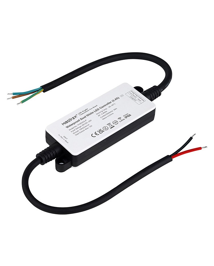 The dual white waterproof outdoor controller has a waterproof level of up to IP66 and can be used for outdoor dual white lighting projects. The working voltage is DC12V-24V, with dual output channels, and the maximum output current is 12A. The tunable white LED controller has an auto signal transmitting design; one controller can transmit the signals from the remote to another controller within 30m. The remote control distance can be limitless if a controller is within 30m. Compatible with 2.4G RF remote controls: FUT087, FUT007, FUT006, S1, B1, T1, B2, T2, K1, etc. You can use the remote to adjust the brightness from 1% to 100% steplessly and control the color temperature from 2700K to 6500K for various scenes. After adding a 2.4G gateway, the outdoor CCT controller supports smartphone APP Control and third-party voice control and can work with Amazon Alexa and Google Assistant. The working PWM frequency can be switched from high-frequency 8 KHz to low-frequency 500 Hz.