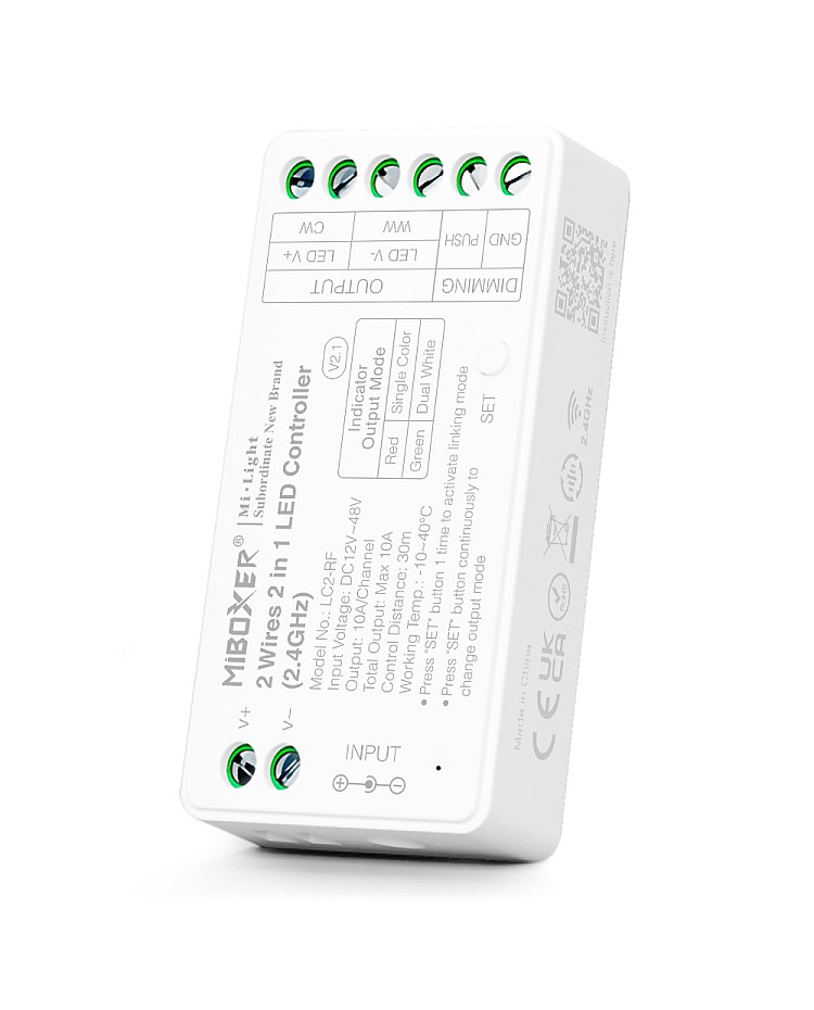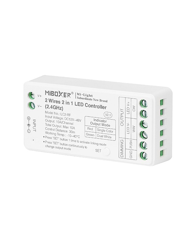 The MiBoxer LC2-RF LED strip light dimmers feature two output modes, designed for single-color and dual-white LED lights, and are especially compatible with 2-wire CCT COB strip lights. There is a single button on the dimmer, which you can press continuously to switch the output mode from single color to dual white. 2.4 G remote controls can control the MiBoxer light dimmer and support smartphone APP and third-party voice control after being connected to a 2.4G gateway. You can freely control the color temperature and brightness. The color temperature is adjustable from 2700K to 6500K, with stepless dimming brightness from 1% to 100%. The dimmer can work with Amazon Alexa and Google Assistant. You can use voice commands to turn the light on/OFF and adjust the light. The LC2 RF dimmer will receive the signal from the 2.4 GHz CCT remote control and transmit it to others within a 30-meter range, allowing all devices to work synchronously.