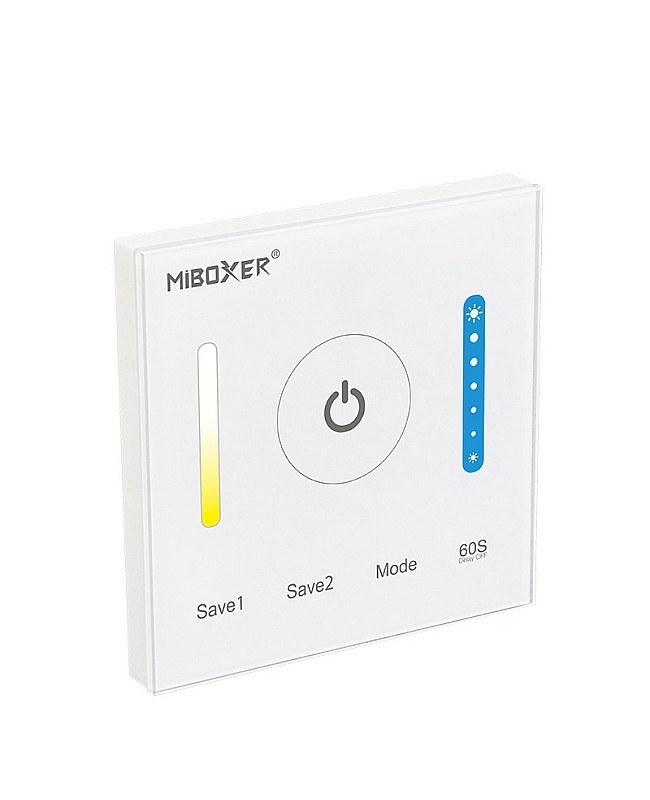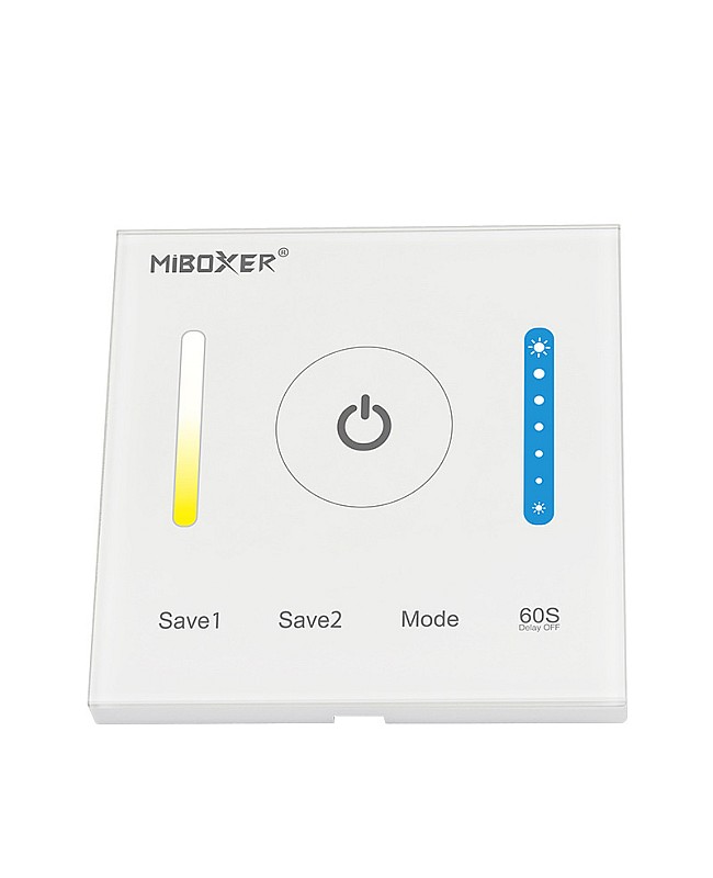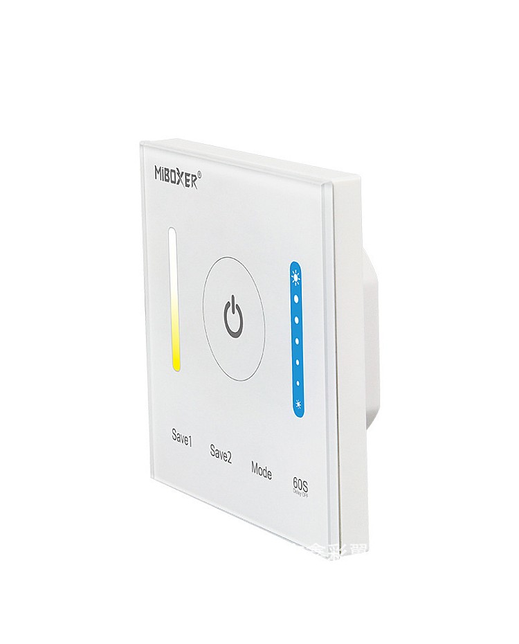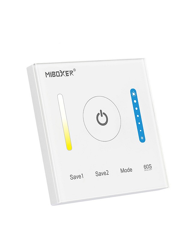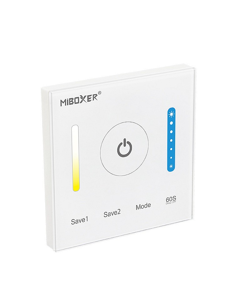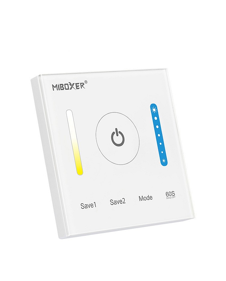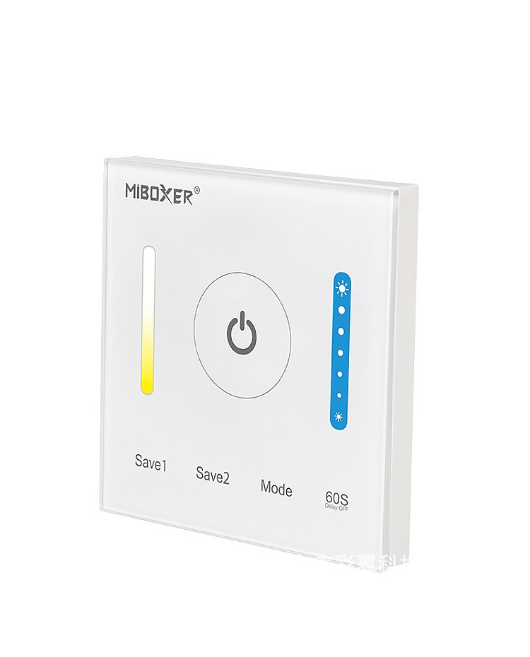 The MiBoxer P2 CCT adjustable LED panel controller has a sensitive touch panel design, which allows you to touch the panel to adjust the color temperature from 2700K to 6500K, and dim the brightness from 1% to 100%. You can touch the button "60S" to delay the LED light, which will be turned off automatically after 60 seconds. There are nine dynamic modes available, and you can touch the button"Mode" to switch the mode for various scenes. When the buttons are touched, the LED indicator light will flash with different sounds. The MiBoxer P2 adopts 2.4G RF transmission technology, compatible with MiBoxer RF remotes. You can adjust the LED light remotely after adding the 2.4G gateway WL-BOX1, a smartphone APP can control the LED light and third-party voice commands(Amazon Alexa and Google Assistant), and the Panel Controller will receive the signals and transmit them to other controllers within 30 meters. Different controllers will work synchronously. You can save the present CCT, brightness, and mode randomly and easily get the saved mode by touching the save 1 or save 2 buttons.