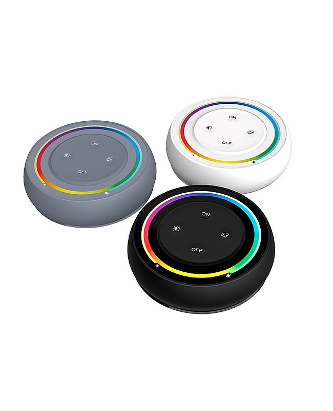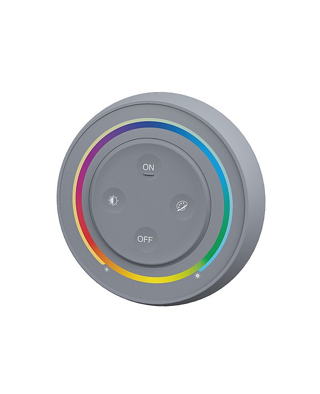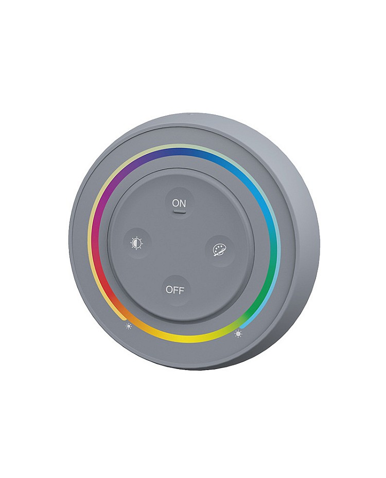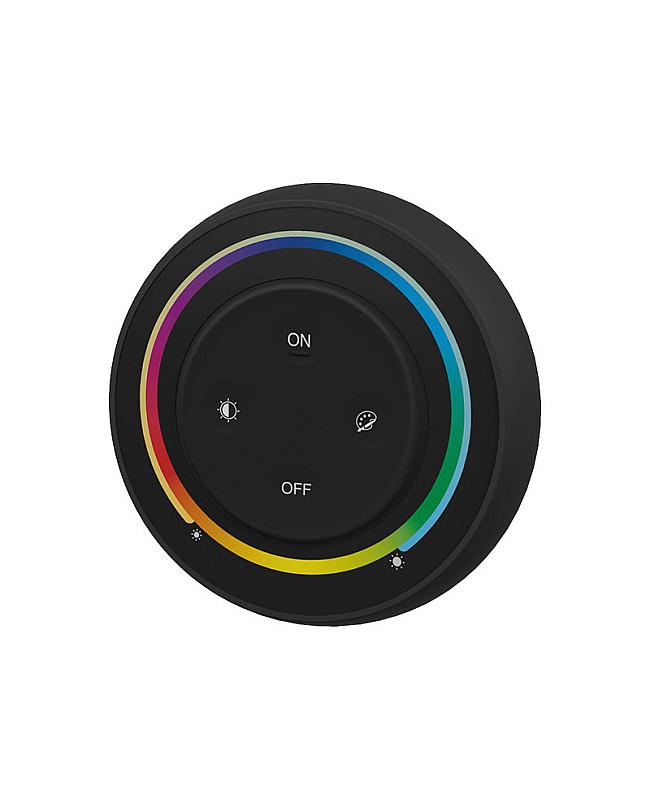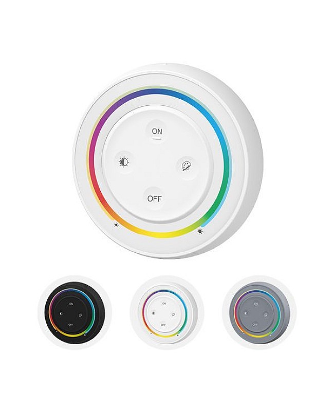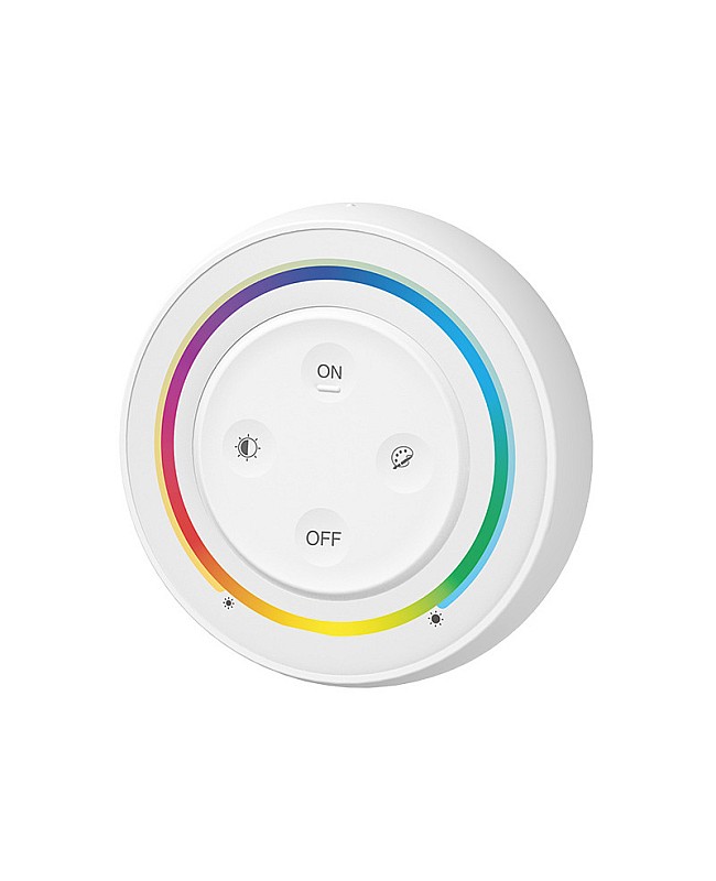 The MiBoxer S2 RGB CCT wireless light switch has an ergonomically round shape design and is available in three colors. It comes with a magnetic base holder for easy installation and a stronger magnetic holder for easy taking out and putting back. MiBoxer light switch is powered by 2 AAA batteries and is easy to install and replace. With four independent press buttons and an exact touch ring, you can press the buttons to turn on/off the LED light, set the color or color temperature, adjust the brightness or saturation, and touch the ring for dimming brightness/saturation RGB/Color Temp. Adopts 2.4G wireless transmitting technology, with a control distance of up to 30 meters. You can use it to control MiBoxer 2.4G wireless RGB/RGBWW products. The remote is non-waterproof and only suited for indoor applications.