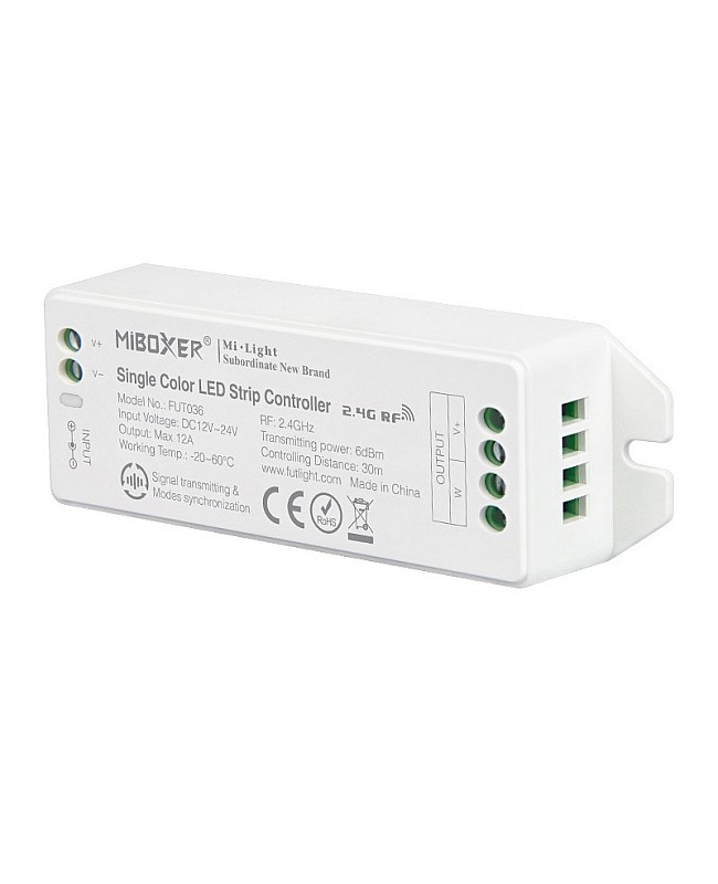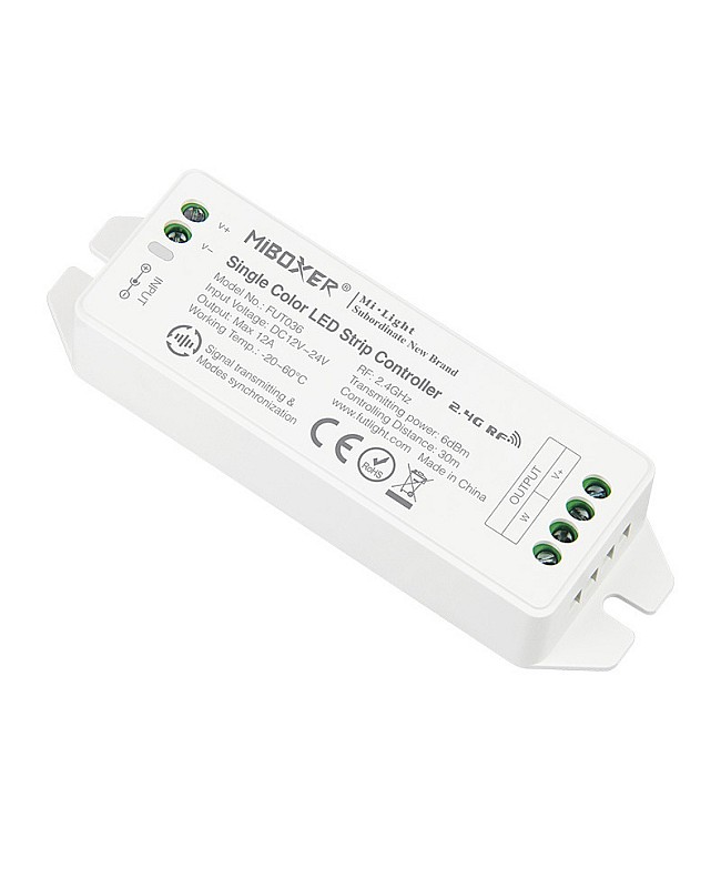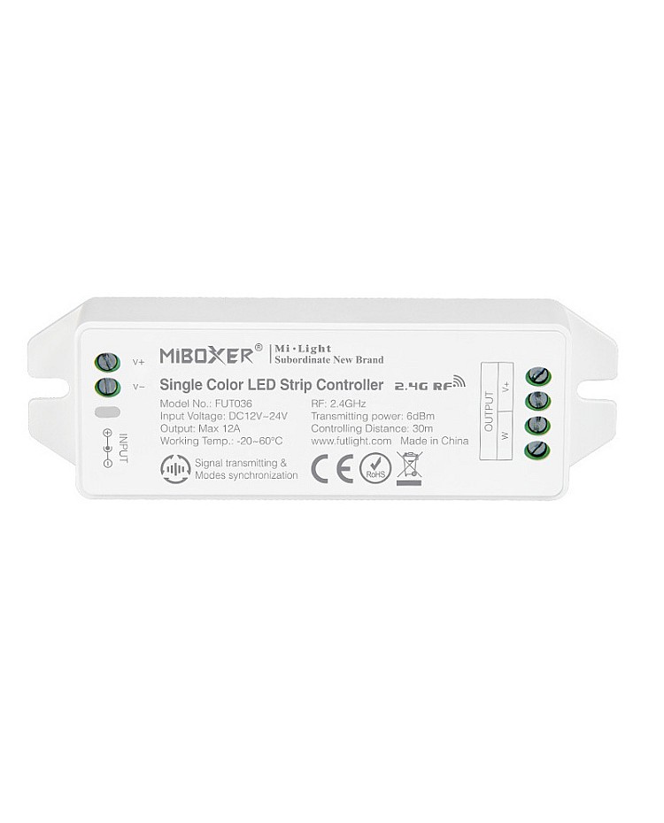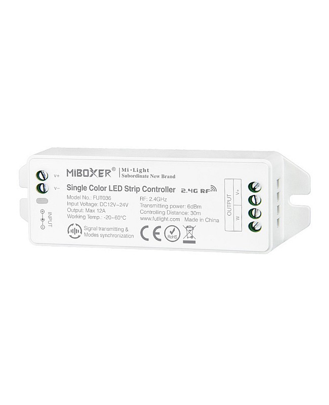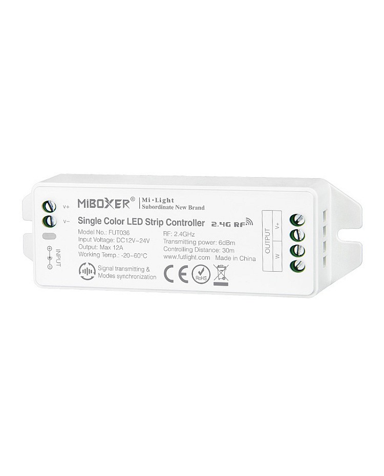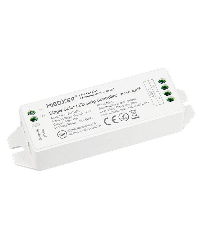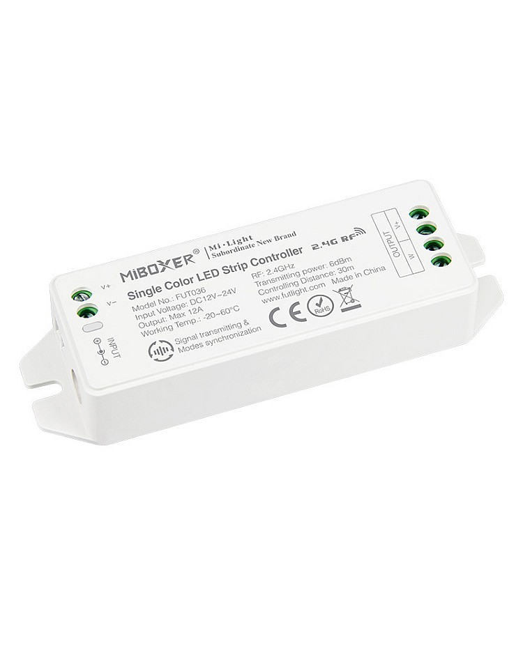 The MiBoxer FUT036 LED dimmer controller is designed for single-color LED strips. Working on DC12V and DC24V, and adopting 2.4G wireless signal transmission technology, with a control distance of up to 30 meters, is adopted. Compatible with Milight and MiBoxer single color remote controls, the MiBoxer LED dimmer will receive the signal from the remote control and transmit the signal to other same dimmers within 30 meters. You can use the remote controls to adjust the brightness from 1% to 100%. After adding the 2.4G gateway WL-Box1, you can use the smartphone APP and third-party voice to control the LED lights, which supports Amazon Alexa and Google Assistant.