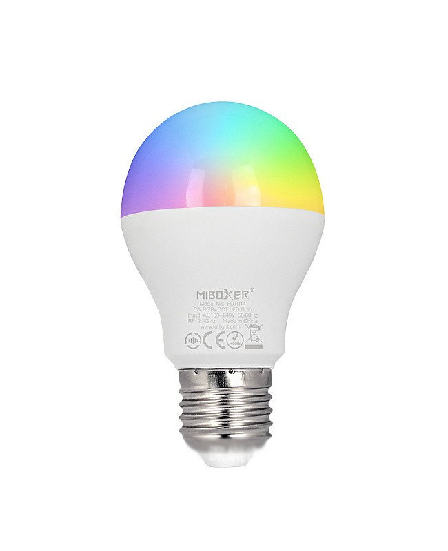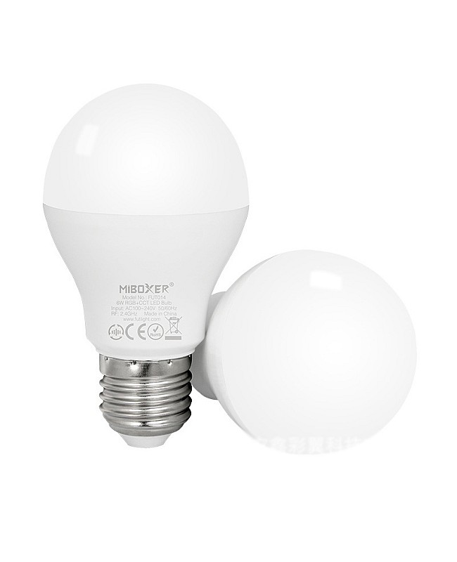 The MiBoxer FUT014 6W RGB CCT color changing light bulb with E27 Base uses high-quality Taiwan LED chips as a light source and a built-in professional LED driver for a long lifespan with no flickering. The surface is an efficient light transmittance acrylic lens for smoother and even light. You can use them to replace the traditional E27 lamps directly, with an aluminum body for better heat dissipation. The FUT014 adopts 2.4G RF Wireless transmission technology, compatible with MiBoxer RGBWW remote controls, and you can use the remote to set color and adjust the saturation. There are 16 million colors available. the color temperature is adjustable from warm white(2700K) to cool white(6500K), brightness adjustable from 1% to 100%, you can create various lighting atmospheres for different scenes. MiBoxer RGBWW E27 lamps support smartphone APP, and third-party voice control after adding the 2.4G gateway WL-BOX1, which can work with Amazon Alexa and Google Assistant. The color-changing light bulbs are non-waterproof and recommended for indoor applications. You can use them in bedrooms, sitting rooms, cookrooms, etc.