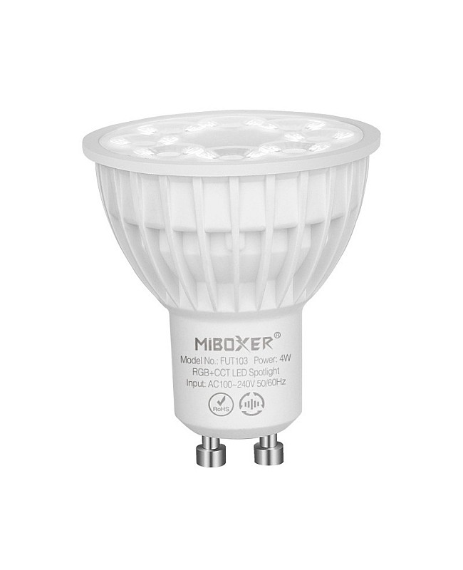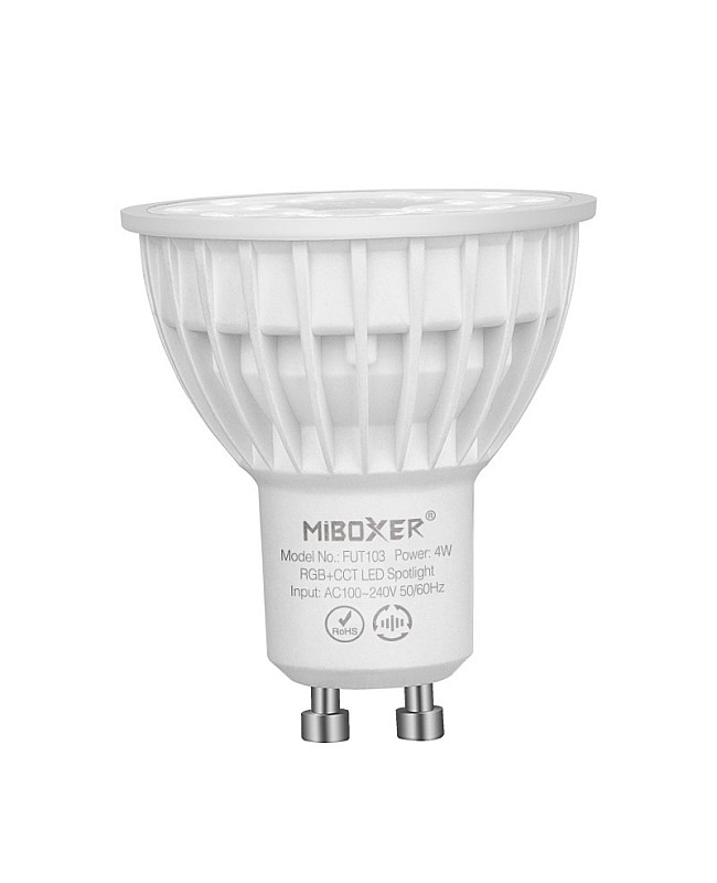 The MiBoxer FUT103 RGB CCT GU10 bulb is a 2.4G WiFi-enabled smart light bulb designed to allow users to customize their lighting. You can use a GU10 base to replace the traditional GU10 bulbs. The FUT103 bulb is built with a reliable power driver for constant current and voltage of 4W power, and it uses high-quality Taiwan SMD LEDs as the light source to ensure a longer lifespan of up to 50000 hours. The lamp body made of flame retardant material with long-term heat resistance, the surface of the GU10 LED bulb with imported PC previous to the light cover, and the light transmittance is over 90%. The FUT103 adopts 2.4 GHz WiFi transmission technology. It is compatible with Milight and MiBoxer 2.4G RGB+CCT remote controls. You can use the remote control to set the static color or dynamic modes and adjust brightness, color temperature, and saturation. The LED bulb receives and transmits the signal to other lamps within 30 meters. Different bulbs will work synchronously whenever they are started at various times. The bulbs are non-waterproof. We only recommend working indoors. You can use it in the bedroom, sitting room, restaurant, cookroom, etc.