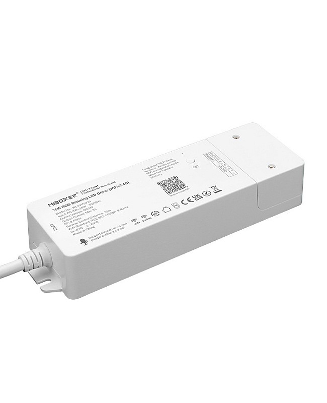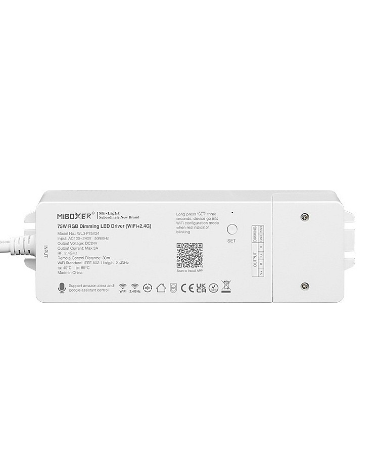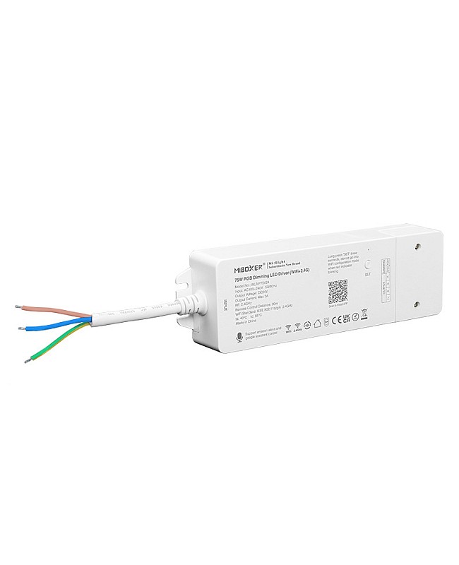 The MiBoxer WL3-P75V24 dimming LED RGB driver is a 2.4G WiFi-enabled device that lets you control your LED lighting by remote control, APP, and voice commands. It is designed for RGB LED lights, made of fireproof PC material, and a screw port terminal recommended for indoor applications. The MiBoxer LED RGB driver adopts 2.4G, WiFi, and Bluetooth technology, enhances the pairing network experience, and significantly improves the pairing network success rate. You can use the smartphone APP, 2.4G remote controls, and third-party voice commands to control the LED lights remotely, download the APP " MiBoxer Smart" to set the static color or dynamic mode, adjust the color temperature by mixing RGB LED chips, dim brightness, group control, device sharing, multiple scenes, music mode, sleep/wakeup plan, timing function, etc. The RGB LED driver will receive the signals and transmit them to others within 30 meters, and different LED drivers can work synchronously.