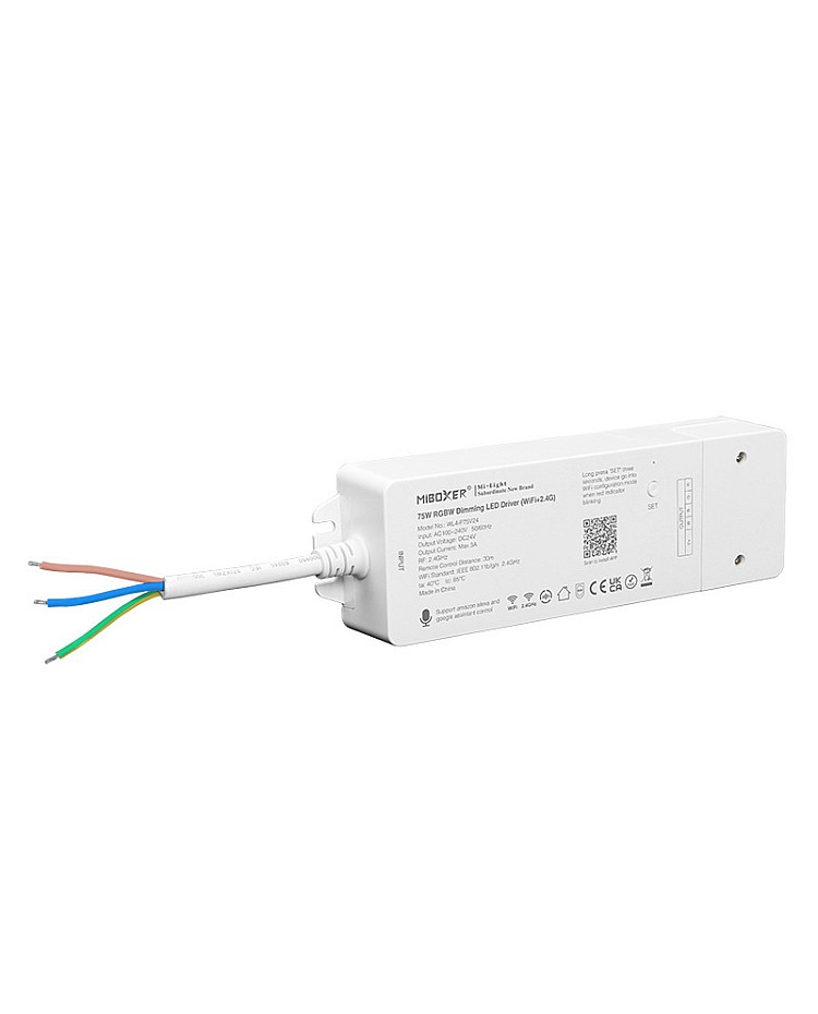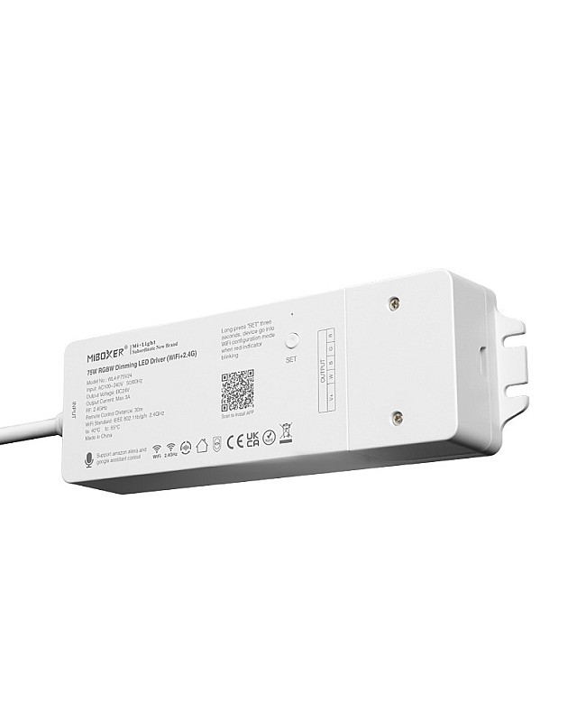 The MiBoxer WL4-P75V24 RGBW dimmable 24V LED transformer is a 2.4G WiFi-enabled device that allows you to control the brightness and color of your LEDs remotely. It adopts 2.4G WiFi and Bluetooth modules to enhance the pairing network experience and significantly improve its success rate. The smartphone can control it through the APP, 2.4G RF remote controls, and third-party voice commands. You can set the static color from 16 million colors or dynamic mode for the RGBW LED lights, stepless dimming brightness, group control, device sharing, music mode, sleep/wakeup plan, and timing function for multiple scenes. The RGBW dimming LED transformer will receive and transmit the signals to the other LED drivers within 30 meters. Different drivers can work synchronously, and the control distance can be limitless. The 24V transformers are non-waterproof and are only recommended for indoor applications, restaurants, homes, offices, etc.