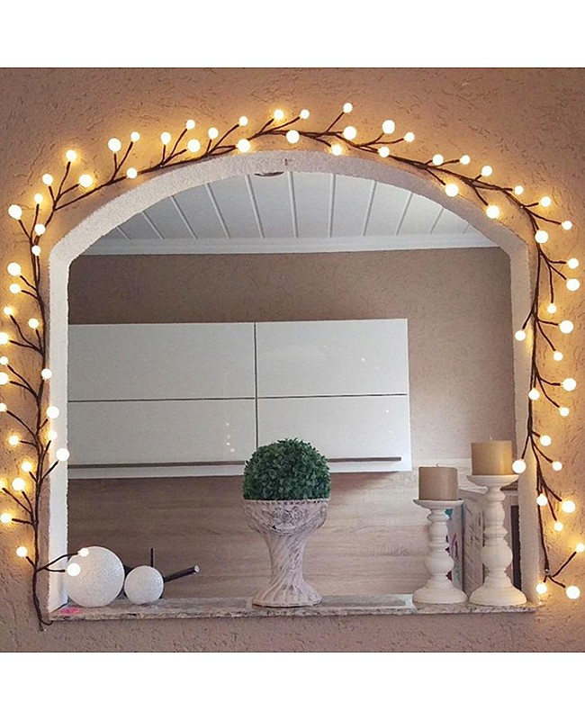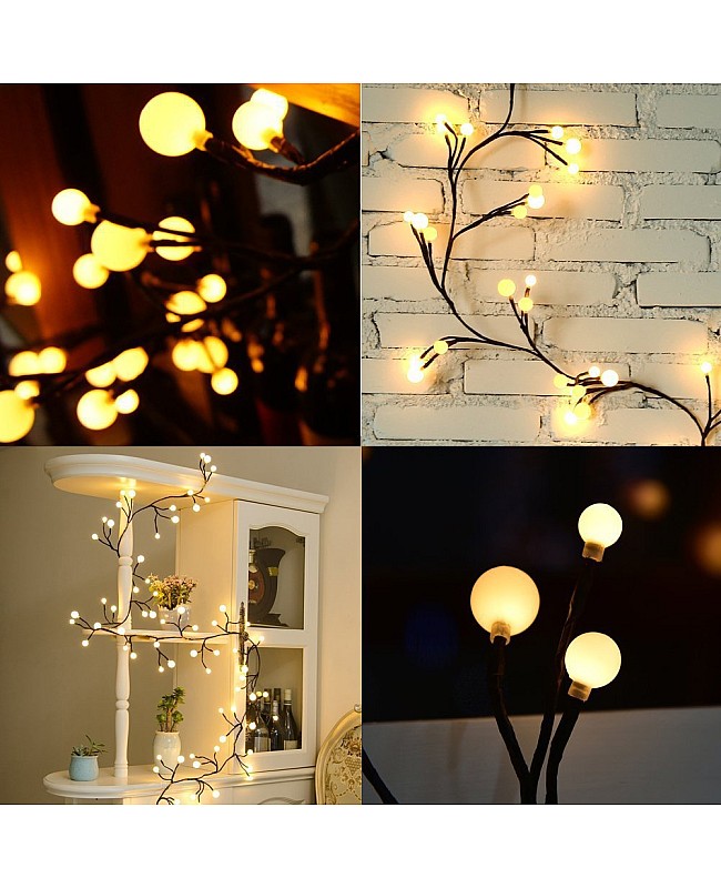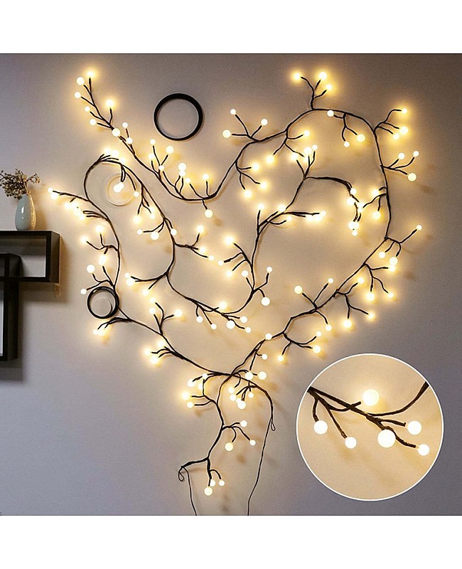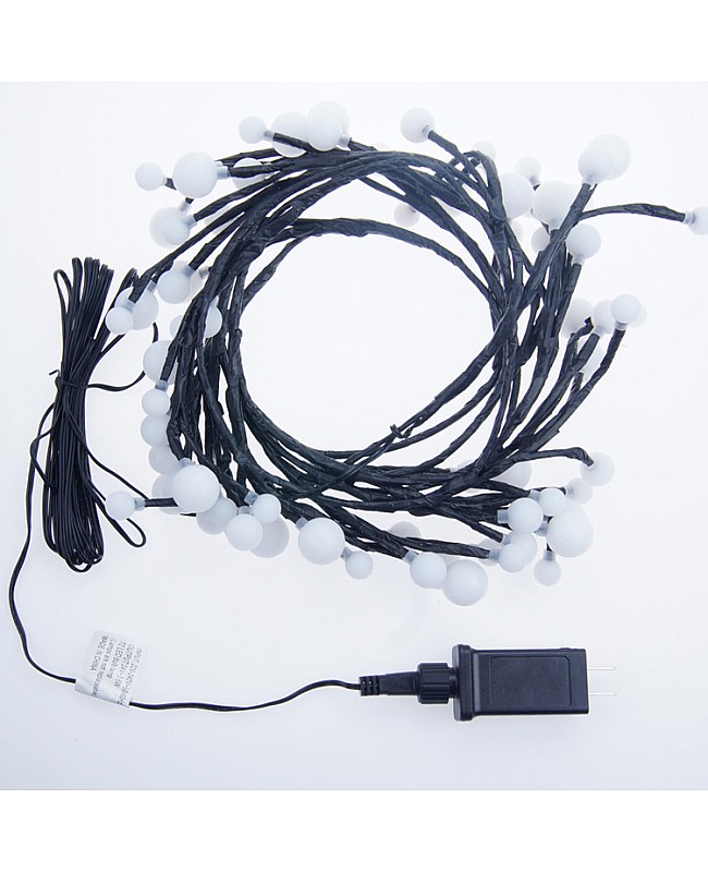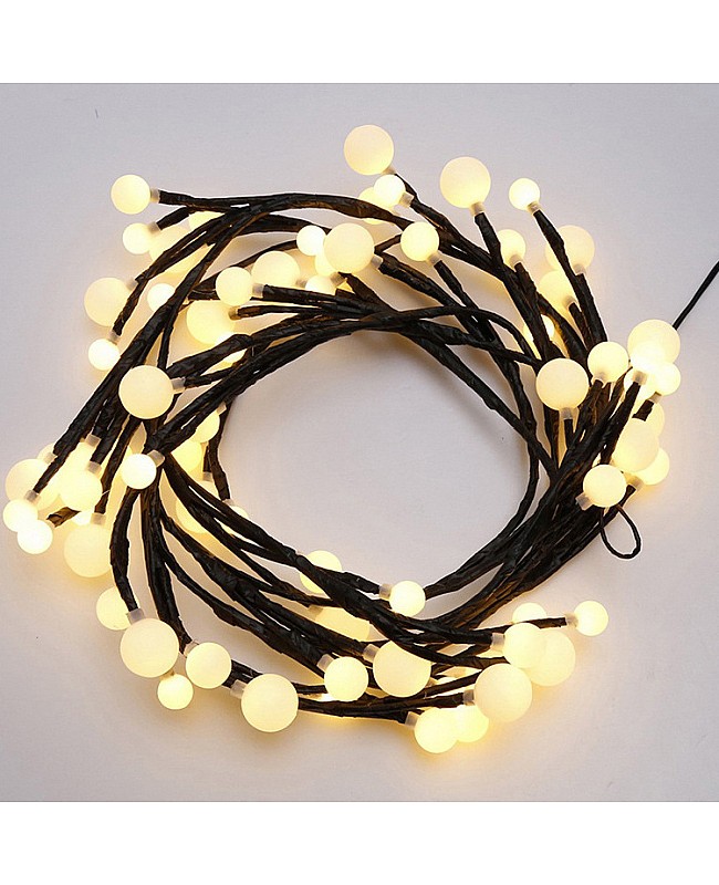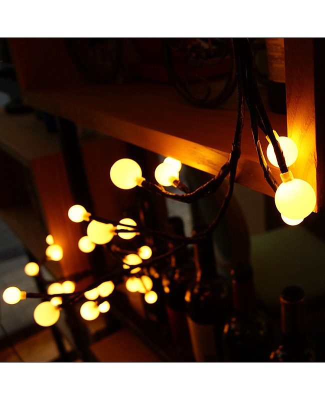 The ball-style outdoor Christmas light works on AC110V or AC220V, and US and EU power plugs are available. The Christmas light is 2.5m long and uses 72 pieces of LEDs as the light source. The LEDs are fixed in the plastic ball-shaped shell, and the emitting color is warm white. The waterproof level is IP44, and the lead wire is 5 meters long. You can use it for the outdoor holiday light project or a home garden Christmas decoration.