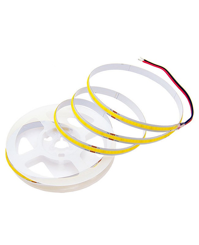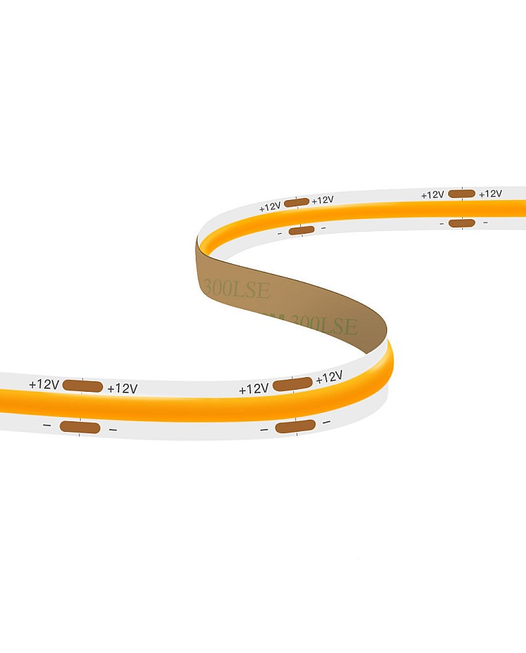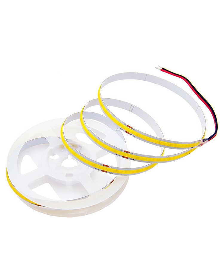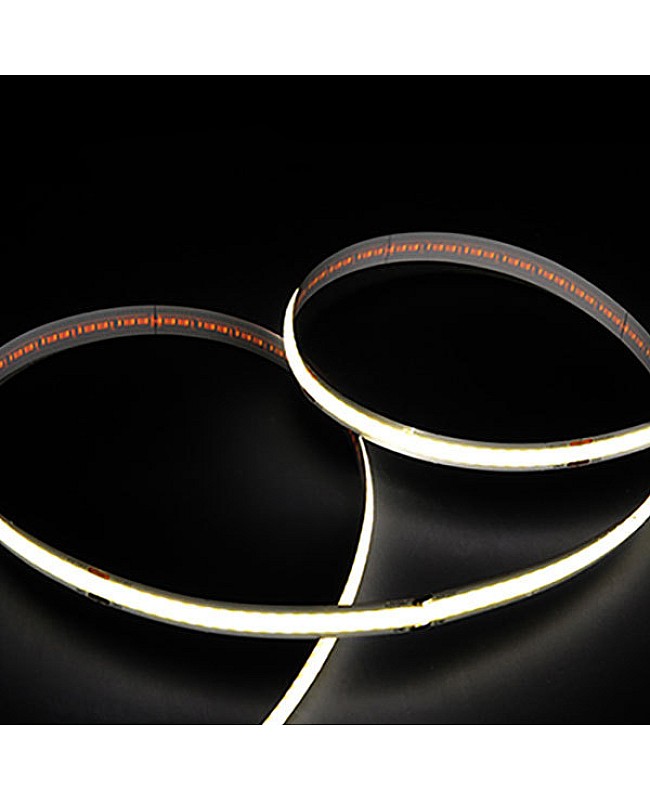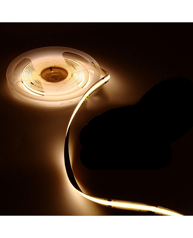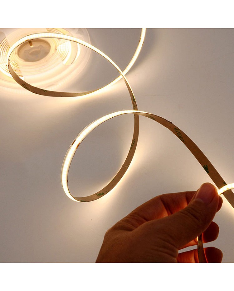The FCOB LED strip lights bedroom, 5 meters per reel, cuttable and dimmable, with double-sided adhesive tape on the back, easy to install and use. The FCOB LED strips work on DC12V or DC24V, and you can choose the 24VDC products for a longer max run. Use the high-quality San An LED chips as the light source. 336PCS LED chips mounted on the flexible PCB board to produce a smooth and seamless line of light will not show visible dots or hot spots, which makes it ideal illumination for reflective surfaces such as granite countertops and tile floors or narrow applications like jewelry cases and other backlighting. with high CRI up to 90+, the FCOB room LED strip is a solution for places where quality color rendering need. Three emitting colors of products are available: warm white, natural white, and cool white, and you can choose your favorite light for your home decoration. The waterproof level is IP20; it is non-waterproof and is only recommended for dry location installation. You can purchase the extra LED light dimmer to adjust the brightness.