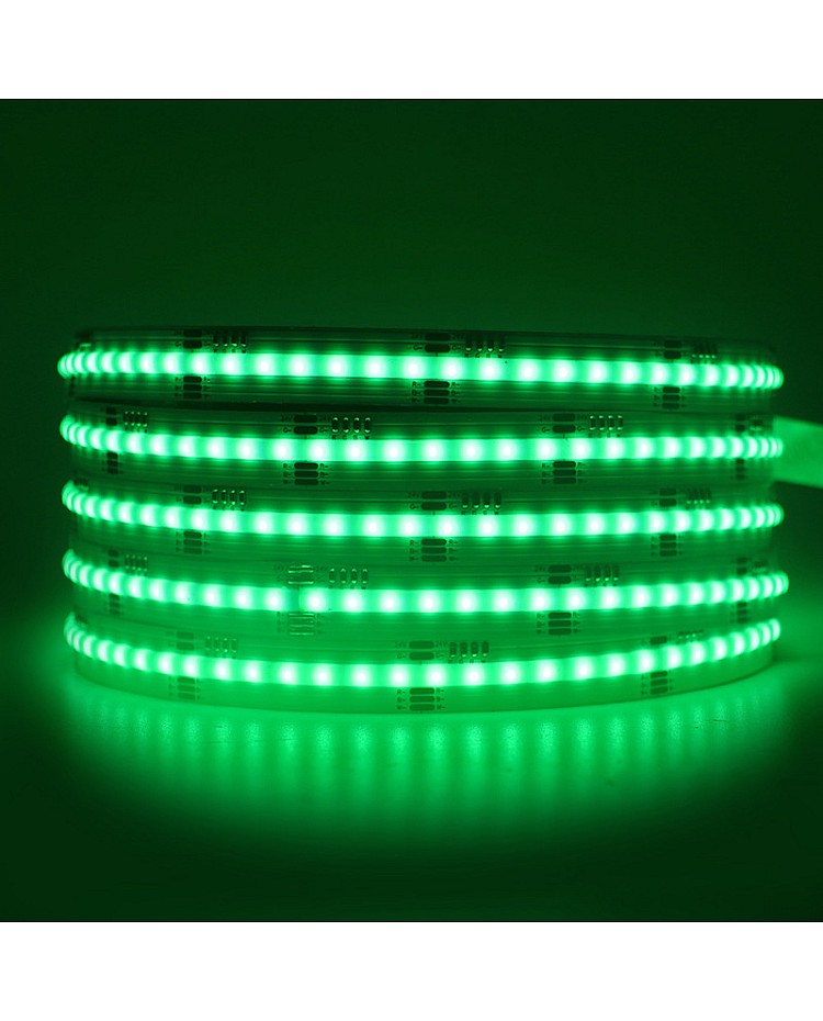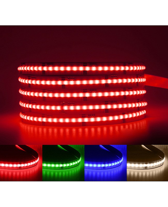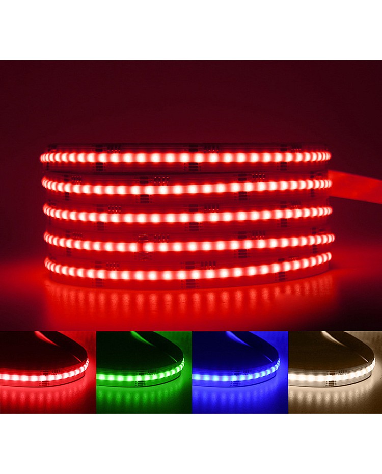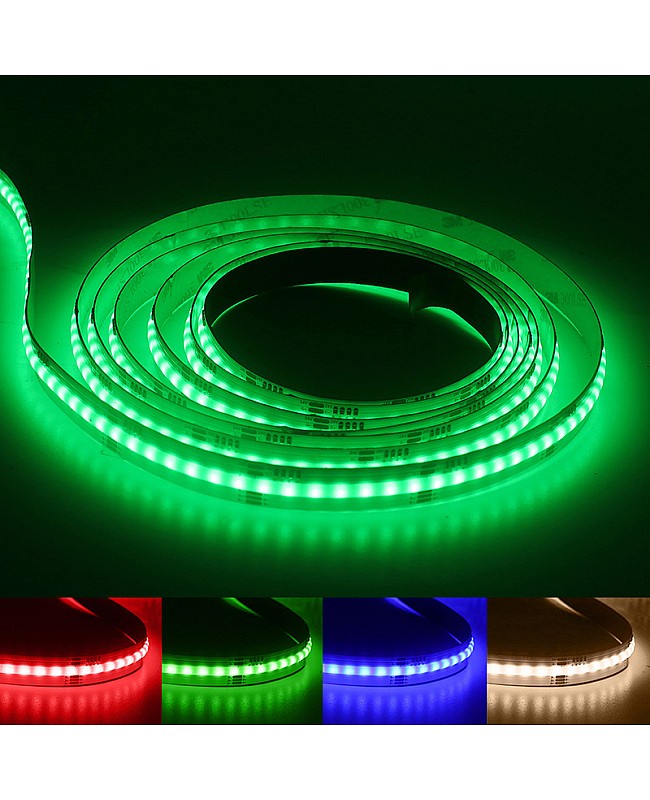 The 24V RGBW COB LED strips with chip-on-board design to create a smooth and seamless line of light are designed for various applications. The high density of the LED chips design will not show any visible light dots and hotspots for uniform light emission. The COB technology improves light output quality, reduces heat buildup, and improves the flexibility of the COB strip lights. Four colors of LED chips are mounted on the dual-layer gold-plated FPC board, which is flexible, bendable, and cuttable. They feature a combination of red, green, blue, and white LEDs, all in a single strip. This allows for a broader range of colors and brighter, more even lighting than standard RGB LED strips. The minimum cuttable length is only 31.25mm, which can be cut to any length for your project. The RGBWW LED stripe can work with an RGBW LED controller to achieve single colors, mixed white, and color-changing modes for various scenes. The back has double-sided adhesive tape, and it is easy to remove the protective paper from the tape and stick it to where you want to install it. Brightness is adjustable from 0 to 100%. Only recommended IP20 products for areas with dry conditions. You can use them for areas that need quality color rendering, kitchen counters, display cases, TV Backlighting, lighting for living rooms, bedrooms, etc.