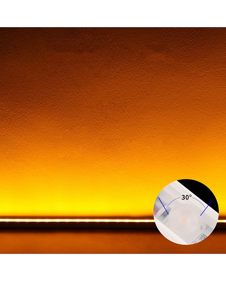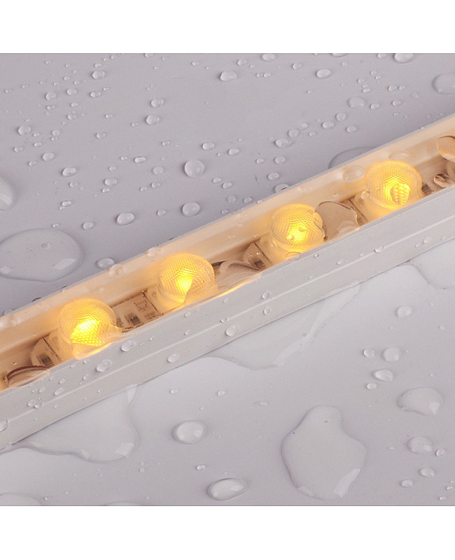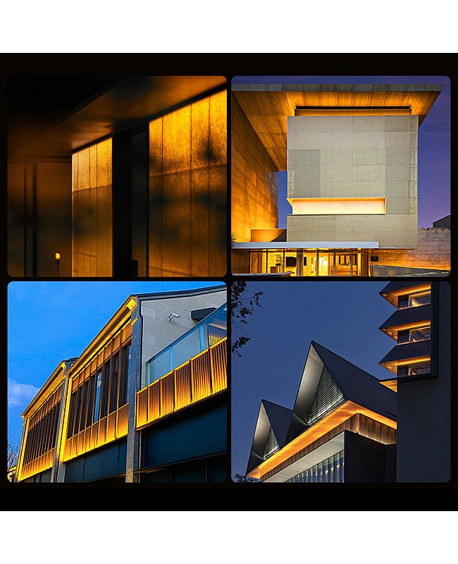 The 24V wall washer lamps are designed for architectural lighting, especially exterior wall facade lighting. They feature 30° optical lenses to deliver uniform wall washing lighting on facades. They are engineered to provide even illumination for commercial and residential applications to enhance architectural features. The white wall washer strips use high-quality SMD LEDs as the light source and are sealed in silicone tubes for waterproofing and dustproofing. They have an IP rating of up to IP67, ideal for outdoor and damp environments. The standard length is 5 meters per roll, and the minimum cutting length is 45mm. The back has strong double-sided adhesive tape and is easy to stick where you want to install it.