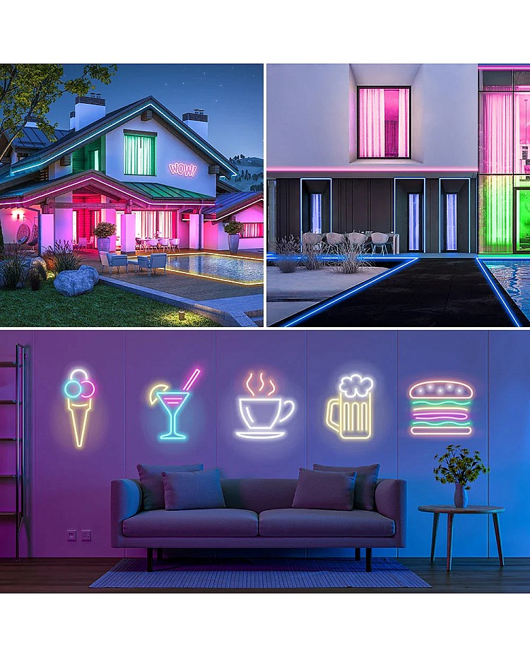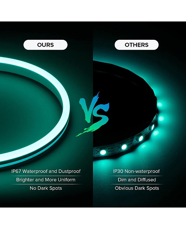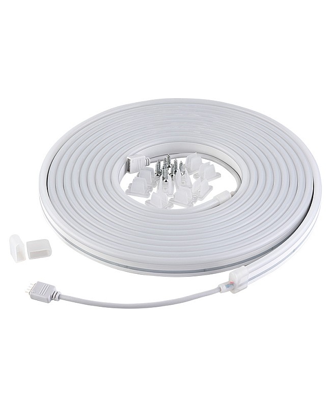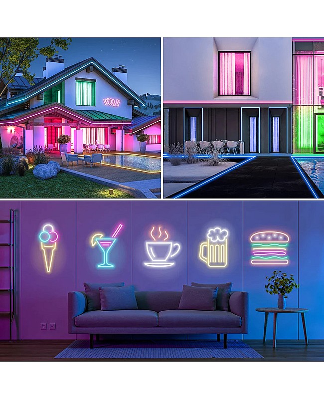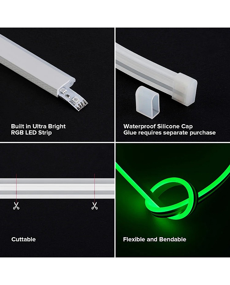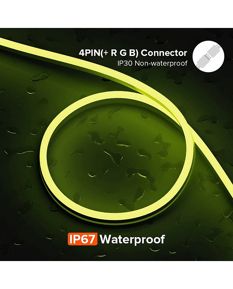 The 24V RGB color-changing neon strip lights allow you to choose various colors or dynamic lighting effects to match different scenes. The flexible and bendable features can be cut to any size and shaped into custom lighting designs. The 24V neon LED strips use high-quality SMD LED strips as the light source, with 108 LEDs per meter. The outer layer is a high-quality silicone channel for waterproofing and uniform light output, with an IP rating of up to IP67; you can use them for outdoor lighting decoration, too, and you can use them to illuminate patios, gardens, or pool areas without worrying about the weather conditions. Three lengths of products are available: 3M, 5M, and 10 M. The mounting accessories are included and easy to install. The one side has 4-pin male connectors, which allow it to connect to RGB light controllers easily.