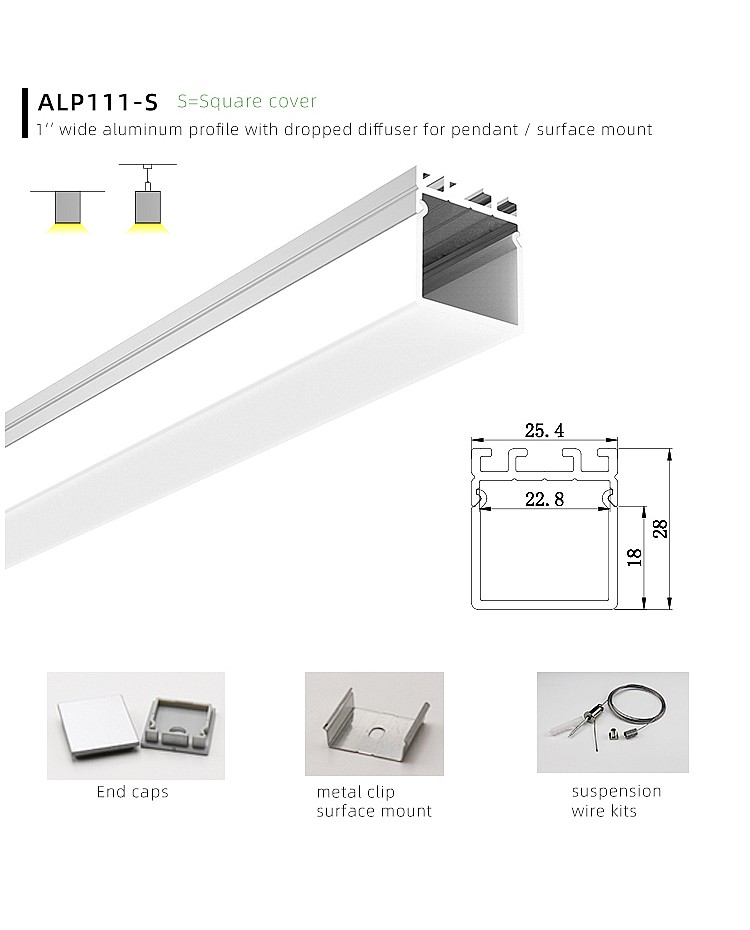 The 25mm width aluminum LED profile housing is designed to house and protect LEDs in indoor applications. A 1-inch dropped square cover makes it ideal for use in areas with limited space. The inner width is 22.8mm, allowing the maximum width of strip lights to be 22mm. They are made of 6063-T5 durable aluminum alloy with anodized silver surface treatment, anti-oxidation resistance, and a longer lifespan. The standard lengths are 1M and 2M and can be cut to the length you want for your LED projects. Only one type of diffuser is available, the square PC diffused cover for the soft output lighting. End caps with wire holes are included, and it is easy to add the LED strips and the aluminum base for better heat dissipation. The mounting brackets are included, allowing for easy installation. Please check the picture below to learn about LED aluminum profile Installation.