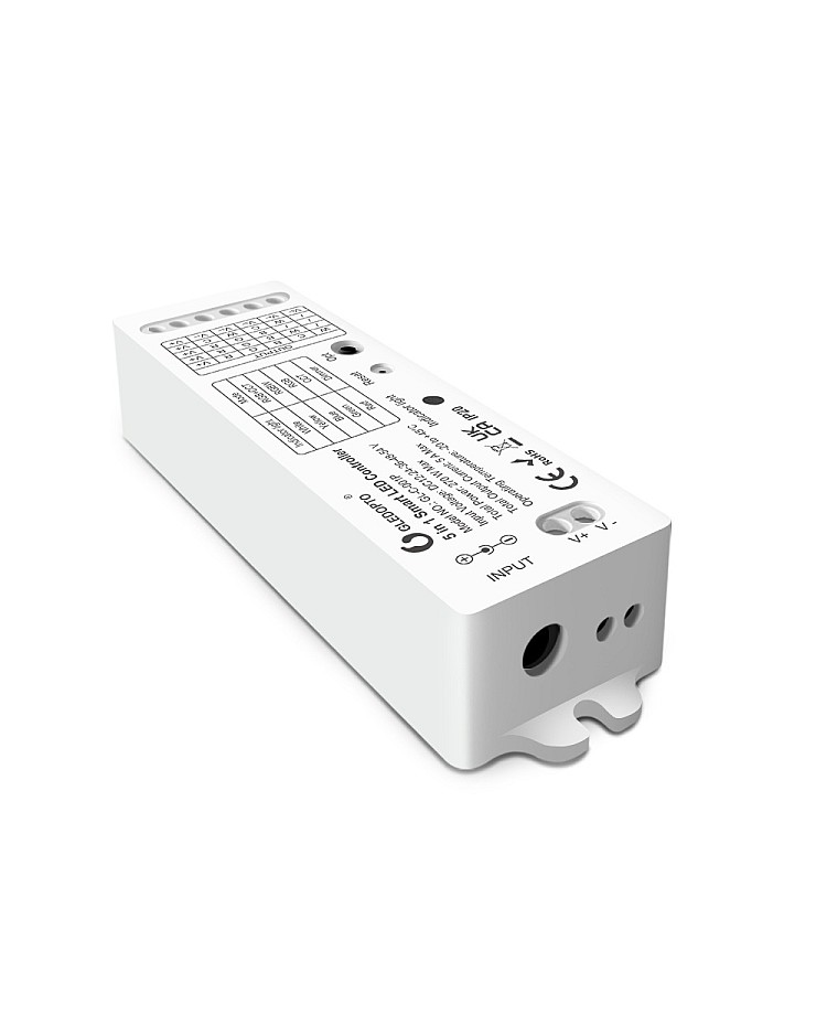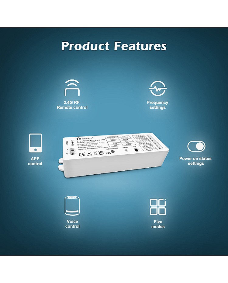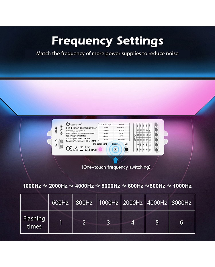 The Gledopto Zigbee controller GL-C-001P, with 5 5-working-mode switchable design, can be used for RGB+CCT, RGBW, RGB, CCT, and Single Color LED Lights. The Gledopto Zigbee controller works at various voltages, from DC12V to DC54V, with a max loading power of up to 270W. There are two buttons on the controller's surface; you can press them to switch the working mode. Different color indicators correspond to various functions. The Gledopto Zigbee controller can be controlled by a 2.4G RF remote control and a smartphone APP to set the static color, adjust the color temperature, and brightness. There are 16 million colors available, color temperature adjustable from 2000K to 6500K, and brightness adjustable from 1% to 100% for various scenes. The GL-C-001P can work with Amazon Echo Plus, and you can adjust ON/OFF and brightness through voice commands. Two power-on modes are available; long-press the "opt" button to switch from " light ON to " light OFF after the controller is powered on. the working frequency is changeable to match more power supplies to reduce noise, You can set the frequency from 600Hz to 8000Hz.