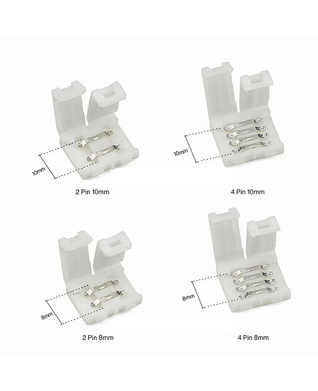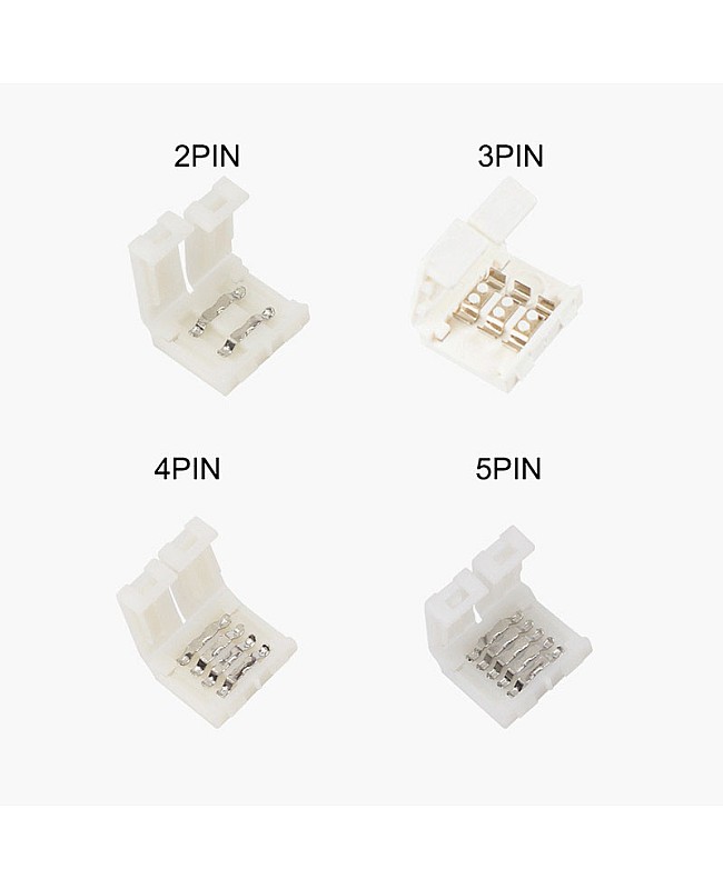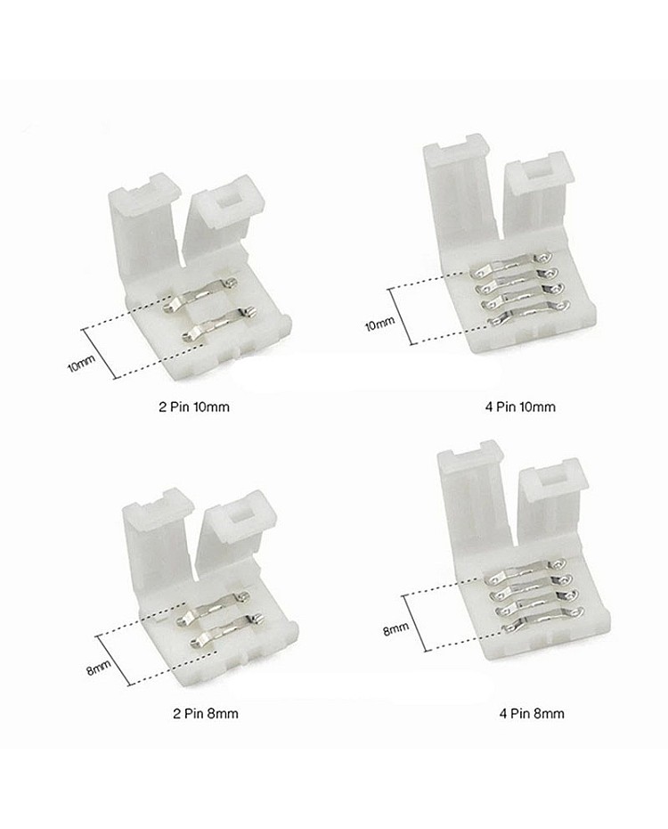 The solderless LED lighting connectors for SMD LED strips, 8mm, 10mm, and 12mm width solderless LED connectors are available; you can choose them for the 3528, 2835, or 5050 LED strips. These LED light connectors allow you to cut and re-connect the single color LED strips together easily, only open up the clips and insert the LED strips, then close the clips tightly to finish the installation, no need for extra tools. These single-color LED connectors are non-waterproof; they are only recommended for working indoors. There are 2P, 3P, 4P, 5P, and 6P LED connectors available, which you can use for single color, tunable white, RGB, RGBW, and RGB+CCT LED lights.