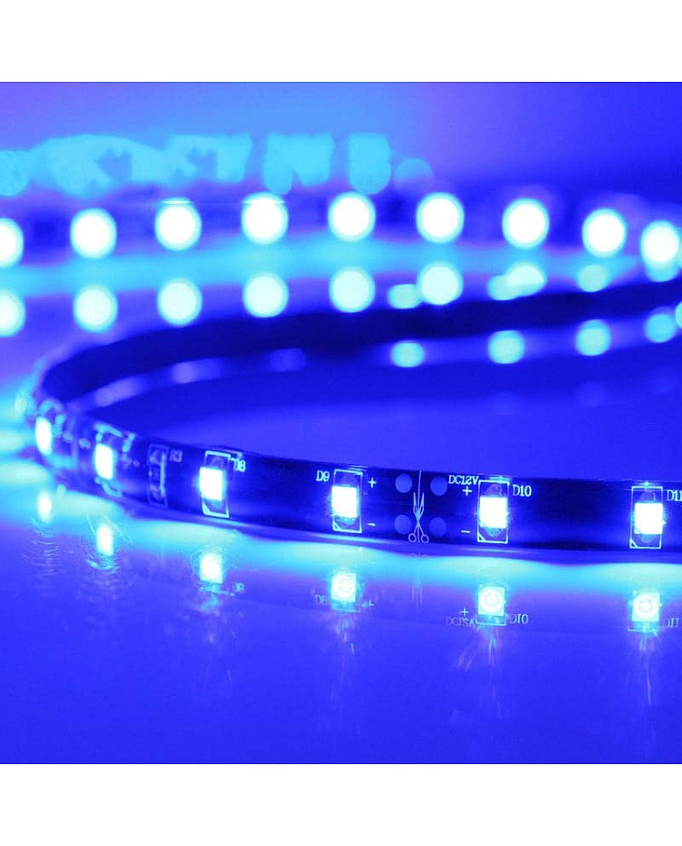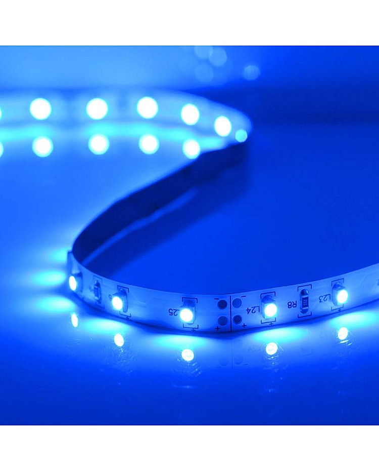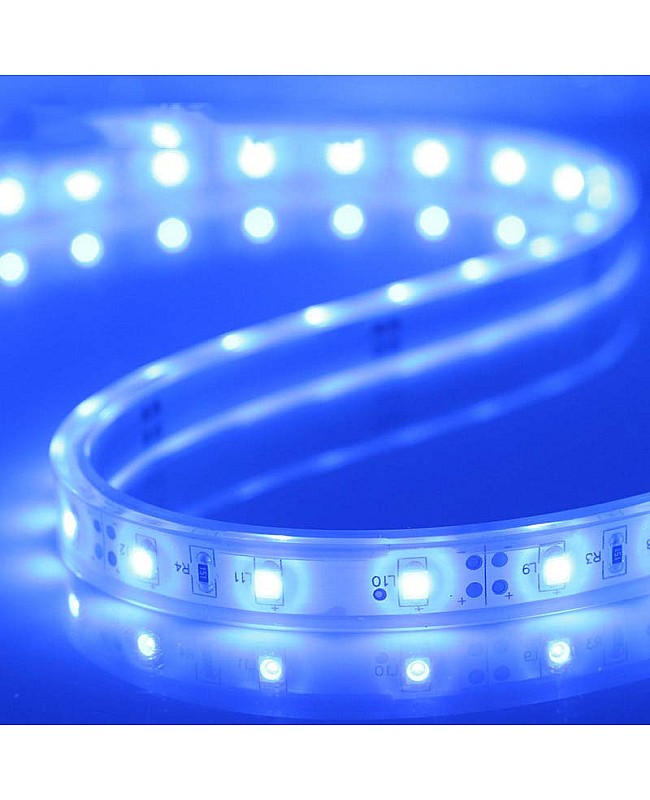 The blue flexible LED strip lights, 5meters per reel and 60LEDs per meter, use the high-quality 3528 Blue SMD LEDs as the light source, the LEDs mounted on the dual-layer FPC board, flexible and bendable, working in DC12V, only works with the LED light driver that the output is 12VDC, can work with LED Tape Dimmer to adjust the brightness. There are 4 types of Waterproof LED Strip Lights available, the IP20 non-waterproof, IP65, IP67 and IP68, the IP20 and IP65 for indoor use only, back with double side adhesive tape, take off the protector on the tape and stick on the place you want to install, cuttable and reconnectable, follow the scissor marks and cut to any size you wish to, can reconnect them via the LED connectors. The IP67 and IP68 are for outdoor damp locations. Use the LED clips to fix them where you want, and use them in the swimming pool, billboards, etc.