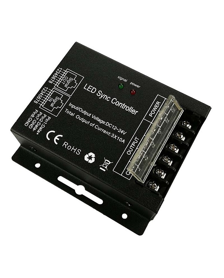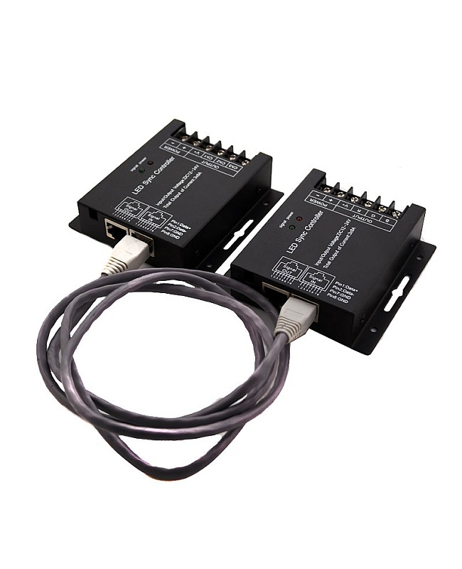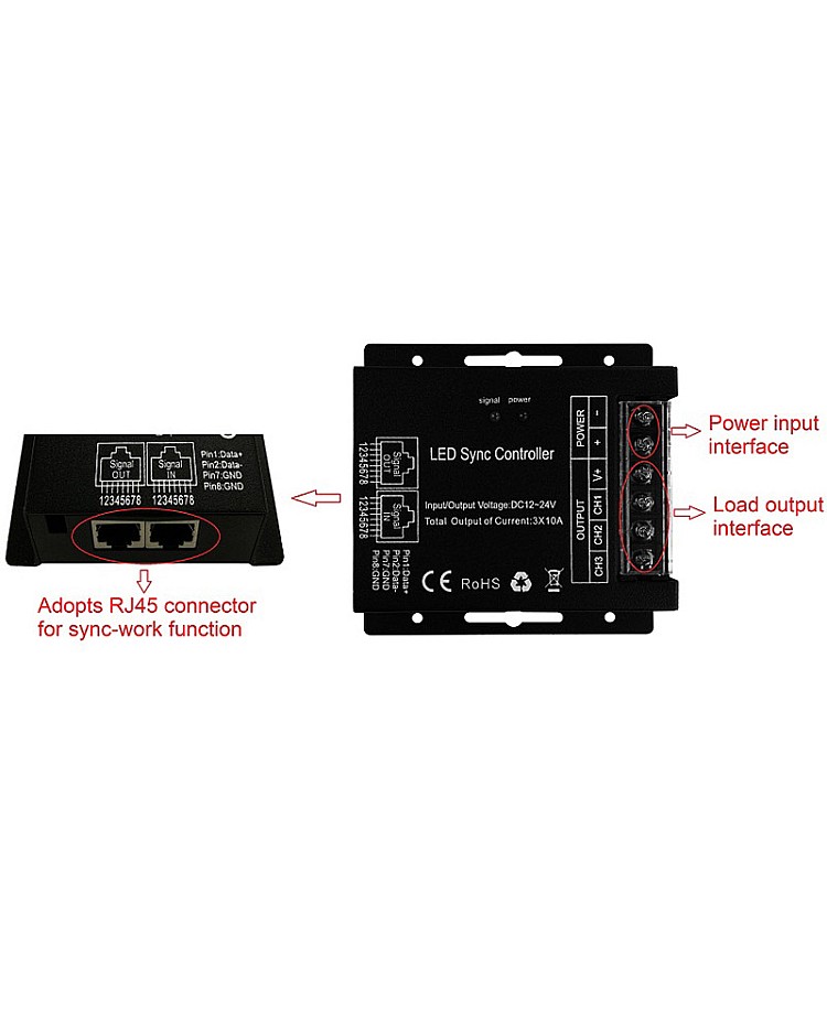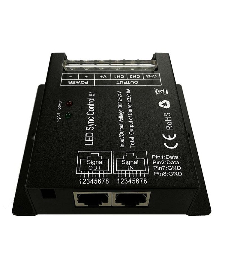 The RGB light controller is enclosed in a black metal shell for better heat dissipation. It works on DC12V or DC24V, with a 3-channel output design. The max output current of each channel can reach 8A, and the max loading power is up to 720W when working in DC24V. The LED RGB controller with the advanced micro control unit can control various LED lights, point source lights, LED light strips, etc. Comes with 20Keys RF remote control, which has 14 modes in total, 8 static colors, and 6 dynamic modes, and can use the remote to adjust the brightness of the static colors and speed of dynamic modes. The LED RGB control adopts dual RJ45 network cable ports, which makes it convenient to use the RJ45 port to connect multiple controllers together to achieve the synchronization function of many RGB LED lights.