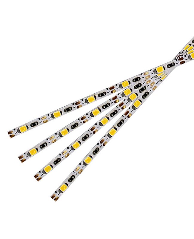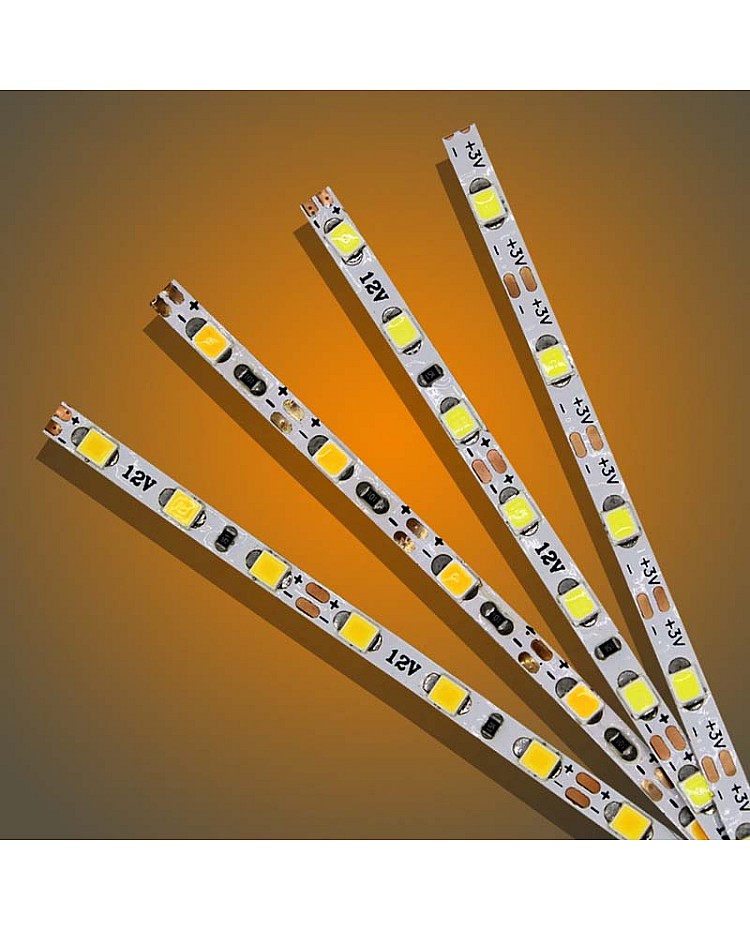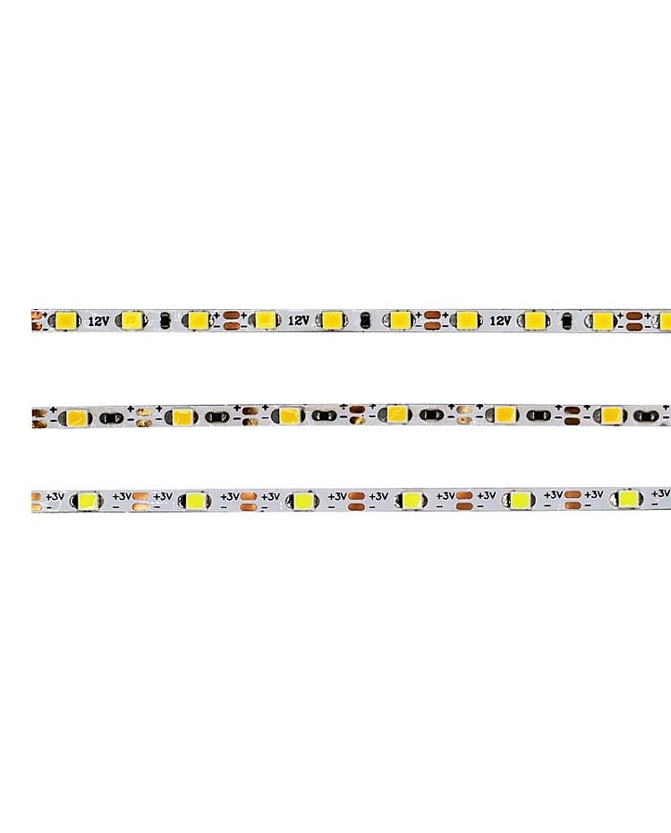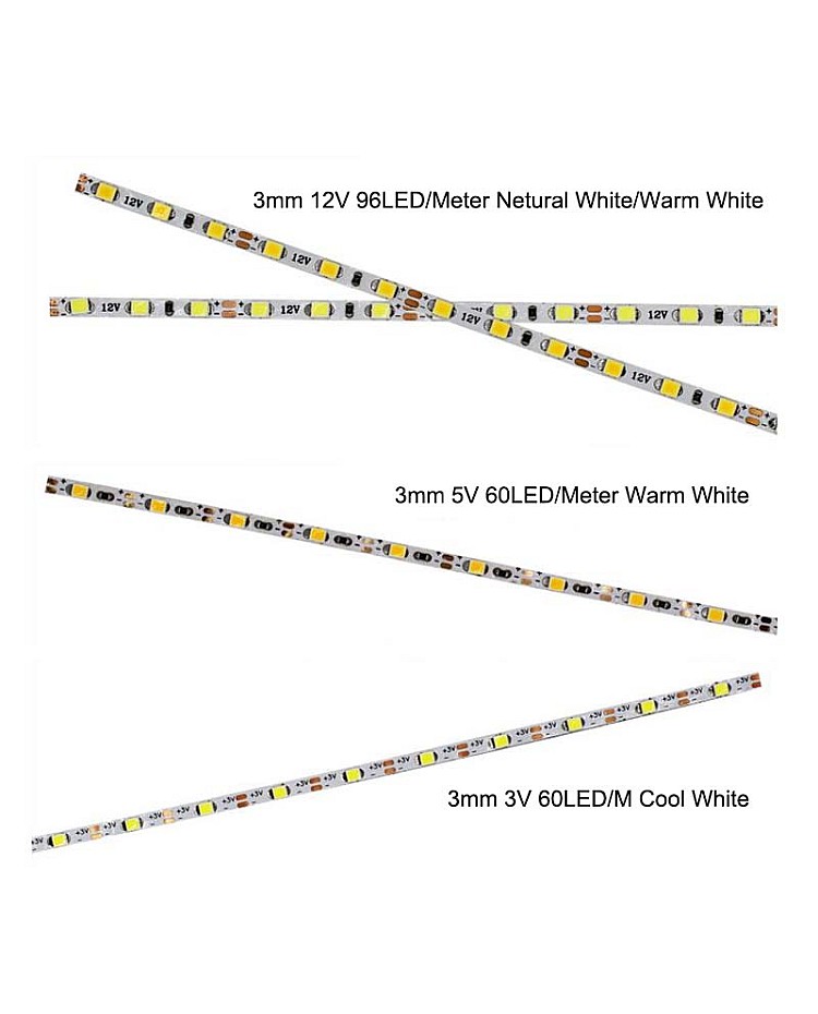 The 3mm 3528 flexible LED strips, use the high-quality 3528 SMD LEDs as the light source, 30LEDs per meter or 60LEDs per meter available, the max LED quantity can do 96LEDs per meter, 5meters per reel, the LEDs mounted on the 3mm dual layer PCB board, back with double side tape, flexible and cuttable, you can cut the LED strips to any size follow the scissor marks for your projects, take off the protector on the tape and stick on the place you want to install, the 3mm LED strips is non-waterproof, only recommend works indoor or the dry areas. You can choose the various working voltage LED strips, you can select the DC3V, DC3.7V, DC5V, DC12V, you can use them in makeup mirror, toy car, baby carriage, scooter, backlight on TV, luminous signs, luminous clothes shoes, the width only 3mm, easy to install and use.