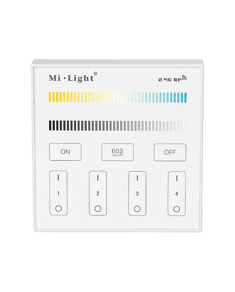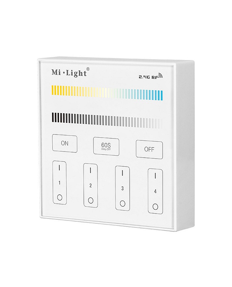 The MiBoxer B2 LED panel CCT has 4 individual zone control designs. Each zone controls countless lamps or controllers, and you can use it to control Mi-Light dual white lamps and MiBoxer CCT controllers. The LED panel CCT has a sensitive touch panel design and a high-precision capacitive touch screen IC. The touch screen is very stable and easy to use. You can use it to adjust the color temperature from 2700K to 6500K and the brightness from 1% to 100%. The Milight B2 with the 60S delay OFF function, touch the button "60S", and the light will be turned off automatically after 60 seconds. When touching the button, the LED indicating light will flash once with a different sound. The MiBoxer CCT LED panel adopts a 2.4G communication module and a control distance of up to 30 meters. With a magnetic holder, you can attach the panel remote control to the base easily.