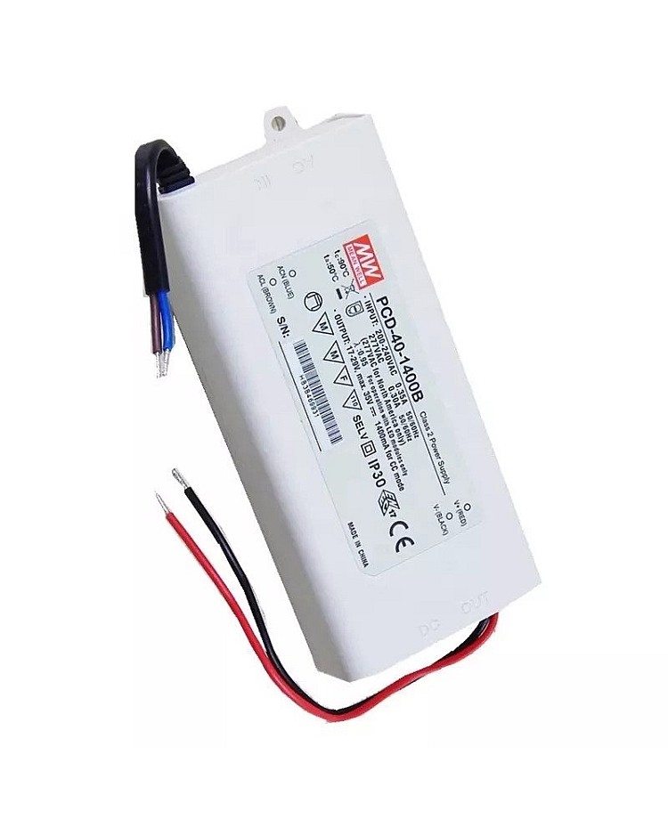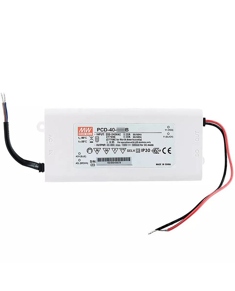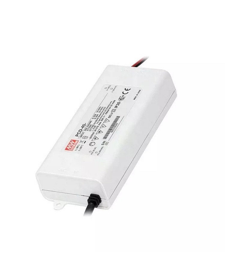 The 40W Meanwell PCD-40 series triac dimming LED drivers, which have a constant current design, can be used for constant current LED lights like light modules, LED panels, LED lamps, etc. The triac light driver is fully isolated in a plastic case, built-in active PFC function, cooling by free air convection, low cost, and high reliability. With IP42 design, waterproof and dustproof. Offers AC phase-cut dimming and works with leading-edge and trailing-edge TRIAC Dimmers.