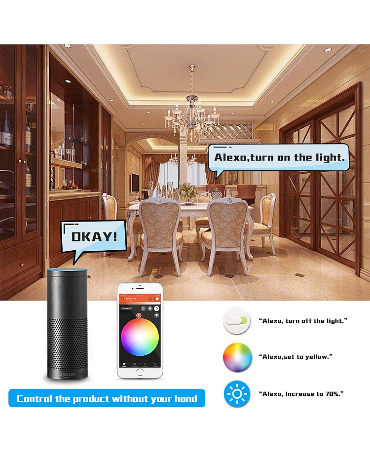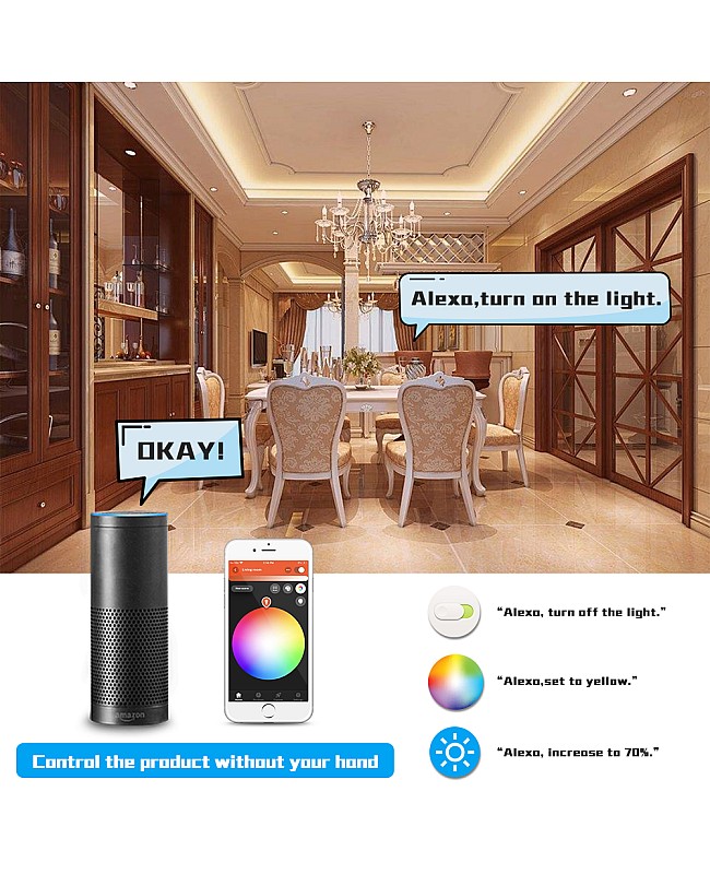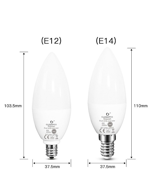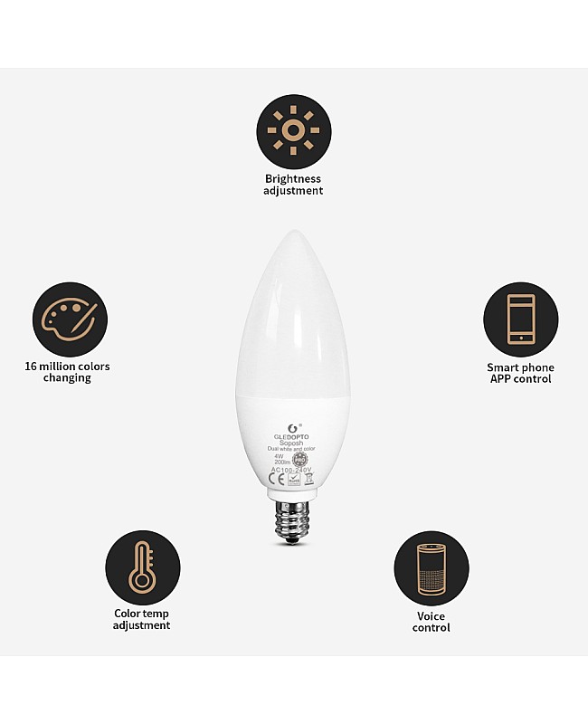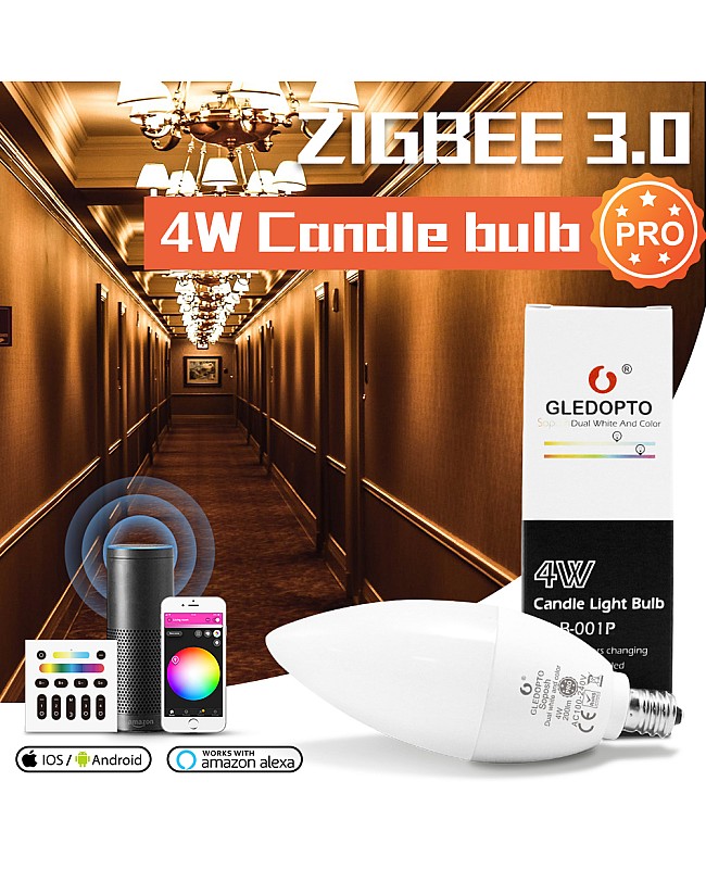 The Gledopto RGB+CCT candle light bulb pro has two lamp bases, E12 and E14. It works with a wide voltage range from AC100V to AC240V and replaces traditional candle lights directly. The candle lamps use high-quality SMD LEDs as the light source, with low heat, high brightness, and durability. The top adopts a high-grade PMMA lens, with a transmittance of up to 93%, the light distribution is more uniform, and there are no dark spots, effectively reducing the adverse glare damage to the eyes. The Gledopto E14 candle lamps adopt Zigbee and RF transmission technology, are compatible with Zigbee 3.0 gateways, and can be controlled by RF remote controls. After adding the lamps to the Zigbee hub, a smartphone app can control the LED lights and use voice commands to set the color and adjust the color temperature and brightness. There are 16 million colors available, color temp adjustable from 2200K to 6500K, and brightness adjustable from 1% to 100% for various scenes. You can use the remote control to control the LED lights directly. With the group control function, you can control the lights for the remote control simultaneously or separately. The candle light bulb can work with Amazon Echo Plus, and you can adjust the on/off brightness and change light colors through voice commands.