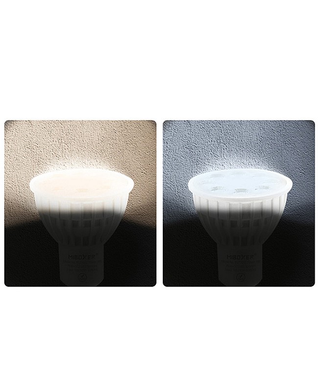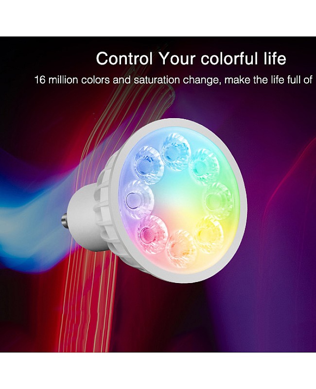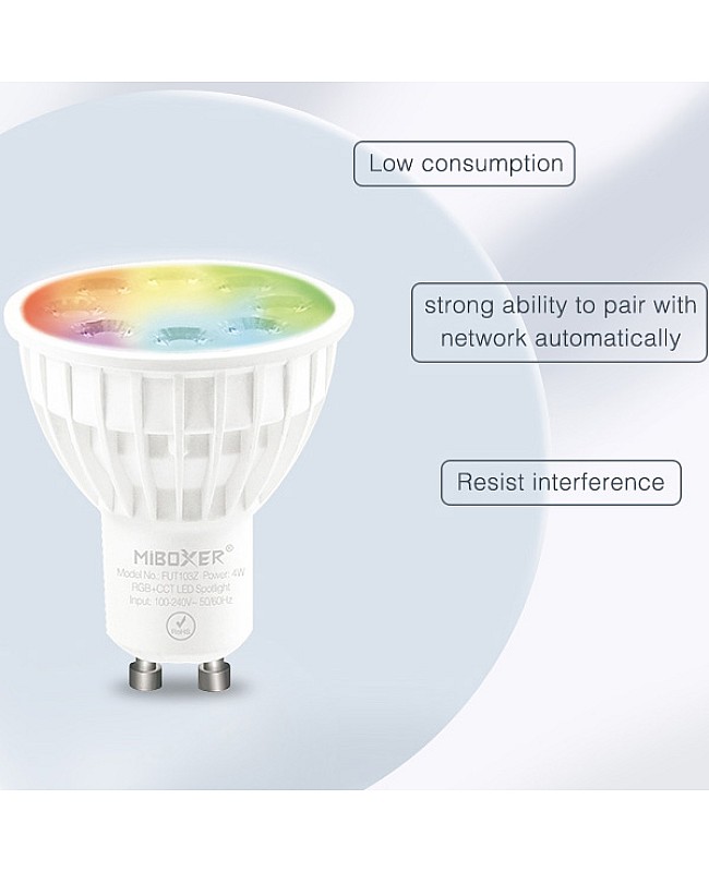 The MiBoxer FUT103Z RGBWW Zigbee light bulb with GU10 base, the Lamp body is made of flame-retardant material for long-term heat resistance, the GU10 lamp's cover uses imported PC transparent to light, and the light transmittance is over 90%. The FUT103Z adopts Zigbee 3.0 wireless transmitting technology for low consumption, a strong ability to pair with the network automatically, and resistance to interference. After adding the Zigbee gateway, the MiBoxer smart app can control the GU10 spot lamp and third-party voice commands. You can set the static color and adjust the saturation, brightness, and color temperature to meet various scenes. It can enter Philips Hue, IKEA TRADFRI, Amazon Echo Plus, Echo, Echo Studio, and Echo Show standard Zigbee gateways. The small remote control lights with music rhythm function will automatically change color along with the music. You can use the remote control or mobile APP to group control the GU10 bulbs, and all Bulbs will work in synchronization.