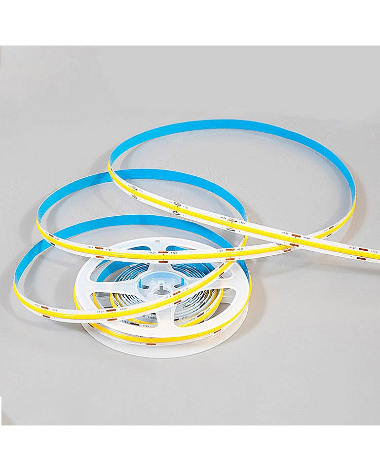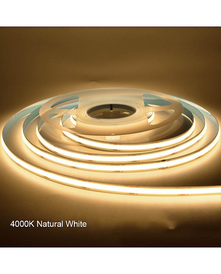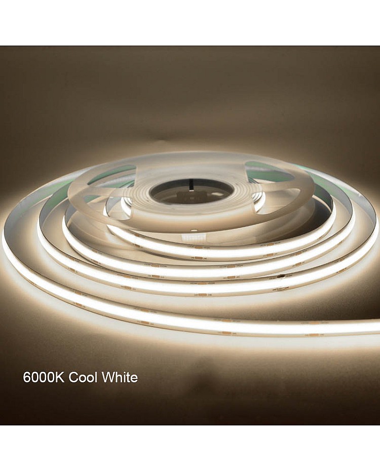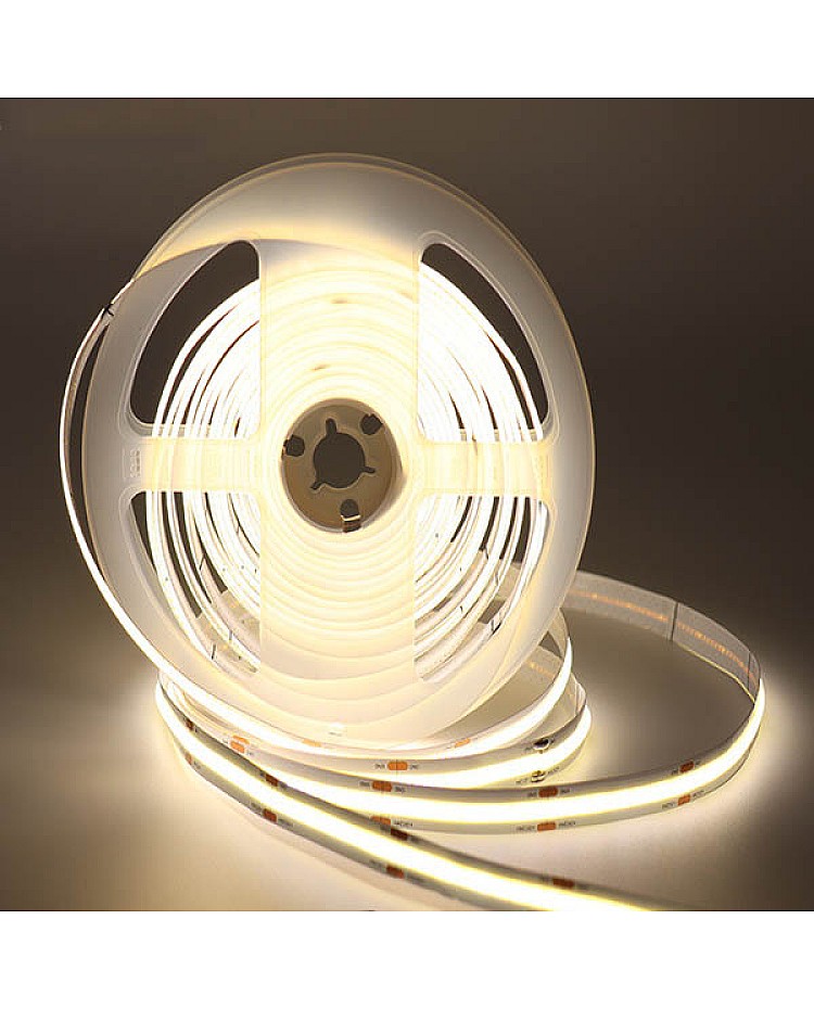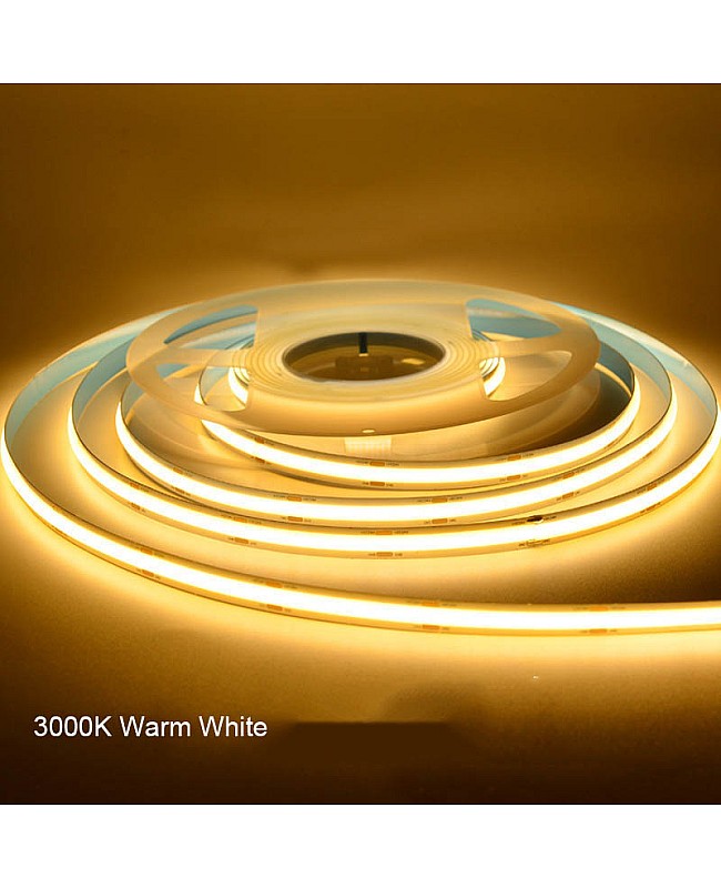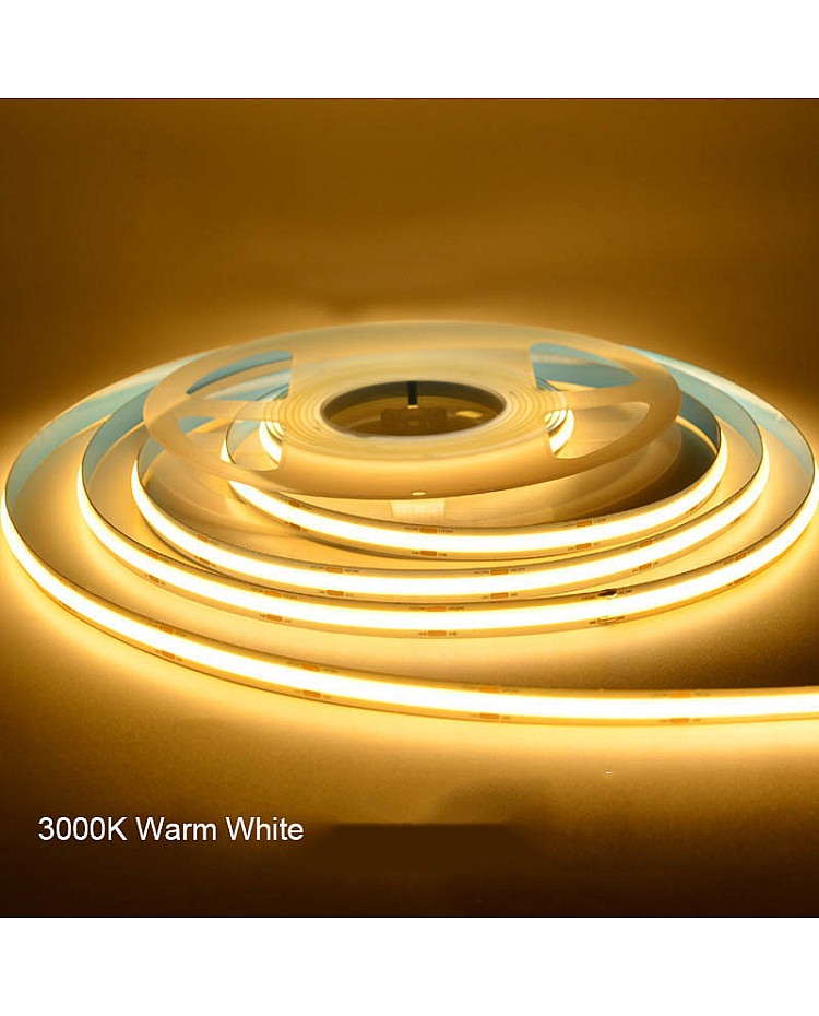 The FCOB LED strips use high-quality San An LED chips as the light source. The LED chips are mounted on the dual-layer flexible PCB board, 504 LEDs per meter, and the high-density LEDs create a seamless line of light with no visible light dots and hotspots. 90+ CRI for quality color rendering, excellent efficiency and color consistency, incredibly bright and comfortable visual experience, perfect for various indoor linear lighting projects. Flexible and bendable, you can cut to any size for your project from the cuttable marks. You can choose the DC12V or DC24V products, working on DC24V for longer max runs. The waterproof rate is IP20; it is non-waterproof and is only recommended for indoor projects. The back of the COB strip lights with double-sided adhesive tape is easy to stick to where you want to install. It can connect to an LED light dimmer to adjust the brightness freely. Three emitting colors of products are available, and you can choose warm white, natural white, and cool white for various scenes. Suitable for narrow applications like jewelry cases and backlighting. There are 3-width products available, and you can take the 5mm, 8mm, and 10mm for different lighting projects.