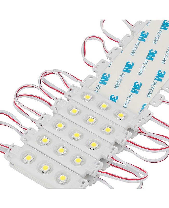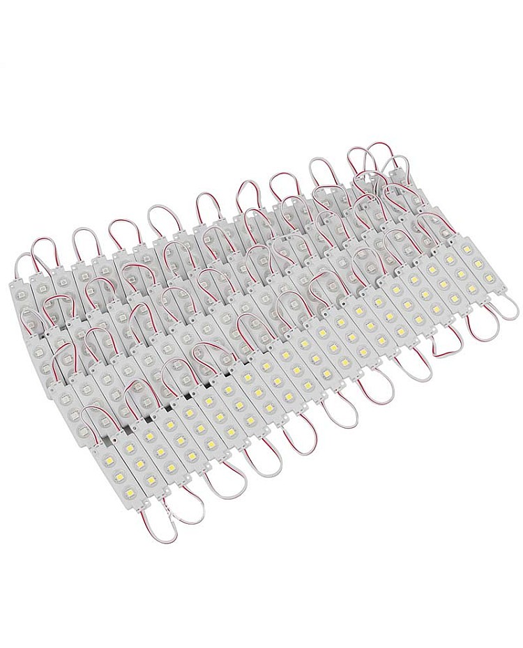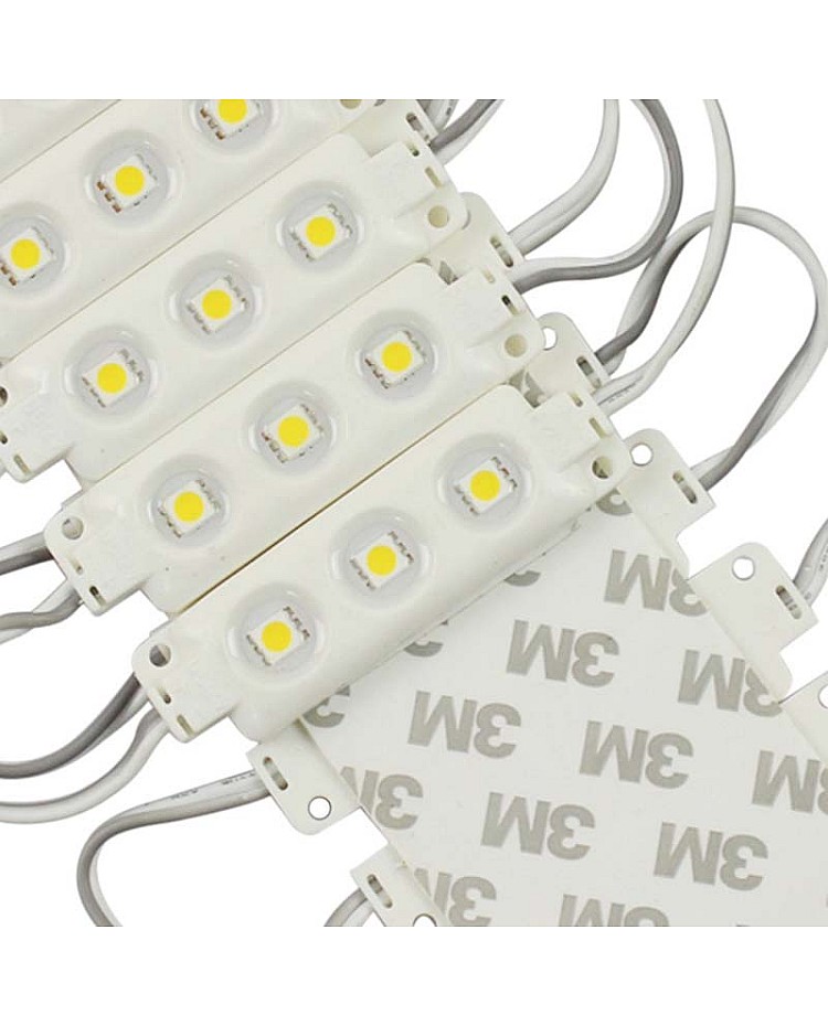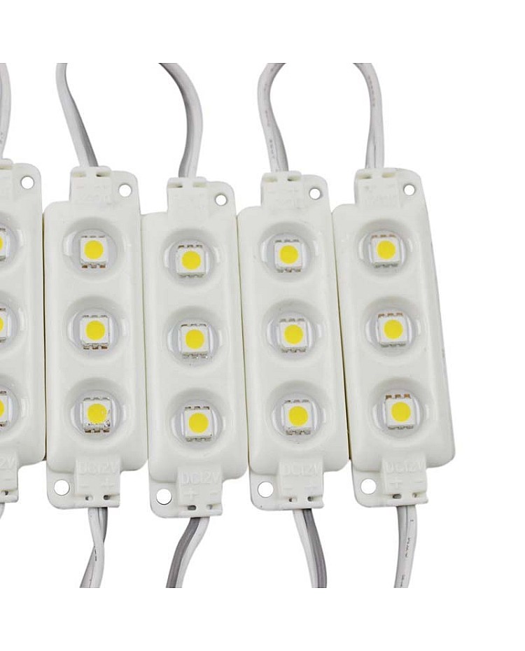 The 5050 LED display wodules use the high-quality and super bright 5050 SMD LEDs as the light source, 3PCS LEDs mounted on the aluminum board for better heat dissipation and in the ABS injection shell, the surface with epoxy sealed, the IP rating reach to IP65, can be used for indoor and outdoor signs, channel letters, metal letters, lightboxes, etc. The LED 5050 modules with screw holes and the back with double side adhesive tape, you can stick them on the place you want to install or use the screws to fix. The waterproof LED modules have 20 pieces per string, are cuttable, and are connectable. You can cut any quantity and reconnect them for your project. Working in DC12V, it is easy to connect to the waterproof LED power supply or the mini LED dimmer to adjust the brightness. Various emitting colors LED modules are available, and you can choose single colors or RGB.