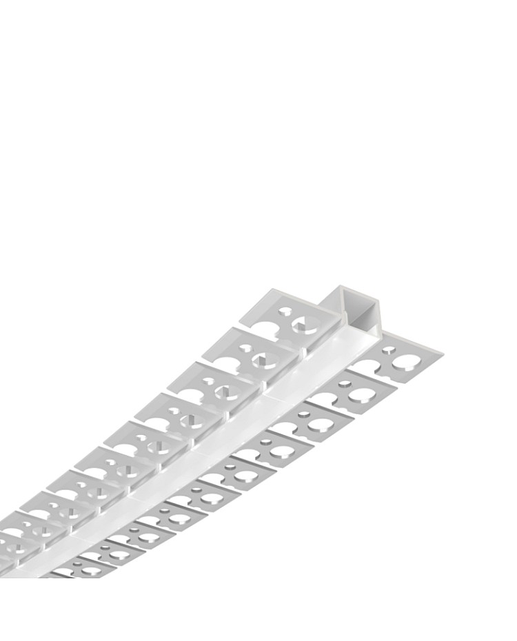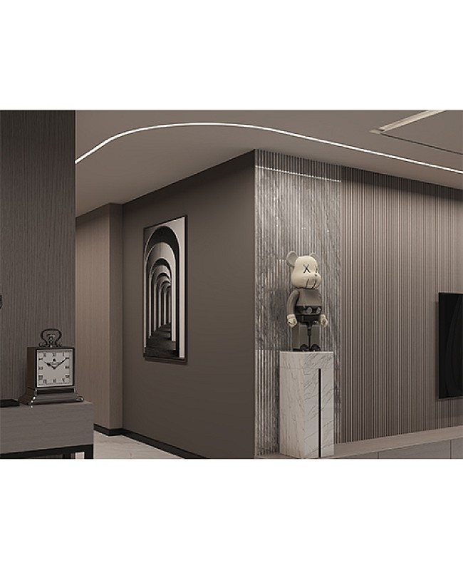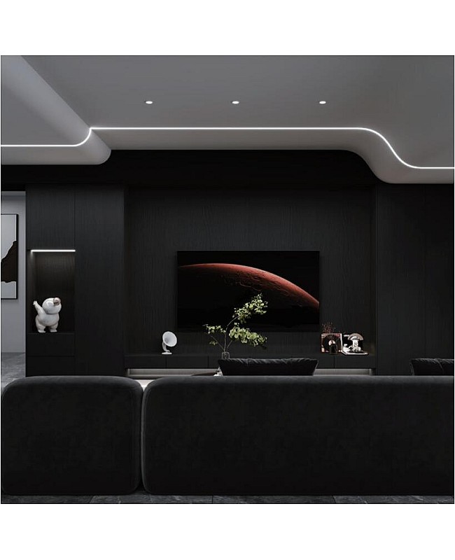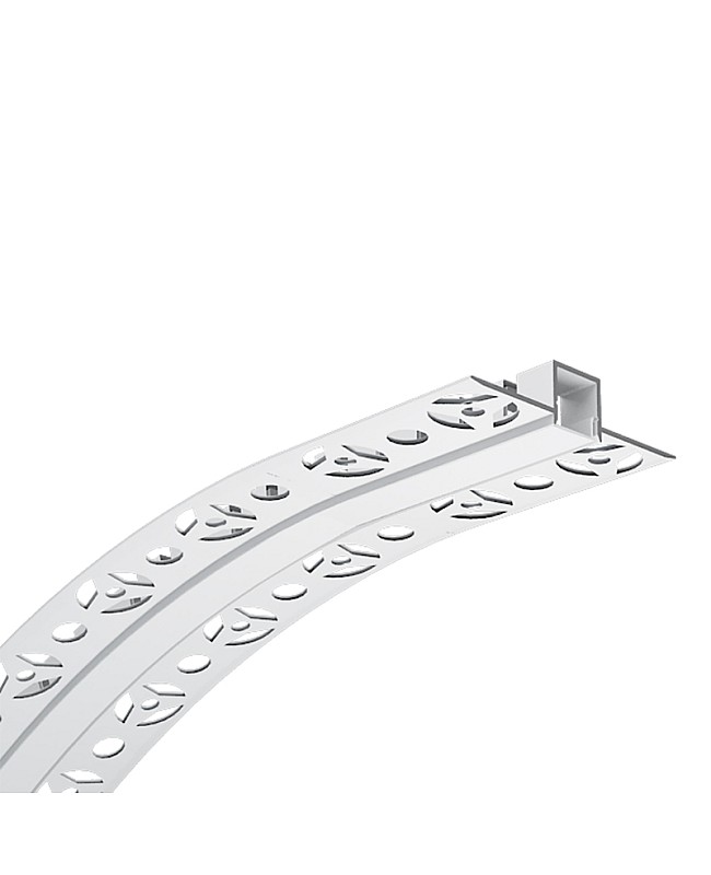 The trimless plaster-in LED profiles feature a bendable design, allowing you to choose between side-bending or up-down bending products. They are designed for seamless integration into plasterboard walls or ceilings to create smooth, curved lighting lines, offering a clean and modern aesthetic. The bending feature allows them to follow gentle arcs and creative contours, making it perfect for customizable lighting solutions for architectural and interior design projects. The bendable LED profiles are made of 6063-T5 extruded aluminum material and feature a silver anodized surface treatment for enhanced oxidation resistance and a longer lifespan. There are 1M, 2M, and 3M length products in stock, allowing you to cut to any size that suits your needs. Only one type of diffuser is available: the semi-clear diffusers, made of high-quality silicone material, will help distribute light evenly without dark areas. For the side-bending LED channels, you can install the LED strips on the side or the bottom. The max width for side mounting is 5mm, and we recommend installing 10mm S-shaped LED strips for bottom installation. The maximum width of strip lights for up-down bending light profiles is 10mm; you can install high-density COB strip lights to create a soft and uniform illumination effect. Both flanges feature small honeycomb holes designed to be embedded directly into plaster or drywall during construction, ensuring a clean and seamless look.