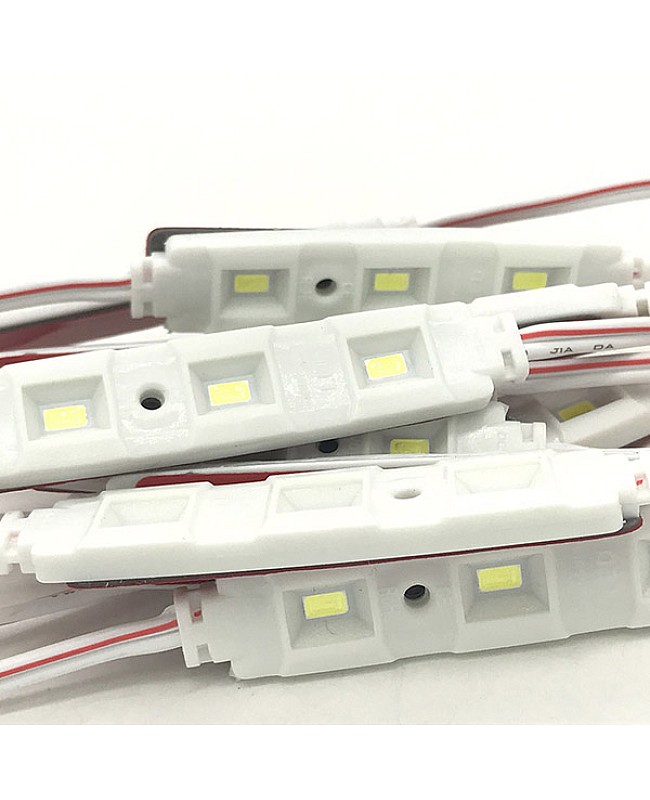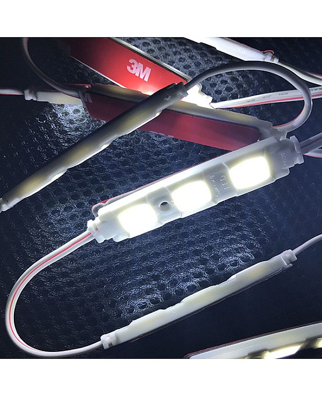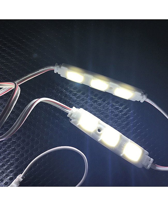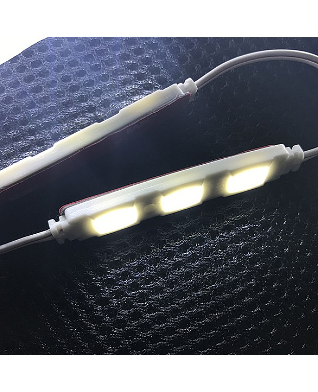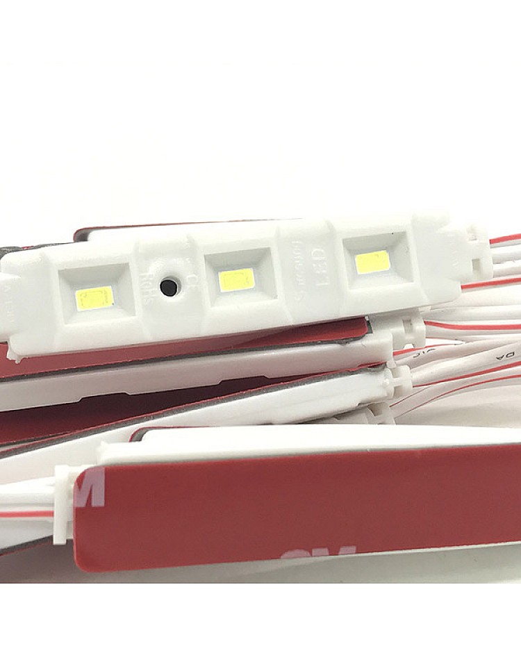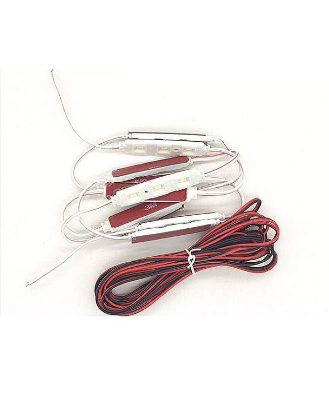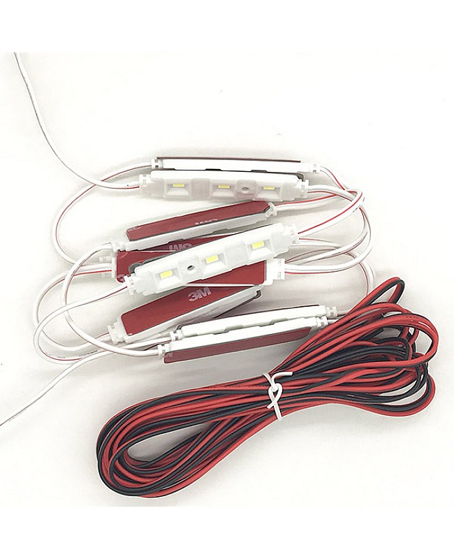 LED sign module working in DC12V, uses high-brightness 5630 Samsung SMD LEDs as light sources, 3 LEDs in each module, 10 modules per string. This style of LED module has small-sized LEDs and a slim module, stable brightness, and stable power. The LED sign module can be powered by a 12V LED power supply or a battery directly, comes with a 5-meter length wire, is widely used to decorate the interior car frames and roof lighting, and can be installed easily. It provides 3 3-year warranty.