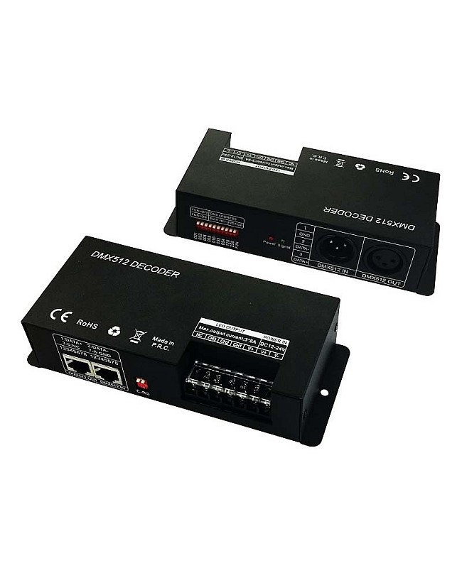The 3 CH RGB DMX decoder can accept the internationally recognized DMX512 standard signal and convert it into a PWM signal to actuate RGB LED lights. You can use it for constant voltage RGB LED lamps, LED strips, LED modules, and more. The DMX 512 decoder features a 3-output-channel design, with a maximum output current of up to 8A per channel. The maximum loading power is 576W when operating at DC 24V. The RGB decoders can be connected via a signal line through the RJ45 ports or XLR plug to continue expanding the channel, accept manual-setting addresses via DIP switches, and control the lighting effect synchronization of multiple decoders with a single DMX master controller. The RGB DMX 512 decoder can also be used as an RGB controller. There are 9 working modes, which can be changed using a DIP switch. The speed can be adjusted through a DIP switch when in static mode.