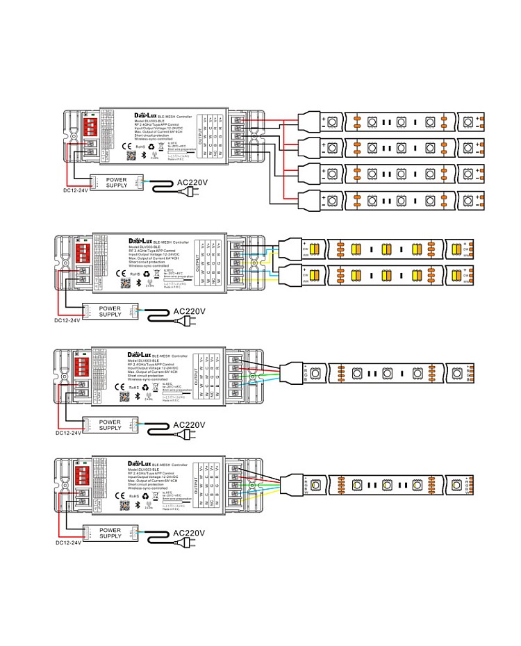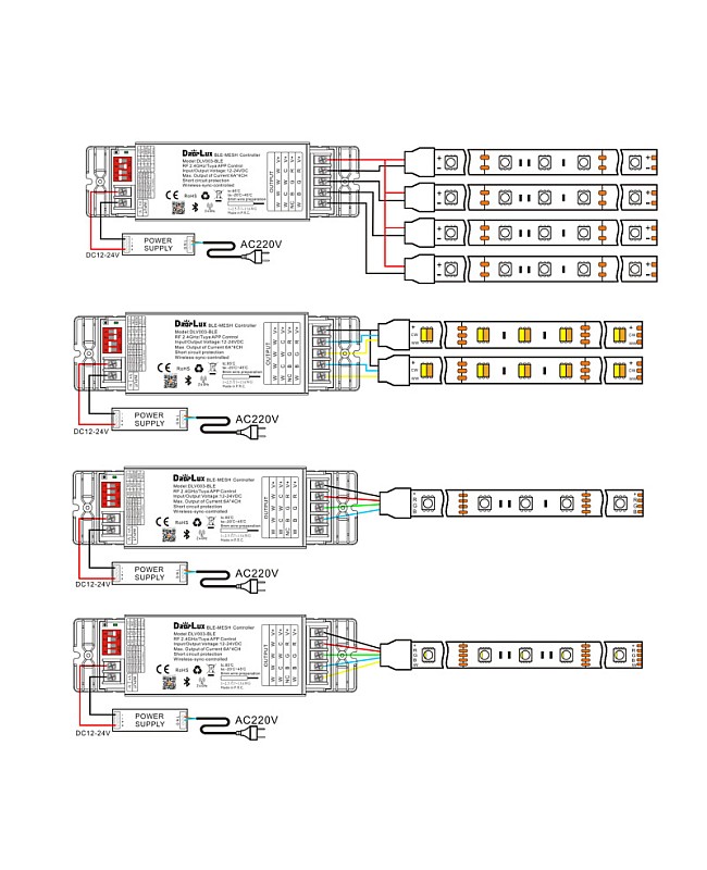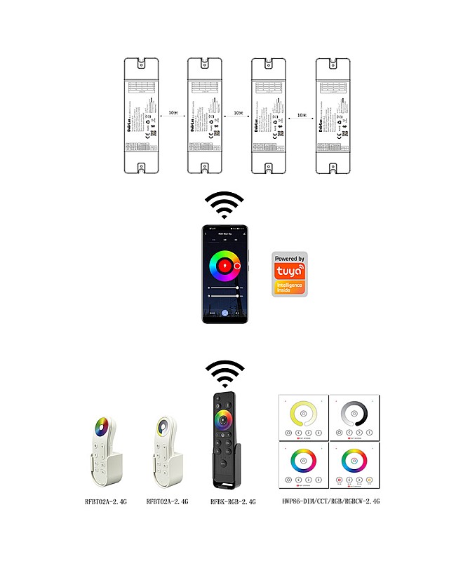 The Hoion DLV003-BLE Bluetooth 2.4G wireless RF LED controller is an excellent choice for controlling LED lighting. It has a 4 in 1 design and the most advanced PWM digital control technology. It's designed to work with various LED lighting products, including constant voltage LED lamps, point source lights, LED strips, lighting modules, string lights, etc. You can adjust the brightness, static color choices, and various dynamic changes in lighting effects through the remote. It's integrated with 4 optional programs for different color types of LEDs, which you can use for single color, dual white, RGB, and RGBW. The brightness of static color is adjustable, 1024 levels in total, and the speed of dynamic change is adjustable, 100 levels in total. There is a DIP switch on the controller, and you can dial it to choose the output mode. The working PWM frequency is adjustable from 2 kHz to 20 kHz. Tuya APP can control the Hoion controller to achieve intelligent control like group control, scene control, timer control, etc. DLV003 BLE will transmit the signals from the remote and self-inspect the work status for each other. Multiple controllers in the same zone will work wirelessly. Not only static mode but also dynamic mode.