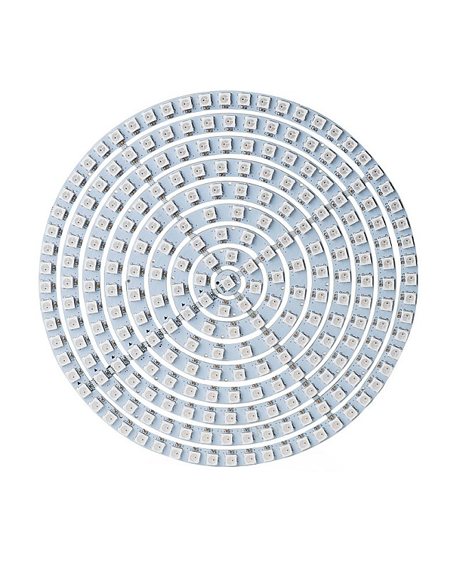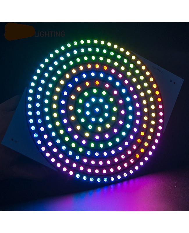 The DC5V addressable RGB matrix LED panels deliver vibrant, individually controllable lighting for custom displays and pixel-based animations. They are available in three sizes: 70mm, 110mm, and 170mm, and with 37, 93, or 241 addressable LEDs. The 5050 LEDs are integrated with WS2812B ICs, allowing every pixel to display millions of colors independently through a single data line. Compatible with SPI controllers like Arduino, ESP32, and Raspberry Pi. They can enable smooth gradients, chase effects, and dynamic visuals, ideal for creative lighting, digital signage, art installations, DIY projects, and more. The addressable LED panels do not have wires, so you must have experience soldering wires and programming. The LED power supply and LED controller are sold separately.