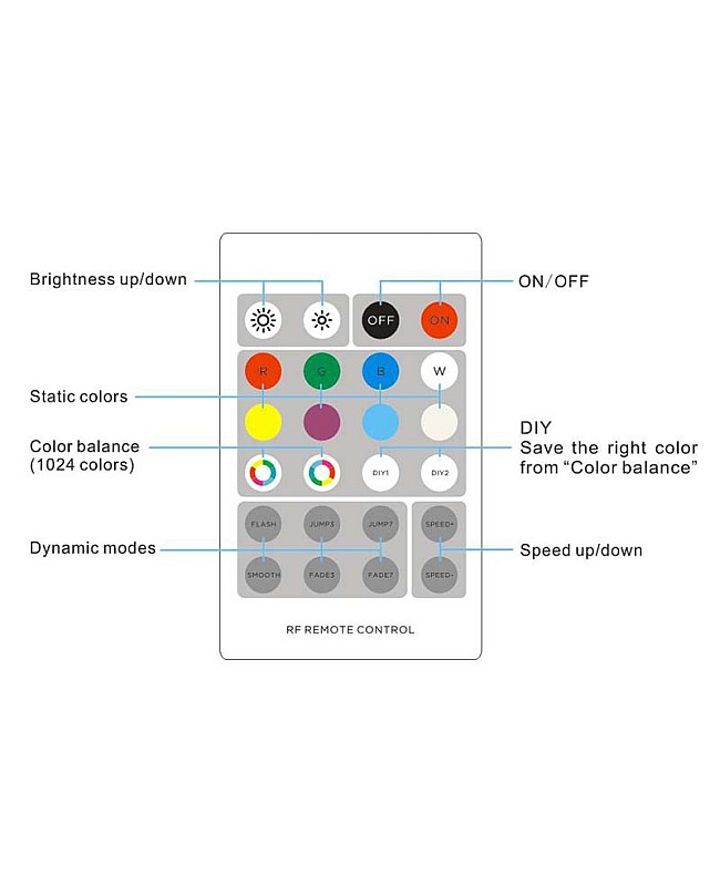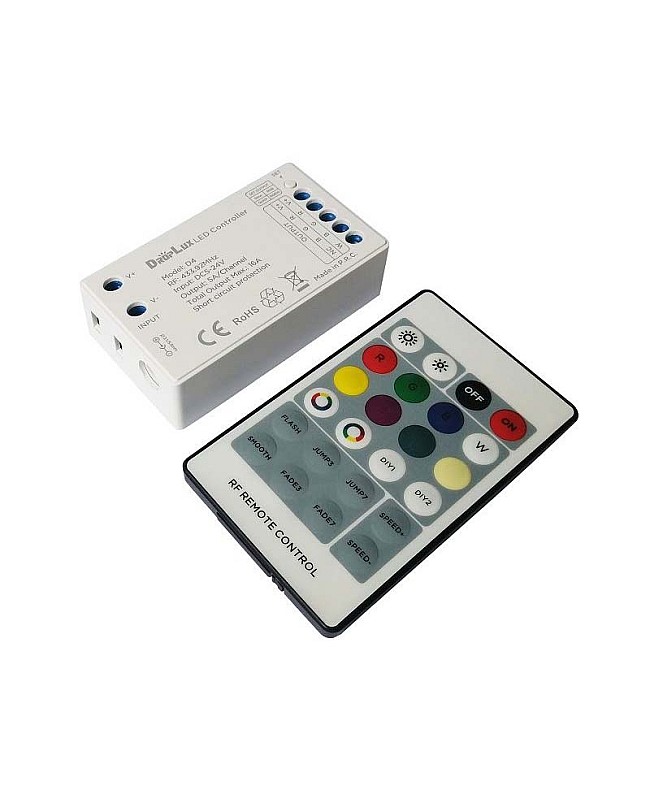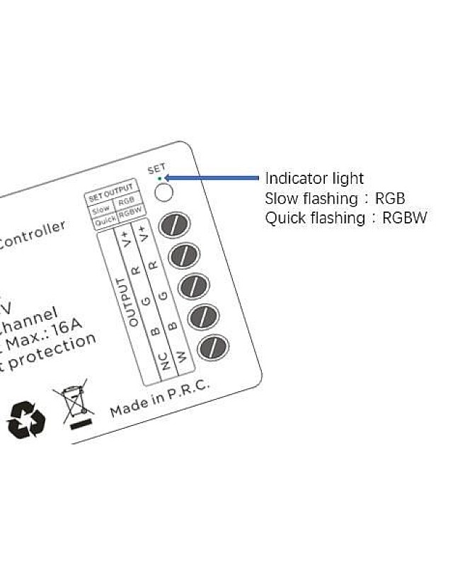 The 5V RGB controller with the 24 Keys RF remote is designed for the constant voltage LED product, and the working voltage is DC5V, DC12V, or DC24V. The LED controller designed for RGB and RGBW LED lights if works with RGB LED lights, both remote control and Receiver are 2 in 1 for RGB and RGBW, with three output channels, the max output current of each channel is 5A, the max output power up to 360W, if works with RGBW LED products, with four output channels, the max output current of each channel is 4A, the max output power up to 384W. The 2 in 1 LED light controller with the advanced micro control units, you can use to control the point source light, flexible LED strips or other LED lights, comes with the 24 Keys RF remote to control the light ON or OFF, the max control distance up to 20meters, adopts color balance key to achieve 1024 colors and can be saved as DIY modes, can adjust the brightness of static color and change the style and speed of dynamic modes. Press a set button on the LED controller to switch the output type from RGB to RGBW. The indicator light will show you the working status. The indicator flashes slowly, which means it works in RGB mode; if it flashes quickly, it works in RGBW mode.