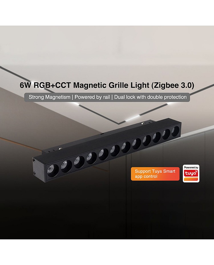 The MiBoxer Zigbee magnetic grille lights is a unique solution that provides RGB and CCT(Color Temperature) lighting effects. It's powered by rail, with strong magnetism, a dual lock with double protection, and can move randomly on the rail. The grille lights use high-quality LEDs as the light source, and the surface has a high-quality lens for a large view angle and smooth light output. The back is made with a high-quality aluminum shell for better heat dissipation, allowing LED lights a longer lifespan. It is designed with Zigbee 3.0 technology, allowing easy, wireless light control from any compatible device. The RGB+CCT grille lamps can be controlled by remote control, a smartphone APP, and support third-party voice control after adding a Zigbee gateway, which can work with Amazon Alexa and Google Assistant. Can enter into Philips Hue, IKEA TRADFRI, Amazon Echo Plus, and Echo series standard Zigbee 3.0 gateways, and can control ON/OFF, brightness, and colors. There are 16 million colors available, color temp adjustable from 2700K to 6500K, and brightness and saturation adjustable for various scenes. You can download the APPs " Tuya Smart " or " MiBoxer Smart “ to achieve further functions like music rhythm, timing, scene customization, device sharing, sleep/wakeup plan, etc.