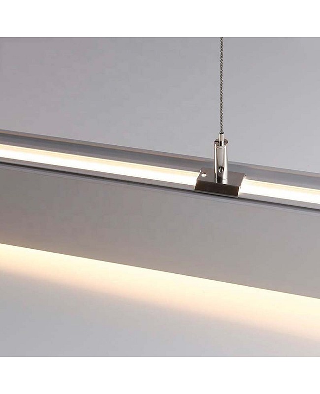 3 3-inch pendant aluminum light channels are perfect for residential, commercial, and industrial applications, with an up-and-down design for illuminating any space. The inner width of the upside is 18.5mm and the downside is 53.68mm, recommend adding the high-density COB LED strip lights as the light source to create an even, seamless lighting effect, without light spots and dark areas. The aluminum channels are made of 6063-T5 aluminum material with silver anodized surface treatment, anti-oxidation resistance, durability, and long-lasting. Only one type of diffuser is available: the PC frosted opal cover, which is made of brand material with stable quality, perfect lighting distribution, and even output light. End caps, metal clips, and suspension wire kits are included, making it easy to install on the ceiling to create a unique look in any area.