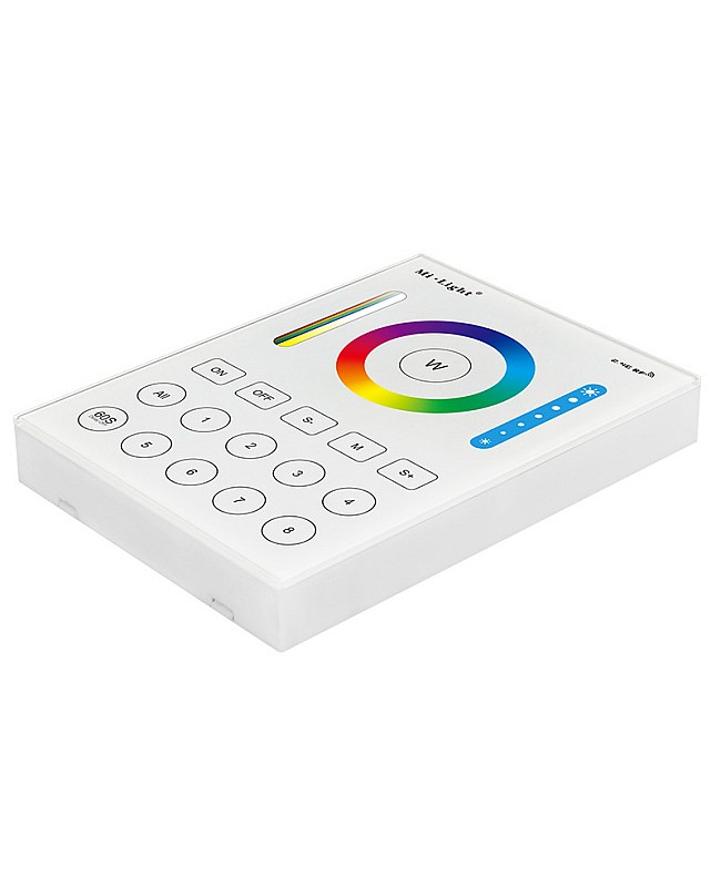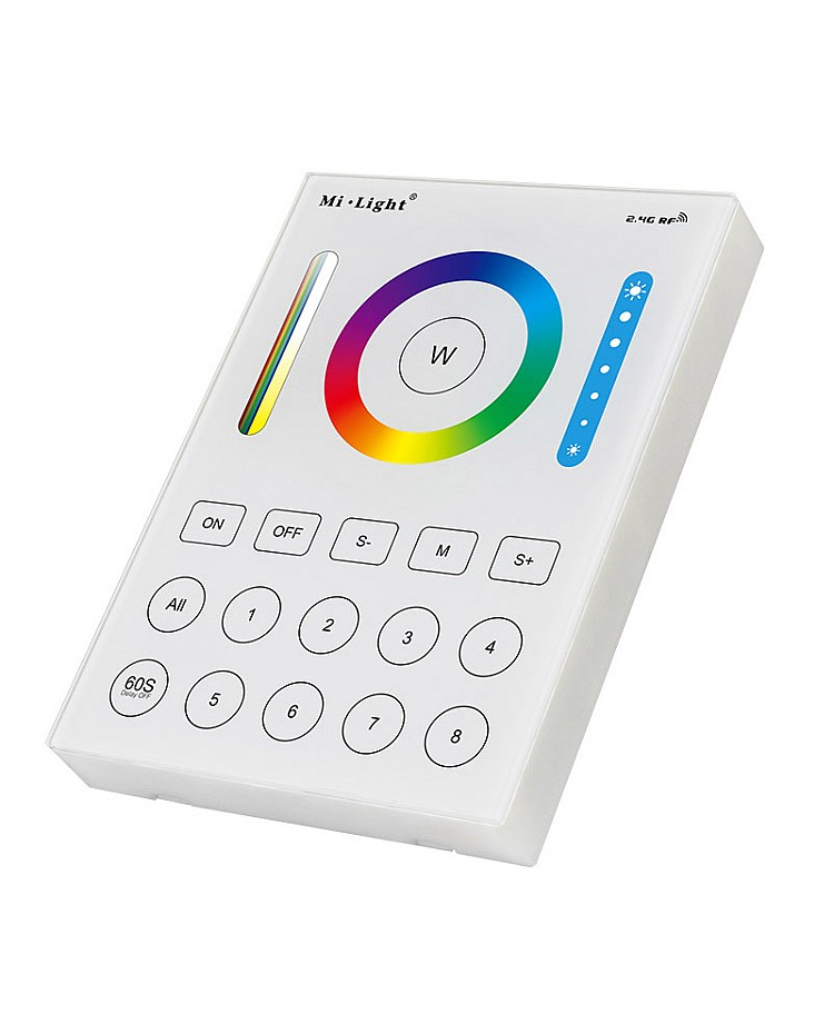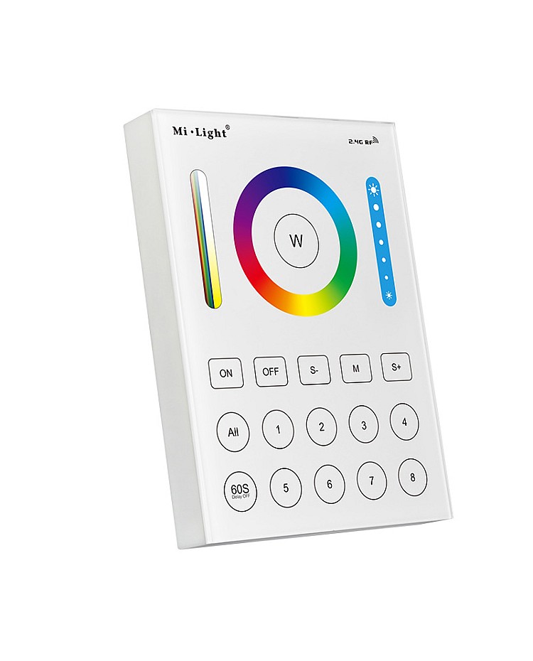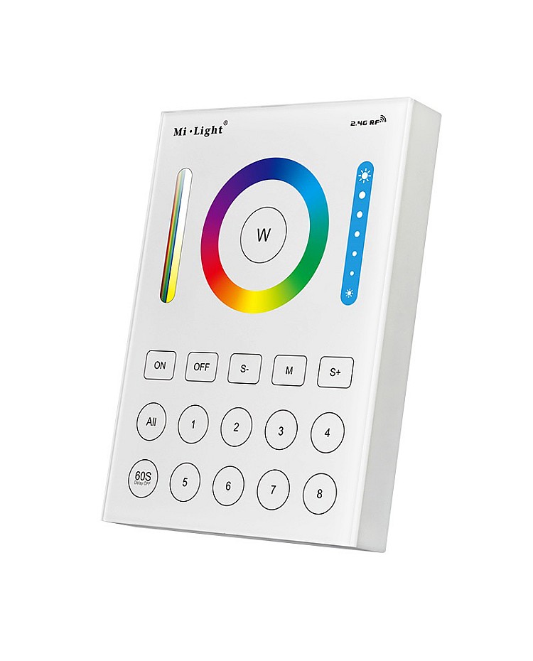 The MiBoxer B8 smart panel remote control has an 8-zone design. You can control the zones individually or all at once, and each zone can control limitless LED lights or controllers. The Milight B8 has a sensitive touch panel design; touch the panel to finish the operation. There are 16 million colors and dynamic modes available, and you can set it to your favorite color or mode to meet the different scenes. Color temperature and brightness are adjustable, and you can use the MiBoxer smart remote control to control the RGB+CCT products, Milight LED bulbs, floodlights, and 5 in 1 LED controllers. Adopts 2.4G wireless technology, with a longer signal transmitting distance. With the delay-off light function, the LED light will turn off automatically after 60 seconds after you touch the 60S button.