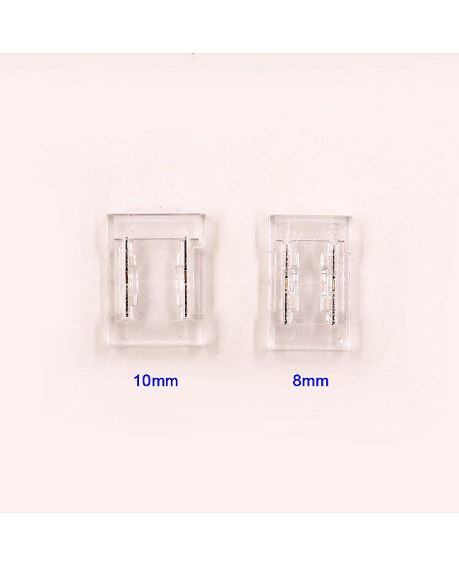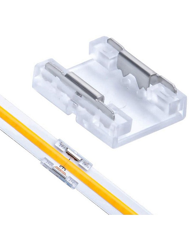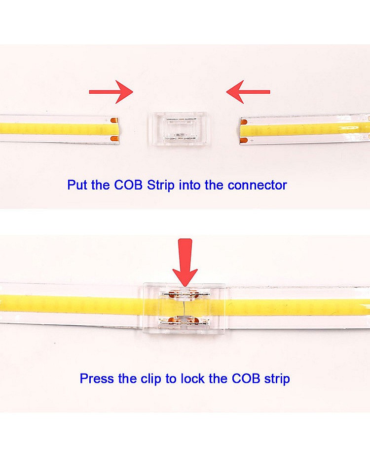 The 2P solderless COB LED connectors with 2P connectors are designed for single-color COB strip lights. You can choose the 5mm, 8mm, or 10mm products for various-width LED strips. The LED connectors are solderless and easy to install and use. Push the strips into the connector and press the clips to lock the COB strip lights, then you can try to light them up.