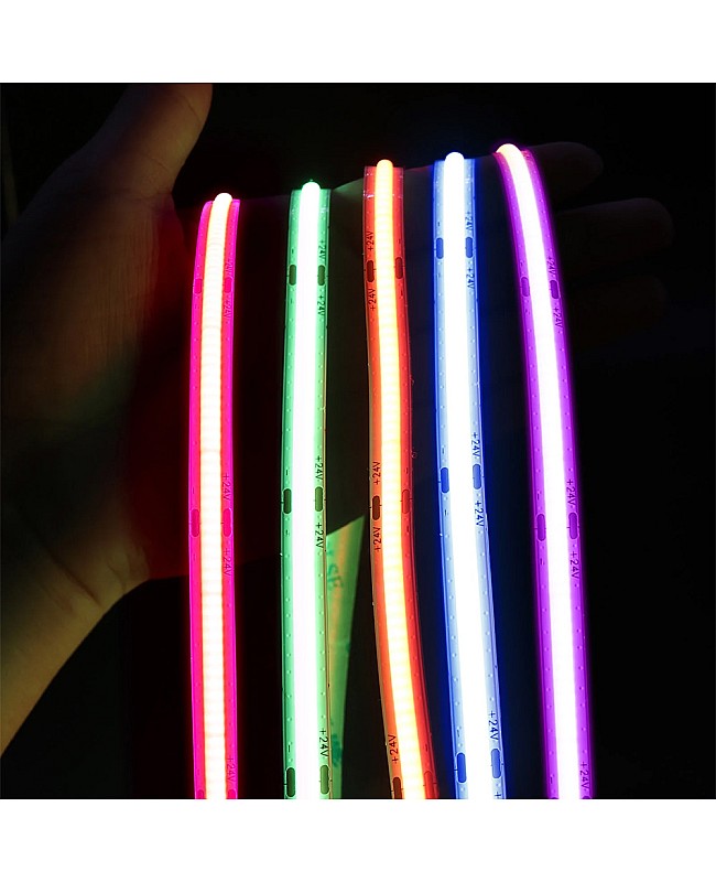 The COB LED strips utilize advanced chip-on-board (COB) technology, providing ultra-smooth, uniform illumination without visible light dots. They are ideal for applications where seamless, professional-grade lighting is needed in residential and commercial settings. They use 1022 chips as the light source and 480 LEDs per meter for high-density, vibrant lighting. There are various emitting color products available, including warm white, white, and cool white. 12V and 24V products are optional. They work with LED dimmers to adjust the brightness. The dotless LED strip is cuttable; the minimum cutting length of the 12V version is 25mm, and the 24V versions can be cut every 50mm. There are two levels of waterproof products available: IP20, which is non-waterproof, and IP67 silicone tube waterproof. The IP20 is not waterproof and should only be used in dry environments. The IP67 waterproof COB strip lights are suitable for use in wet environments and outdoors. The back of the IP20 ones has double-sided adhesive tape for quick mounting. The IP67 silicone tube LED COB strips can be mounted with silicone clips. You can connect the Mean Well dimmable power supply to light up and adjust the brightness conveniently. The color rendering index can reach 90, making it ideal for various indoor and outdoor linear lighting projects, with excellent efficiency and color consistency, to provide an incredibly bright and comfortable visual experience.