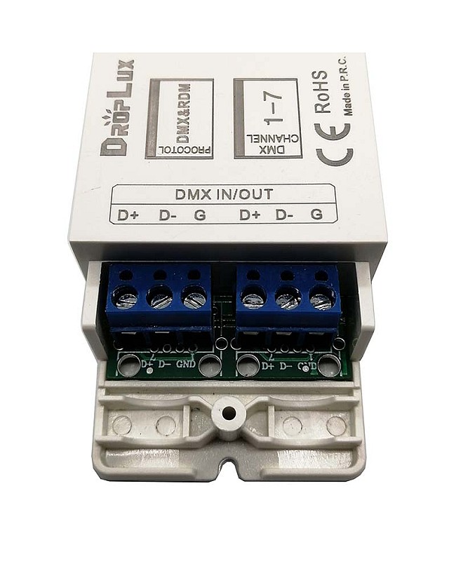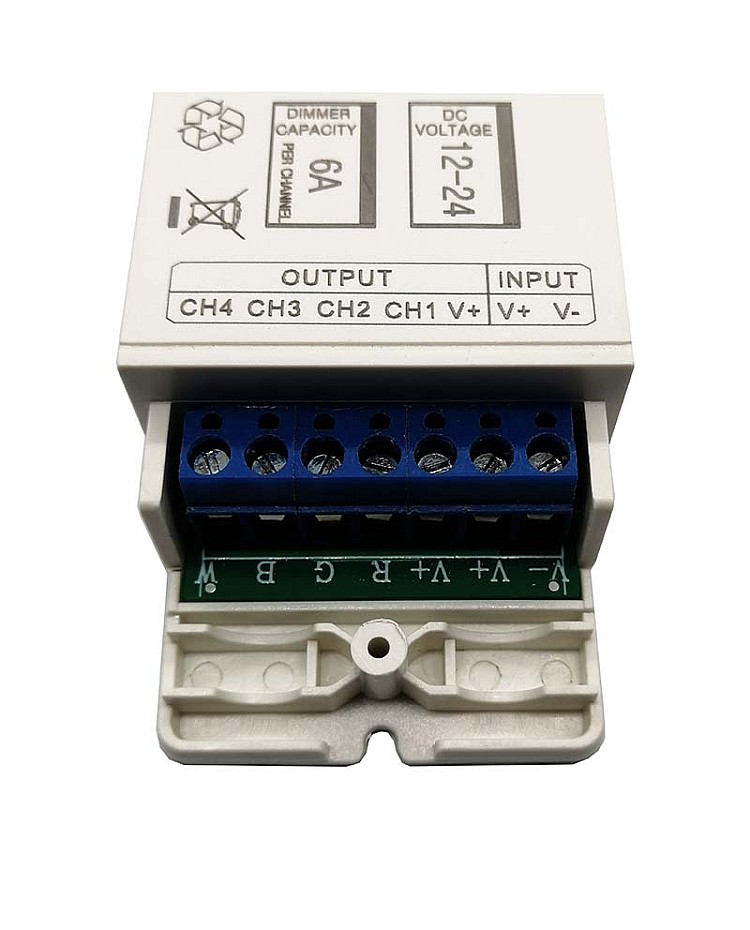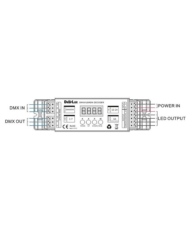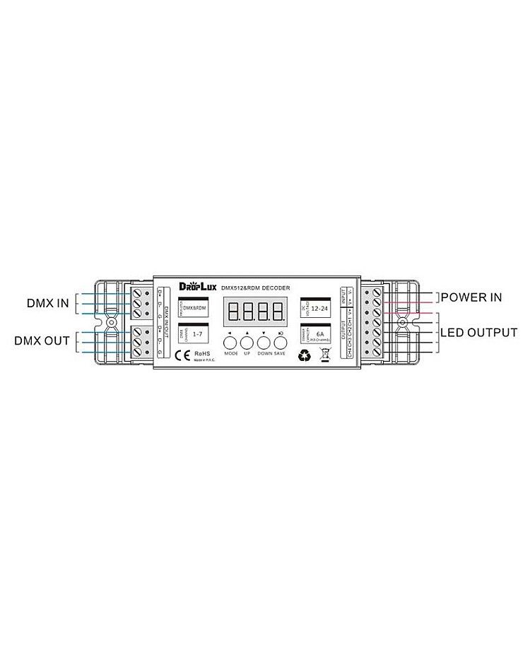 The RDA DMX 512 decoder is designed for all kinds of constant voltage LED lights, with a working voltage range from DC12V to DC24V, featuring a 4-in-1 output type design that supports single color, CCT, RGB, and RGBW. It adopts push buttons(Mode, Up, Down, and Save) to change the setting conveniently, with the 4-digit tube displaying the setting status intuitively. The DMX decoder will identify the signal function automatically. When receiving the DMX signal, it will directly jump to the DMX setting start address mode(dxxx) to receive data. 9 different DMX512 decoding profiles are available from CH01 to CH09. The PWM frequency and Gamma Curve are adjustable, and the power-off memory function will remember the settings saved in the last power-off. The DMX decoders have a 4-output-channel design.