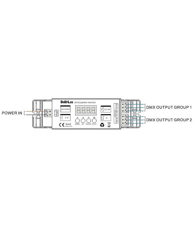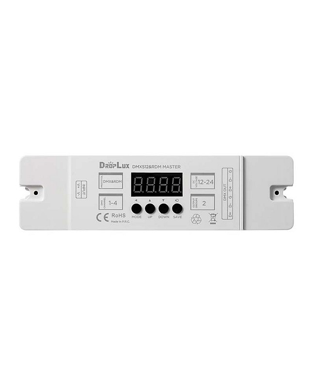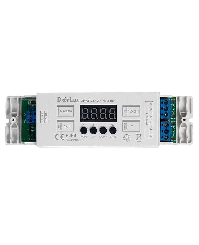 The DMX 512 controller supports DMX512 and RDM protocols, will transmit the DMX or RDM signals to the DMX or RDM decoders, with 4 in 1 functions for single color, CCT, RGB, and RGBW. You can choose the various dynamic modes and adjust the brightness or speed, identify the number of devices, and change the device address through the RDM function of the DMX512 controller. The LED master controller works in DC12V or DC24V, with two groups of output signals with the same control effect. adopts the pushbuttons Mode, Up, Down, and Save to make settings and control, the 4-digit tube displays the setting status intuitively. The DMX controller supports DMX/RDM decoders up to 128 pieces.