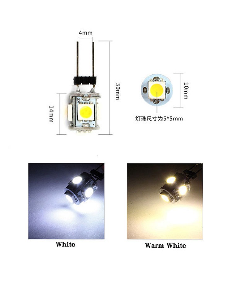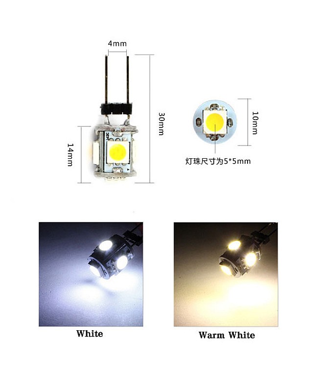 G4 5050 car interior LED lights, use 5pcs high quality 5050 SMD LEDs as light source, working in DC12V, can be installed in your car directly, warm white and white colors available. suit for car, truck, boat, RV, longer lifespan, low power consumption, energy-saving. no shadow.