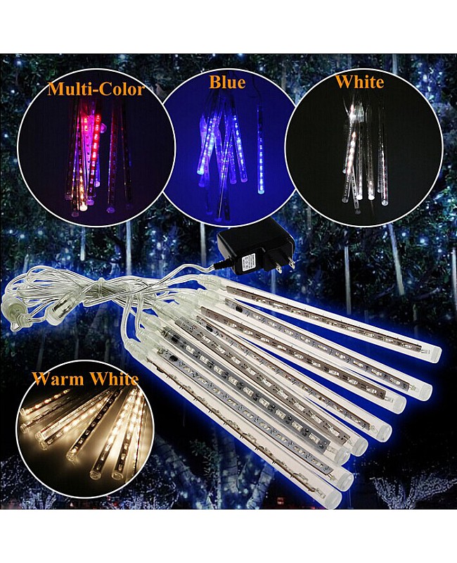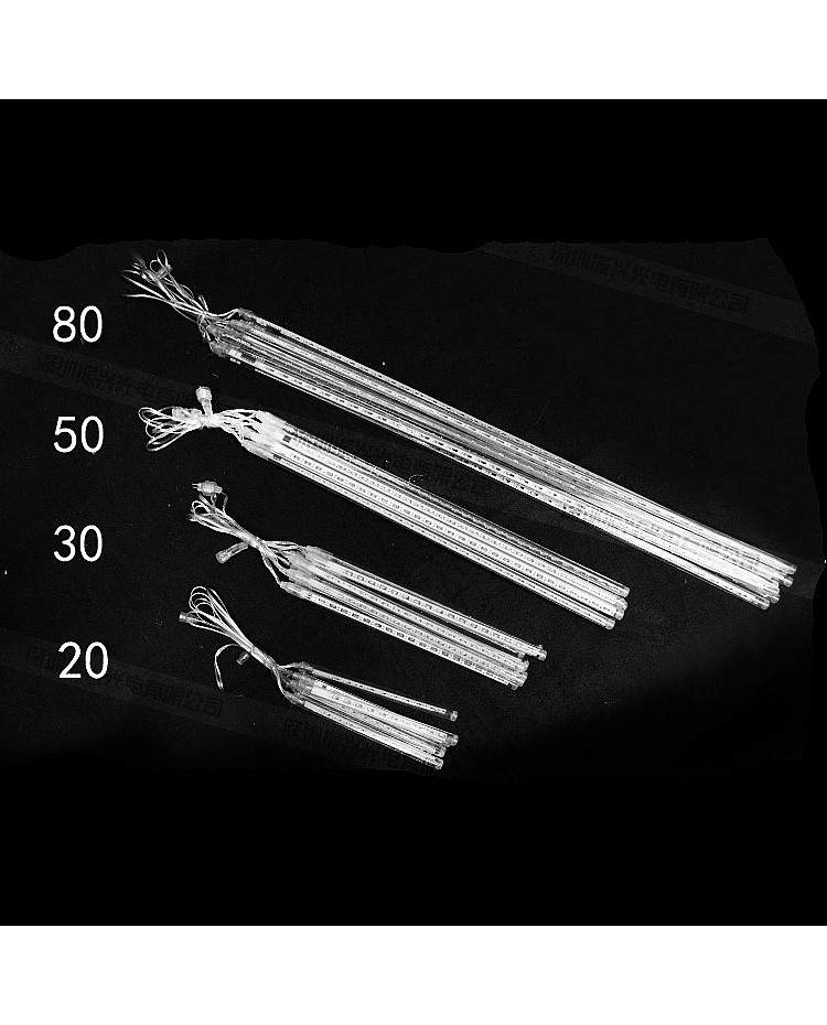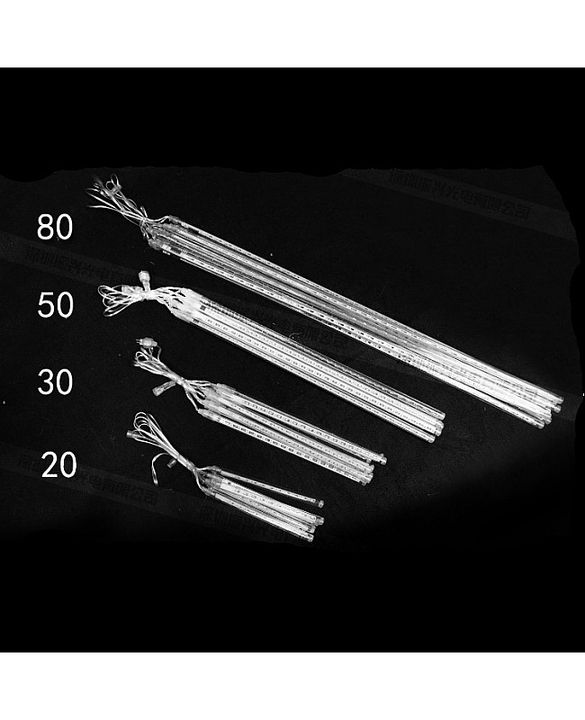 The LED meteor shower rain lights use high-quality LEDs as the light source. They come with an LED adapter, can connect directly to your home power system, and the output is only DC12V. You can choose the EU or US power plug. Each set of LED meteor lights includes 8 pieces of LED Tubes; the tubes' length can be 30cm or 50cm. The top of the tube with the hanging hole is easy to fix or assemble. The tubes have been disposed of with waterproof glue at the top and bottom, which can reach an IP67 waterproof level for outdoor use. Various emitting colors are available.