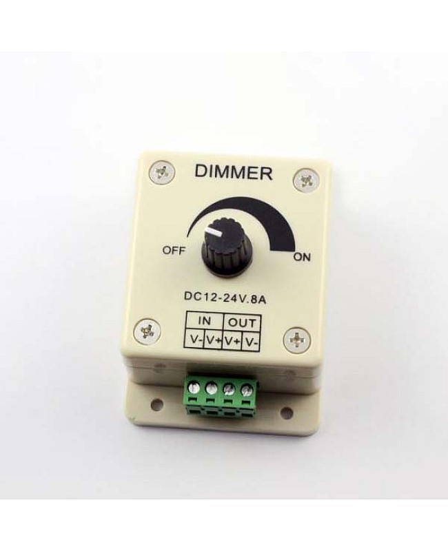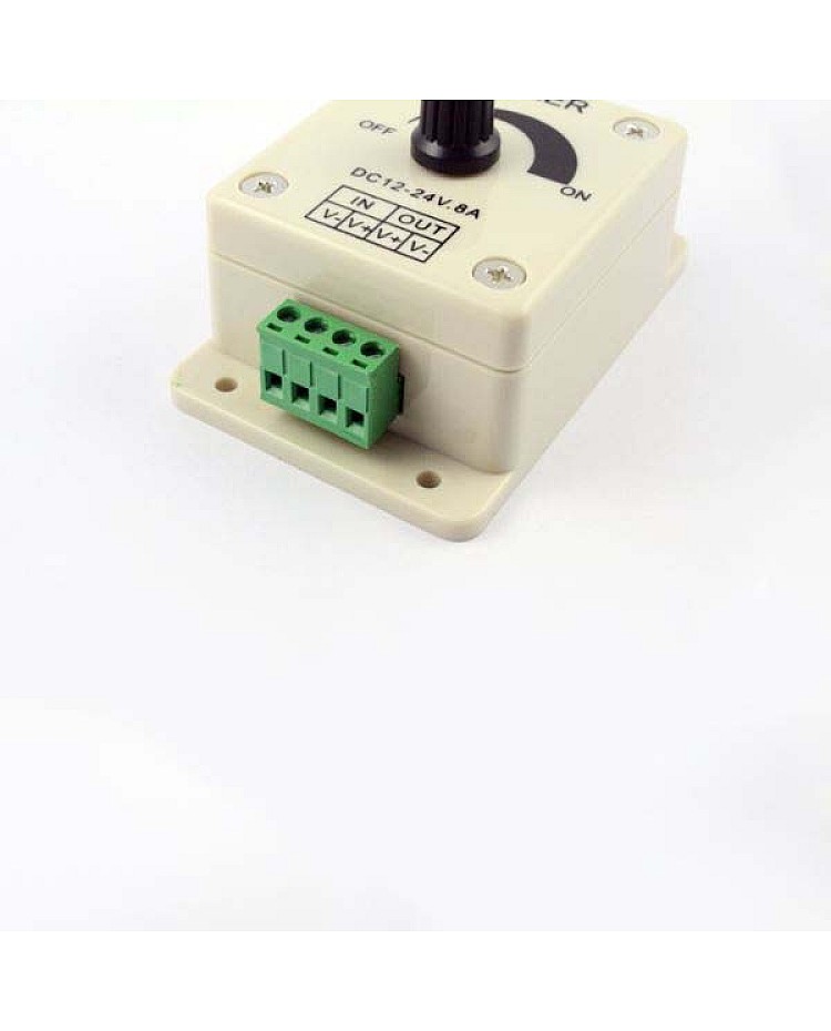 The single color LED strip dimmer can achieve stepless dimming, and adopts the knob control switch to adjust the brightness easily. With one output channel design, the max loading power is up to 192W when working on DC24V. LED strip light dimmer with male and female connectors with screws, easy to connect to the single color LED strips. With a knob switch to adjust the brightness. Rotate the button to the right; the brightness will be brighter when you rotate it to the far right. Rotate the button to the left, and the brightness will be darker. The light will be turned off when you rotate it to the far left.