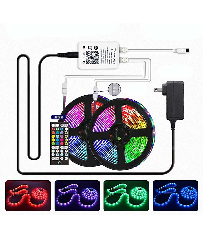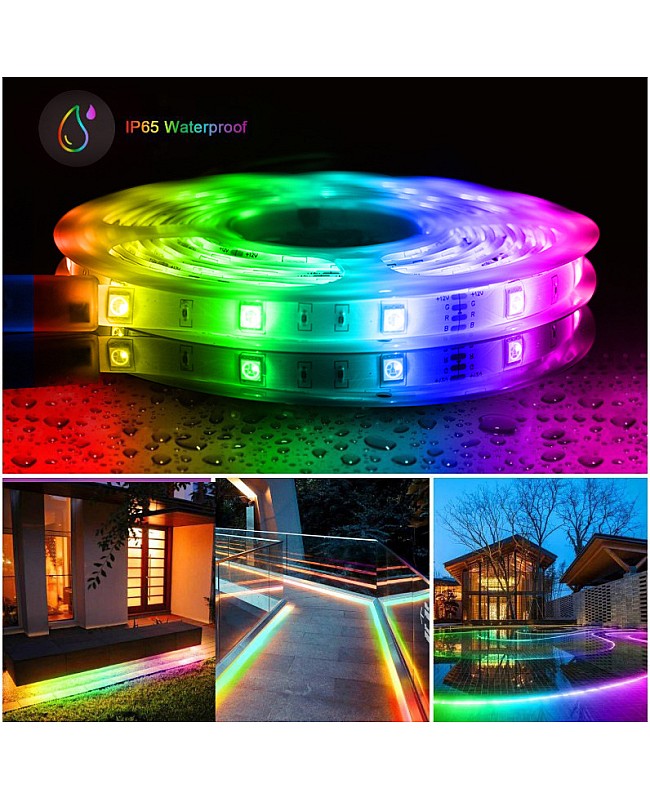 The RGB LED strip lights sync with music, use high-quality 5050 SMD LEDs as the light source, with 30 LEDs per meter. The SMD LEDs are mounted on a dual-layer PCB board, which is flexible and durable. The LED strip light has 5 meters per reel, you can choose the kit includes 1 to 4 reels LED Strips, there are two different waterproof kits available, the IP20 non-waterproof and IP65 waterproof, the LED controller included, you can connect it to the LED strips and LED power supply, you can use the IR remote and Mobile APP through the WiFi to control the dynamic modes changing or adjust the brightness of the static color of the RGB LED strips when you active the music modes, the color of LED strip will change automatically follow the music, you can use them in home, restaurant, bar, hotel, shop, etc. recommend the IP 20 LED strips works in indoor non-waterproof only, recommend the IP65 waterproof in the waterproof that not with much water and wet place. The back has double-sided tape, which is easy to install and maintain. The flexible LED strips are cuttable and reconnectable; you can cut them to the length you want and reconnect them for the project.